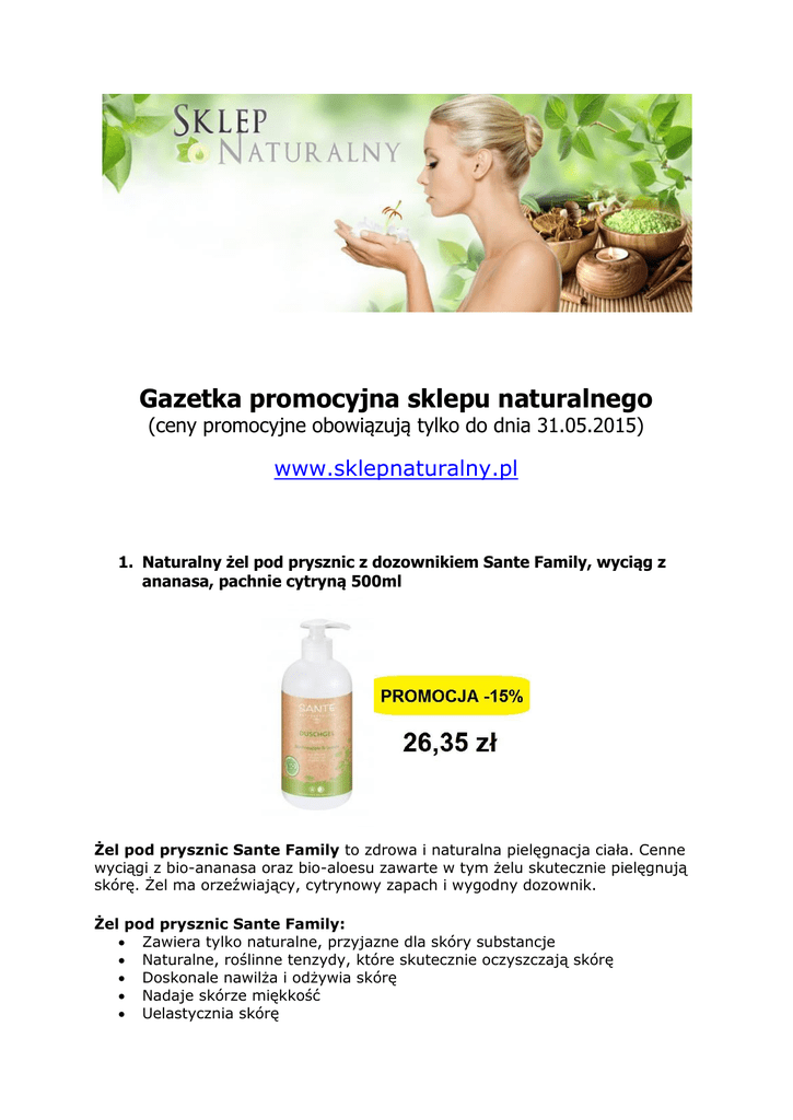 Gazetka promocyjna sklepu naturalnego (ceny promocyjne obowiązują tylko do dnia 31.05.2015) www.sklepnaturalny.pl 1. Naturalny żel pod prysznic z dozownikiem Sante Family, wyciąg z ananasa, pachnie cytryną 500ml Żel pod prysznic Sante Family to zdrowa i naturalna pielęgnacja ciała. Cenne wyciągi z bio-ananasa oraz bio-aloesu zawarte w tym żelu skutecznie pielęgnują skórę. Żel ma orzeźwiający, cytrynowy zapach i wygodny dozownik. Żel pod prysznic Sante Family: Zawiera tylko naturalne, przyjazne dla skóry substancje Naturalne, roślinne tenzydy, które skutecznie oczyszczają skórę Doskonale nawilża i odżywia skórę Nadaje skórze miękkość Uelastycznia skórę Działa przeciwzapalnie Likwiduje drobne podrażnienia naskórka Orzeźwiający zapach cytryny Więcej informacji o naturalnym żelu pod prysznic Sante Family znajdziesz TUTAJ 2. Ekologiczny Szampon Sante Lava Power z glinką wulkaniczną, łagodnie oczyszcza włosy 200ml Szampon Sante Lava Power zawiera glinkę wulkaniczną, która szczególnie łagodnie oczyszcza włosy i powiększa ich objętość. Ten kosmetyk idealnie nadaje się do delikatnych włosów. Szampon działa również przeciwłupieżowo. Szampon Sante Lava Power: Zawiera tylko naturalne, przyjazne dla włosów i skóry głowy substancje Łagodnie oczyszcza włosy Powiększa objętość włosów i poprawia ich elastyczność Wspomaga utrzymanie prawidłowej równowagi skóry głowy Przeciwdziała tworzeniu się łupieżu Poprawia ukrwienie skóry głowy Pomaga w odtruwaniu organizmu Działa przeciwzapalnie Więcej informacji o ekologicznym szamponie Sante Lava Power z glinką wulkaniczną znajdziesz TUTAJ 3. Naturalna bio emulsja rumiankowa do higieny intymnej Provida 150ml Emulsja rumiankowa do higieny intymnej Provida to naturalny kosmetyk stworzony specjalnie pod potrzeby kobiet. Unikalna mieszanka substancji aktywnych oraz optymalna wartość pH sprawiają, że pielęgnacja zewnętrznych stref intymnych staje się delikatna i przyjemna. Emulsja rumiankowa do higieny intymnej Provida: Zawiera tylko naturalne substancje Delikatna i przyjemna pielęgnacja zewnętrznych stref intymnych Działa dezodorująco i lekko natłuszcza Nie ogranicza naturalnej flory bakteryjnej Kosmetyk ma optymalną dla okolic intymnych wartość pH Przynosi skórze prawdziwe ukojenie Odpowiednio nawilża i odżywia Zapewnia skórze świeżość i sprężystość Działa przeciwzapalnie i przeciwalergicznie Więcej informacji o naturalnej bio emulsji rumiankowej do higieny intymnej Provida znajdziesz TUTAJ 4. Naturalny dezodorant w kulce Sante Kristall Deo Roll-on, nieszkodliwy dla zdrowia 50ml Dezodorant w kulce Sante Kristall Deo Roll-on nie zawiera szkodliwych substancji. Kosmetyk ten nie zatyka porów i nie blokuje gruczołów potowych, naturalnie wspomaga funkcje skóry likwidując nieprzyjemny zapach potu. Dezodorant w kulce Sante Kristall Deo Roll-on: Zawiera tylko naturalne, nieszkodliwe dla organizmu substancje Nie zawiera alkoholu (może być stosowany do wrażliwej skóry) Likwiduje nieprzyjemny zapach potu Nie blokuje gruczołów potowych Nie zatyka porów Zapewnia świeżość przez cały dzień Ogranicza nadpotliwość Działa antybakteryjnie Nie zostawia śladów na ubraniu Więcej informacji o naturalnym dezodorancie w kulce Sante Kristall Deo Roll-on znajdziesz TUTAJ 5. Organiczna pasta do zębów bez fluoru Sante w formie żelu z witaminą B12, idealna dla wegan 75ml Pasta do zębów bez fluoru Sante oprócz czyszczenia zębów i pielęgnacji jamy ustnej dostarcza organizmowi bardzo ważną witaminę B12. Pasta nie zawiera absolutnie żadnych szkodliwych substancji i może być spokojnie stosowana przez osoby przyjmujące leki homeopatyczne. Pasta do zębów bez fluoru Sante: Zawiera tylko naturalne substancje Naturalnie czyści zęby (poprzez mineralne środki czyszczące) Przeciwdziała próchnicy (poprzez specjalny Bio-Kompleks) Pielęgnuje jamę ustną Usuwa kamień i bakterie Nie zawiera szkodliwego fluoru Nie zawiera olejku miętowego Bez barwników, bez konserwantów Idealna dla wegan Więcej informacji o organicznej paście do zębów bez fluoru Sante z witaminą B12 znajdziesz TUTAJ 6. Naturalny krem na dzień AnneMarie Borlind Rosentau z wodą różaną i awokado, silnie nawilża 50ml Krem na dzień AnneMarie Borlind Rosentau to bardzo silnie nawilżający kosmetyk naturalny. To starannie dobrana kompozycja z wodą różaną, awokado i unikalną kompozycją ekstraktów z ziół i olei roślinnych, która intensywnie nawilża i nadaje cerze widoczną świeżość. Krem na dzień AnneMarie Borlind Rosentau: Zawiera tylko naturalne substancje Bardzo intensywnie nawilża skórę Mobilizuje skórę do tworzenia własnych zasobów wilgoci Zabezpiecza skórę na cały dzień Zapobiega przedwczesnemu starzeniu się skóry Nadaje cerze świeży wygląd na cały dzień Wyraźnie odpręża skórę Idealnie nadaje się jako podkład pod makijaż Więcej informacji o naturalnym kremie na dzień AnneMarie Borlind Rosentau znajdziesz TUTAJ 7. Krem na dzień do cery wrażliwej Heliotrop Sensitive, ulga dla nawet bardzo wrażliwej skóry 50ml Krem na dzień Heliotrop Sensitive to kosmetyk naturalny bardzo skutecznie pielęgnujący cerę wrażliwą. Stosując ten krem znikają problemy ze szczypaniem, pieczeniem, swędzeniem, nadwrażliwością skóry. Krem przywraca naskórkowi prawidłowe cechy ochronne i odpowiednie nawilżenie. Krem na dzień Heliotrop Sensitive: Zawiera tylko naturalne substancje, przyjazne wrażliwej skórze Skutecznie nawilża wrażliwą skórę Przywraca naskórkowi prawidłowe funkcje ochronne Odżywia i regeneruje skórę Wygładza i redukuje zmarszczki Łagodzi podrażniania Działa przeciwzapalnie Zmniejsza nadwrażliwość skóry Więcej informacji o kremie na dzień do cery wrażliwej Heliotrop Sensitive znajdziesz TUTAJ 8. Silnie nawilżający krem na noc AnneMarie Borlind LL Regeneration, regeneruje komórki skóry 50ml Kre