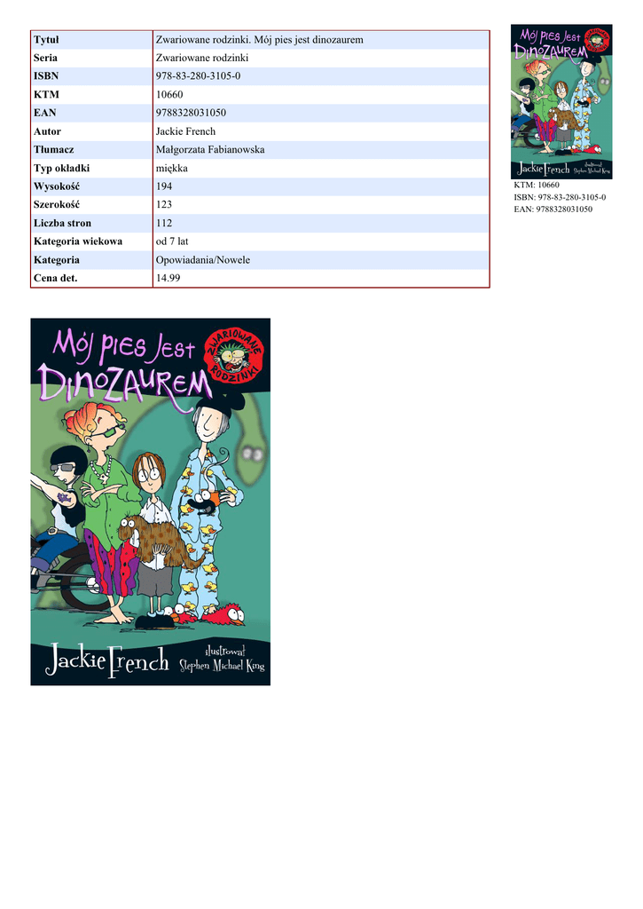 Tytuł Zwariowane rodzinki. Mój pies jest dinozaurem Seria Zwariowane rodzinki ISBN 978-83-280-3105-0 KTM 10660 EAN 9788328031050 Autor Jackie French Tłumacz Małgorzata Fabianowska Typ okładki miękka Wysokość 194 Szerokość 123 Liczba stron 112 Kategoria wiekowa od 7 lat Kategoria Opowiadania/Nowele Cena det. 14.99 KTM: 10660 ISBN: 978-83-280-3105-0 EAN: 9788328031050