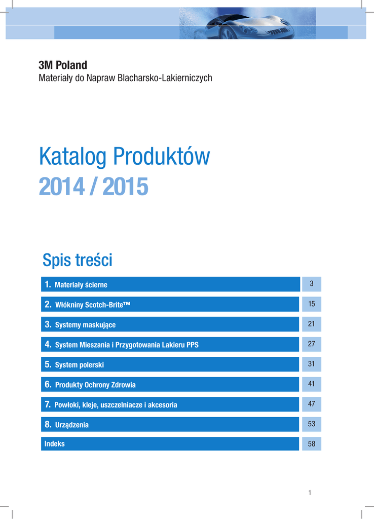 Inhaltsverzeichnis 3M Poland Materiały do Napraw Blacharsko-Lakierniczych Katalog Produktów 2014 / 2015 Spis treści 1. Materiały ścierne 3 2. Włókniny Scotch-Brite™ 15 3. Systemy maskujące 21 4. System Mieszania i Przygotowania Lakieru PPS 27 5. System polerski 31 6. Produkty Ochrony Zdrowia 41 7. Powłoki, kleje, uszczelniacze i akcesoria 47 8. Urządzenia 53 Indeks 58 1 2 Materiały ścierne Inhaltsverzeichnis 1. Materiały ścierne Materiały do Napraw Blacharsko-Lakierniczych 3M Materiały ścierne odgrywają zasadniczą rolę na każdym etapie procesów naprawczych w warsztatach samochodowych od przygotowania powierzchni aż po jej wykończenie. W oparciu o innowacyjne technologie, firma 3M wprowadziła kompletną linię materiałów ściernych dostosowanych do wszystkich rodzajów aplikacji, zapewniając równomierne, jednolite wykończenie. Dzięki różnorodności asortymentowej materiały ścierne 3M dostępne są w szerokiej gamie rozmiarów i gradacji mogą być stosowane do prac zarówno na małych, trudno dostępnych powierzchniach jak również do usuwania twardych powłok lakierniczych, gwarantując perfekcyjne wykończenie. 3 Materiały ścierne Wielootworowe fioletowe krążki na rzep Hookit™ Purple + 734U/ 334U Nasza przełomowa technologia (spiralne położenie otworów) maksymalizuje powierzchnię krążka nie pogarszając właściwości ściernych - tworzący się wir wciąga i kieruje cząsteczki pyłu do odkurzacza Numer Opis 50524 50525 50526 50527 50528 50529 50530 50531 50532 50533 50534 50913 Krążki Hookit Purple +, 150 mm, 51-otworowe P80 Krążki Hookit Purple +, 150 mm, 51-otworowe P120 Krążki Hookit Purple +, 150 mm, 51-otworowe P150 Krążki Hookit Purple +, 150 mm, 51-otworowe P180 Krążki Hookit Purple +, 150 mm, 177-otworowe P220 Krążki Hookit Purple +, 150 mm, 177-otworowe P240 Krążki Hookit Purple +, 150 mm, 177-otworowe P280 Krążki Hookit Purple +, 150 mm, 177-otworowe P320 Krążki Hookit Purple +, 150 mm, 177-otworowe P360 Krążki Hookit Purple +, 150 mm, 177-otworowe P400 Krążki Hookit Purple +, 150 mm, 177-otworowe P500 Krążki Hookit Purple+, 150 mm, 177- otworowe P600 Nowe wielootworowe krążki ścierne Cubitron™ II Nowe wielootworowe krążki ścierne Cubitron ™ II to maksymalna wydajność i szybkość szlifowania. Dzięki zastosowaniu ziarna ceramicznego w kształcie trójkątnym otrzymaliśmy jednakowe, szybsze szlifowanie o zwiększonej trwałości krążka nawet o dwa razy. Numer Opis 51221 51222 Wielootworowe krążki ścierne Cubitron™ II P80 Wielootworowe krążki ścierne Cubitron™ II P120 Krążki na rzep 325U/ 525U/ 78- otworowe Szeroka oferta krążków ściernych 3M została wzbogacona o nowe Niebieskie krążki wielootworowe w gradacjach od P80 do P600. Zwiększona szybkość szlifowania oraz wydajność to efekt unikalnego spiralnego układu otworów, który w połączeniu z nową uniwersalną podkładką zapewnia doskonałą skuteczność odsysu pyłu. 4 Numer Opis 51109 51110 51111 51112 51113 51114 51115 51116 51117 51118 51119 51120 51121 Krążki na rzep 525U niebieskie, 78-otworowe, P80 Krążki na rzep 525U niebieskie, 78-otworowe, P100 Krążki na rzep 525U niebieskie, 78-otworowe, P120 Krążki na rzep 325U niebieskie, 78-otworowe, P150 Krążki na rzep 325U niebieskie, 78-otworowe, P180 Krążki na rzep 325U niebieskie, 78-otworowe, P220 Krążki na rzep 325U niebieskie, 78-otworowe, P240 Krążki na rzep 325U niebieskie, 78-otworowe, P280 Krążki na rzep 325U niebieskie, 78-otworowe, P320 Krążki na rzep 325U niebieskie, 78-otworowe, P360 Krążki na rzep 325U niebieskie, 78-otworowe, P400 Krążki na rzep 325U niebieskie, 78-otworowe, P500 Krążki na rzep 325U niebieskie, 78-otworowe, P600 Materiały ścierne Inhaltsverzeichnis Krążki na rzep Hookit™ 255P+/ 15 - otworowe Materiały ścierne 3M do szlifowania na sucho są z powodzeniem stosowane w warsztatach na całym świecie. Pomagają w osiągnięciu wysokiej jakości wykończenia w procesie naprawy. Numer Opis 50443 50444 50445 50446 50447 50448 50449 50450 50451 50452 50453 50454 50455 Krążki na rzep Hookit 255P+, 150 mm, 15- otworowe P80 Krążki na rzep Hookit 255P+, 150 mm, 15- otworowe P100 Krążki na rzep Hookit 255P+, 150 mm, 15- otworowe P120 Krążki na rzep Hookit 255P+, 150 mm, 15- otworowe P150 Krążki na rzep Hookit 255P+, 150 mm, 15- otworowe P180 Krążki na rzep Hookit 255P+, 150 mm, 15- otworowe P220 Krążki na rzep Hookit 255P+, 150 mm, 15- otworowe P240 Krążki na rzep Hookit 255P+, 150 mm, 15- otworowe P280 Krążki na rzep Hookit 255P+, 150 mm, 15- otworowe P320 Krążki na rzep Hookit 255P+, 150 mm, 15- otworowe P360 Krążki na rzep Hookit 255P+, 150 mm, 15- otworowe P400 Krążki na rzep Hookit 255P+, 150 mm, 15- otworowe P500 Krążki na rzep Hookit 255P+, 150 mm, 15-otworowe P600 Krążki na rzep Hookit™ 260L/7 i 9 – otworowe Krążki ścierne na folii wykonane z drobnoziarnistego materiału ściernego z dodatkiem tlenku glinu są wytrzymałe i nie zapychają się. Numer Opis 50242 50241 50240 50239 50238 Krążki na rzep Hookit 260L, 150 mm, 7- otworowe P600 Krążki na rzep Hookit 260L, 150 mm, 7- otworowe P800 Krążki na rzep Hookit 260L, 150 mm, 7- otworowe P1000 Krążki na rzep Hookit 260L, 150 mm, 7- otworowe P1200 Krążki na rzep Hookit 260L, 150 mm, 7- otworowe P1500 Numer Opis 62015 62014 62013 62012 62011 Krążki na rzep Hookit 260L, 150 mm, 9- otworowe P600 Krążki na rzep Hookit 260L, 150 mm, 9- otworowe P800 Krążki na rzep Hookit 260L, 150 mm, 9- otworowe P1000 Krążki na rzep Hookit 260L, 150 mm, 9- otworowe P1200 Krążki na rzep Hookit 260L, 150 mm, 9- otworowe P1500 Nowe Krążki na rzep Hookit™ 260L+/15 – otworowe Nowe ulepszone krążki ścierne na folii wykonane z drobnoziarnistego materiału ściernego z dodatkiem tlenku glinu są wytrzymałe i nie zapychają się.. Numer Opis 51156 51155 51157 51158 51154 Krążki na rzep Hookit 260L+, 150 mm, 15- otwo