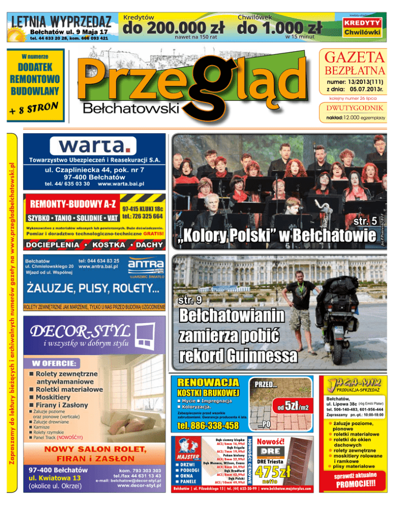 Przeg ląd darmowy portal ogłoszeń W numerze DODATEK REMONTOWO warzystwo Ubezpieczeñ i Reasekuracji S.A. BUDOWLANY N Bełchatowski + 8 STRO GAZETA BEZPŁATNA numer: 13/2013(111) z dnia: 05.07.2013r. kolejny numer 26 lipca DWUTYGODNIK nakład:12.000 egzemplarzy str. 5 „Kolory Polski” w Bełchatowie fot.P.Piotrwski, BTF Zapraszamy do lektury bieżących i archiwalnych numerów gazety na www.przegladbelchatowski.pl Be³chatów, ul. 9 Maja 17 | tel. 44 633 20 28, kom. 666 093 421 NOWY SALON ROLET, FIRAN i ZAS£ON str. 9 DECOR-STYL Bełchatowianin zamierza pobić rekord Guinnessa RENOWACJA KOSTKI BRUKOWEJ PRZED... n Mycie n Impregnacja n Koloryzacja. Zabezpieczenie przed wszelkie zabrudzeniami. Gwarancja producenta 4 lata. tel. 886-338-458 od ...PO 5zł/m2 s Przegląd Bełchatowski 2 Zelowianin odpowie za uprawę konopi nr 13/2013 (111) 05.07.2013r Tragedia w Zelowie Ciało mężczyzny wyłowiono ze stawu w Zelowie. Policjanci ustalają przyczynę jego śmierci. Policjanci zelowscy, pod nadzorem prokuratora, wyjaśniają okoliczności śmierci 68-letniego mieszkańca stolicy. Zwłoki zostały znalezione 23 czerwca 2013 roku, kilka minut przed siedemnastą, w zbiorniku wodnym na terenie prywatnej posesji w Zelowie, gdzie mężczyzna przebywał sam. Najbardziej prawdopodobną przyczyną śmierci było utonięcie podczas karmienia ryb. Decyzją prokuratora cia- ło zostało zabezpieczone bełchatowskim w prosektorium. Przyczynę śmierci pozwoli poznać sądowo-lekarskie badanie zwłok. Pijany kierowca potrącił pieszego W swoje siedemdziesiąte urodziny pijany kierowca volkswagena najechał na pieszego przechodzącego przez ulicę po wyznaczonym przejściu. Potrącony doznał urazów ciała. Jubilat trafił do policyjnego aresztu. www.ogloszeniabelchatow.pl Policjanci z Zelowa zlikwidowali plantację konopi. Właściciel nieruchomości przyznał się do prowadzenia uprawy. 18 czerwca 2013 roku policjanci z zelowskiego komisariatu, interweniując na terenie jednej z zelowskich posesji, zauważyli krzak konopi indyj- skiej. Sprawdzenie terenu za budynkiem doprowadziło do wykrycia aż 198 dorodnych roślin tego gatunku. Właściciel nieruchomości przyznał, że wysiał konopie. Wkrótce za ten czyn 38-letni zelowianin stanie przed sądem. Grozi mu kara do trzech lat pozbawie17 czerwca 2013 roku, około nia wolności. godziny 13.30, na Al. Wyszyń- skiego w Bełchatowie, kieru- Bełchatów, ul W. Polskiego 118 tel. 44 631 33 27, 501 243 711 www.metalbud.net.pl CENTRUM KOSTKI BRUKOWEJ I KAMIENIA e-mail: [email protected] CENTRUM KOSTKI BRUKOWEJ KAMIEŃ OGRODOWY ELEWACYJNY TARASY OGRODZENIA CEGŁY YTONG KOMINY Nowość! kostki z systemem impregnacji! wieści z komendy AUTORYZOWANY DYSTRYBUTOR jący samochodem volkswagen bora najechał na przechodzącego przez jezdnię 64-letniego bełchatowianina. Potrącony mężczyzna, który przekraczał jezdnię w wyznaczonym oraz prawidłowo oznakowanym miejscu, doznał obrażeń ciała i został przewieziony do bełchatowskiego szpitala. Policyjne badanie stanu trzeźwości bełchatowianina kierującego autem - obchodzącego tego dnia swoje siedemdziesiąte urodziny - wykazało 2,22 promila alkoholu w organizmie. Jubilat został zatrzymany i osadzony w policyjnym areszcie. Po wytrzeźwieniu usłyszał zarzut spowodowania wypadku drogowego i kierowania samochodem w stanie nietrzeźwości. Przyznał się do popełnienia zarzuconych mu przestępstw i wniósł o dobrowolne poddanie się karze. O dalszym losie zatrzymanego zadecyduje prokurator. Ranny po zderzeniu z ciężarówką Bełchatowscy policjanci badają okoliczności wypadku, w którym ranny został 20-letni kierowca. Jego opel zderzył się w Szczercowie z cieżarowym renaultem. 26 czerwca 2013 roku, około jedenastej, w Szczercowie na ulicy Częstochowskiej, w ciągu drogi wojewódzkiej numer 483, opel astra kierowany przez 20-letniego szczercowianina, z dotychczas nieustalonej przyczyny, zjechał na pas ruchu dla kierunku przeciwnego, gdzie zderzył się z ciężarówką renault. Renaultem kierował 41-letni mieszkaniec Sieradza. W wyniku zderzenia obrażeń ciała doznał kierowca samochodu osobowego. 20-latek został przewieziony do bełchatowskiego szpitala. Przeprowadzone przez funkcjonariuszy policji badanie potwierdziło trzeźwość obu kierujących. Pracujący na miejscu zdarzenia policjanci zabezpieczyli ślady kryminalistyczne, które pomogą w ustaleniu jego przyczyny. NA SPRZEDAŻ DZIAŁKI ROLNO BUDOWLANE -KAŁDUNY 29.000zł za 3000m² Do sprzedania działki w bezpośrednim sąsiedztwie nowo powstałego osiedla w miejscowości Kałduny- ARON PARK. Działka o wymiarach 62x48, która w przyszłości po zabudowaniu można podzielić na dwie po 1500m². Bardzo spokojna i cicha okolica, a jednocześnie w bliskiej odległości Bełchatowa - ok 4km od centrum. Kontakt: 502-707-683 692-771-249 nr 13/2013 (112) 05.07.2013r Przegląd Bełchatowski www.ogloszeniabelchatow.pl GALERIA OLIMPIA 3 reklama Przegląd Bełchatowski 4 nr 13/2013 (111) 05.07.2013r Inwestycyjny ruch na ulicy Kredowej powiatowych drogach Zbliża się remont www.ogloszeniabelchatow.pl Jeszcze w lipcu br. rozpoczną się prace związane z przebudową sieci, chodników i nawierzchni na Ruszyła kolejna duża inwestycja na drogach powiatu bełchatowskiego ulicy Kredowej. przebudowa drogi powiatowej Bełchatów – Bogdanów na odcinku Bełchatów granica miasta – Dobiecin, wraz z budową ścieżki rowerowej. Ponad 830 tysięcy złotych będzie kosztowała przebudowa ulicy Kredowej na osiedlu Binków. Prace będą przeprowadzone od skrzyżowania z ulicą Budryka do skrzyżowania z ulicą Uskok. Inwestycja jest realizowana w formule zaprojektuj i wybuduj. Wykonawca, firma SANEL planuje rozpoczęć prace związane z przebudową ulicy jeszcze w lipcu br. W zakres zadania wchodzić będzie rozbiórka istniejącej nawierzchni wraz z podbudową, położenie nowej nawierzchni asfaltobetonowej z nową podbudową. Po obu stronach je
