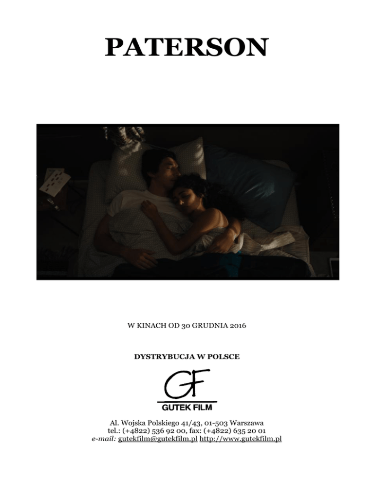 PATERSON W KINACH OD 30 GRUDNIA 2016 DYSTRYBUCJA W POLSCE Al. Wojska Polskiego 41/43, 01-503 Warszawa tel.: (+4822) 536 92 00, fax: (+4822) 635 20 01 e-mail: [email protected] http://www.gutekfilm.pl PATERSON Reżyseria i scenariusz Jim Jarmusch Zdjęcia Frederick Elmes Montaż Affonso Gonçalves Dźwięk Robert Hein Scenografia Mark Friedberg Kostiumy Catherine George Muzyka Sqürl Wiersze Ron Padgett W rolach głównych: Adam Driver Golshifteh Farahani Paterson Laura Producenci Carter Logan Joshua Astrachan Produkcja Amazon Studios Animal Kingdom Inkjet Productions K5 Film Le Pacte Francja / Niemcy / USA rok produkcji: 2016 czas trwania: 118 min 1.85 – Dolby Digital Kolor „Paterson” to rewelacja tegorocznego festiwalu w Cannes i najlepszy od lat film Jima Jarmuscha. Twórca „Broken Flowers” stworzył pełną humoru opowieść o tym, że życie jest poezją i każdy może odnaleźć szczęście na swój sposób. Paterson (Adam Driver) jest kierowcą miejskiego autobusu. Niczego mu nie brakuje. Kocha swoją pełną szalonych pomysłów żonę (Golshifteh Farahani), która każdego dnia tworzy nowy plan na przyszłość. Mężczyzna ma czas na swoją pasję (pisanie wierszy), spacery z psem i spotkania z grupą zaprzyjaźnionych ekscentryków. Jest wśród nich przeżywający zawód miłosny kompan od kufla, wyzwolona singielka przesiadująca wieczorami w barze, czy wiecznie narzekający kolega z pracy, który zazdrości Patersonowi pogody ducha. Jednak na skutek zabawnego zbiegu okoliczności stoicki spokój tytułowego bohatera zostaje poddany próbie. GŁOSY PRASY Jeden z tych filmów, które wychodzą za tobą z kina. Tadeusz Sobolewski, Gazeta Wyborcza Ten skromny i intymny film to kwintesencja kina Jima Jarmuscha. Anna Tatarska, Onet.pl Najnowszy film Jarmuscha ma w sobie tyle niewymuszonej czułości, że oglądając go, można złapać się na mimowolnym uśmiechu. Idealne dla: miłośników wierszy, które się nie rymują i buldogów angielskich. Oraz „Dymu” Paula Austera i Wayne’a Wanga. Marta Bałaga, Stopklatka.pl „Paterson” urzeka, mami, intryguje i wciąga do swojego świata. Reżyser, snując swoją opowieść, potrafi pokazać piękno najzwyklejszych codziennych czynności. Tak naprawdę jednak urok „Patersona” wynika z połączenia wszystkich tych elementów, a wypunktowanie ich na papierze nie oddaje w pełni magii, którą film za sobą niesie. Tak jak trudno określić dokładnie emocjonalny urok poezji, tak trudno określić ten urok w „Patersonie”. To po prostu trzeba zobaczyć i poczuć samemu. Michał Kaczoń, Wprost.pl Widz wychodzi z filmu Jarmuscha z poczuciem ważności swojego własnego życia i życia w ogóle, a to w kinie zdarza się obecnie bardzo rzadko. Alicja Sterna, Onet.pl Jarmusch oraz prowadzony z wyczuciem, powściągliwy Driver zamieniają kolejne sceny w eleganckie miniatury z własną dramaturgią i dyskretnym humorem. Michał Walkiewicz, Filmweb.pl Wyjątkowa oda do zwykłego życia, domowej harmonii i poezji, czyli tego, co sprawia, że warto żyć. The Hollywood Reporter Cudowna baśń o delikatnej, owocnej i tylko czasami trudnej relacji pomiędzy codziennym życiem a twórczością. Time Out Jeden z najlepszych filmów Jarmuscha. Consequence of Sound Absolutnie wyjątkowy, przedziwnie poruszający film, w którym kino maksymalnie zbliża się do prawdziwej poezji. Maclean’s Magazine Doskonały kameralny film, który nie musi się za bardzo starać, żeby zdobyć serca widzów. Movie Mezzanine Najlepsza rola Adama Drivera w jego dotychczasowej karierze. Vanity Fair Paterson wciąga od samego początku, a na końcu zostawia nas z uśmiechem. El Pais „Paterson” jest jak balsam, maść uśmierzająca ból ciała, wyciszająca hałas myśli, dająca odpoczynek zmęczonej duszy. The Playlist REŻYSER O FILMIE „Paterson” to spokojna historia. Jej główni bohaterowie nie mają żadnym dramatycznych konfliktów. Struktura filmu jest prosta – śledzimy życie bohaterów przez siedem dni. „Paterson” jest w zamierzeniu celebracją poezji, kryjącej się w drobiazgach, zmianach, codziennych relacjach z innymi. To odtrutka na mroczne, trudne kino pełne problemów bądź akcji. To film, który powinien przepłynąć obok widza, jak obrazy obserwowane przez szybę miejskiego autobusu, jak mechaniczna gondola poruszająca się przez małe, zapomniane miasto. WYWIAD Z REŻYSEREM Wielu krytyków uważa, że to twój najbardziej osobisty film. Co o tym myślisz? Sam nie wiem. Przy poprzednim filmie – „Tylko kochankowie przeżyją” – wszyscy mówili: to jego najbardziej osobisty film. Pamiętam też opinie przy okazji premiery „Broken Flowers”: w końcu zrobił swój najbardziej osobisty film. Trudno mi się więc odnosić do takich opinii i porównywać moje filmy, mogę tylko podążać za swoim instynktem. „Paterson” jest na wielu poziomach bardzo harmonijny, a czym dla ciebie jest harmonia? Harmonia i muzyka to sprawy dość skomplikowane, bo dla jednych uszu pewne tony będą harmonijne, podczas gdy dla innych nie. Harmonia jest więc do pewnego stopnia subiektywna. Ale powiem, co znaczy dla mnie, pseudobuddysty. Nie jestem szczególnie praktykującym i zdyscyplinowanym buddystą, ale uprawiam tai chi i dużo o buddyzmie czytam. Powiedziałbym, że harmonia powiązana jest z ideą, że wszystkie rzeczy są jedną rzeczą i harmonia tych rzeczy jest wszystkim. Cokolwiek to znaczy, bo ja nie wiem – powodzenia w odkrywaniu tego. „Paterson” ma strukturę wiersza, kolejne dni tygodnia, rutynowe czynności jak kolejne wersy, powtórzenia. Czy taki był twój zamiar? Tak. Uwielbiam w poezji, muzyce i sztuce wariacje oraz repetycje, bez względu na to, czy to Bach czy Warhol. Chciałem, żeby w moim filmie to struktura była swoistą metaforą życia, tego, że każdy kolejny dzień jest wariacją na temat dnia poprzedniego i następnego. Po prostu wariacją. Czy to poezja codzienności? Tak. Wil