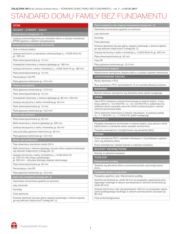 ZAŁĄCZNIK NR 2 do Umowy budowy domu – STANDARD DOMU FAMILY BEZ FUNDAMENTU – ver. 3 – od 01.01.2017 STANDARD DOMU FAMILY BEZ FUNDAMENTU DOM Dach ocieplony nad częścią mieszkalną (Uwagi pkt. 3) ŚCIANY / STROPY / DACH Dachówka cementowa zgodnie ze wzorcem Cokół domu (Uwagi pkt. 1) Łaty dachowe Izolacja przeciwwilgociowa po obwodzie domu w postaci membrany EPDM zgodnie z detalem posadowienia Kontrłaty Ściana zewnętrzna U=0,130 W/(m2K) Krokwie dachowe lub pas górny wiązara kratowego z drewna iglaste‑ go wg obliczeń statycznych (Uwagi pkt. 2) Folia dachowa Tynk w kolorze białym Izolacja termiczna z wełny mineralnej λD=0,033 W/(m∙K) gr. 220 mm Izolacja termiczna ze styropianu elewacyjnego λD=0,040 W/(m∙K) gr. 120 mm Płyta drewnopochodna gr. 22 mm Płyta drewnopochodna gr. 12 mm Folia PE Krawędziak drewniany z drewna iglastego gr. 180 mm Płyta gipsowo‑kartonowa gr. 12,5 mm Izolacja termiczna z wełny mineralnej λD=0,035 W/(m∙K) gr. 180 mm Wykończenie okapów Płyta drewnopochodna gr. 12 mm Wykończenie zewnętrzne okapów dachu w postaci szalówki drewnianej Paroizolacja z folii PE ODWODNIENIE DACHU Płyta gipsowo‑kartonowa gr. 12,5 mm Rynny dachowe z PCV Ściana wewnętrzna Rury spustowe z PCV, sprowadzone 15 cm poniżej elewacji budynku Płyta gipsowo‑kartonowa gr. 12,5 mm BARIERKI Płyta drewnopochodna gr. 12 mm Barierki stalowe zewnętrzne wg aktualnej oferty (jeżeli występują) Krawędziak drewniany z drewna iglastego gr. 80 mm /120 mm OKNA Izolacja akustyczna z wełny mineralnej gr. 50 mm Okna PCV rozwierno‑uchylne 6‑komorowe w kolorze białym, 3‑szy‑ bowy pakiet Ug=0,5 W/(m2K), Uw=ok. 0,8 W/(m2K) w zależności od wielkosci okna, wszystkie okna ze szkłem przezroczystym, klamka okienna aluminiowa biała Płyta drewnopochodna gr. 12 mm Płyta gipsowo‑kartonowa gr. 12,5 mm Strop nad parterem Okna dachowe drewniane w kolorze naturalnym, 2-szybowy pakiet Ug=1,1 W/(m2K), Uw=1,3 W/(m2K) (jeżeli występują) Płyta drewnopochodna gr. 22 mm PARAPETY Belki drewniane z drewna iglastego gr. 220 mm Parapety zewnętrzne aluminiowe w kolorze białym, przy jednym oknie balkonowym w obszarze tarasu parapet wzmocniony Izolacja akustyczna z wełny mineralnej gr. 50 mm Parapety wewnętrzne z konglomeratu wg aktualnej oferty Łaty pod płyty gipsowo‑kartonowe gr. 20 mm DRZWI Płyta gipsowo‑kartonowa gr. 12,5 mm Strop nad poddaszem Drzwi zewnętrzne PCV z zamkiem listwowym z 3‑punktowym ryglowa‑ niem wg aktualnej oferty Trap drewniany szerokości około 0,8 m Drzwi wewnętrzne i zestaw klamek w zakresie inwestora Belki drewniane z drewna iglastego lub pas dolny wiązara kratowego wg obliczeń statycznych (Uwagi pkt. 2) SCHODY WEWNĘTRZNE Izolacja termiczna z wełny mineralnej λD=0,035 W/(m∙K) gr. 270 mm dla stropu panelowego gr. 220 mm – dla pasa dolnego wiązara dachowego PODŁOGI Schody w zakresie inwestora Wykończenie podłóg Płyta drewnopochodna gr. 22 mm Paroizolacja z folii PE Terakota wg aktualnej oferty w pomieszczeniach wg konfiguratora domu Płyta gipsowo‑kartonowa gr. 12,5 mm Posadzka parteru na gruncie Dach bez ocieplenia (Uwagi pkt. 3) Posadzka zgodnie z pkt. Wykończenie podłóg Dachówka cementowa zgodnie ze wzorcem Szlichta cementowa gr. około 50 mm (w przypadku ogrzewania pod‑ łogowego wodnego w danym pomieszczeniu szlichta cementowa gr. około 65 mm) Łaty dachowe Izolacja termiczna z płyt styropianowych 100 mm (w przypadku ogrze‑ wania podłogowego wodnego w danym pomieszczeniu styropian gr. 90 mm) Kontrłaty Folia dachowa Krokwie dachowe lub pas górny wiązara kratowego z drewna iglaste‑ go wg obliczeń statycznych (Uwagi pkt. 2) Twoja przestrzeń do życia. Folia przeciwwilgociowa 1 ZAŁĄCZNIK NR 2 do Umowy budowy domu – STANDARD DOMU FAMILY BEZ FUNDAMENTU – ver. 3 – od 01.01.2017 STANDARD DOMU FAMILY BEZ FUNDAMENTU Posadzka piętra INSTALACJE ELEKTRYCZNE (Uwagi punkt 4) Posadzka zgodnie z pkt. Wykończenie podłóg Zasilanie w energię elektryczną Szlichta cementowa gr. około 50 mm (w przypadku ogrzewania pod‑ łogowego wodnego w danym pomieszczeniu szlichta cementowa gr. około 65 mm) Szafka bezpiecznikowa wraz z wyposażeniem Izolacja termiczna z płyt styropianowych 90 mm (w przypadku ogrzewania podłogowego wodnego w danym pomieszczeniu styropian gr. 80 mm) Osprzęt elektryczny w kolorze białym wg aktualnej oferty Osprzęt elektryczny WYKOŃCZENIE WEWNĘTRZNE ŚCIAN Instalacja oświetleniowa, gniazda wtykowe i pozostałe instalcje Szpachlowanie w standardzie Q1 (szpachlowanie połączeń płyt) Według projektu instalacji Glazura w pomieszczeniach mokrych wg konfiguratora, na ścianach z urządzeniami sanitarnymi. INSTALACJE TECHNICZNE Wentylacja Wentylacja mechaniczna z wymiennikiem przeciwprądowym o spraw‑ ności urządzenia do 68% zgodnie z projektem Ogrzewanie Kocioł jednofunkcyjny kondensacyjny na gaz ziemny z zasobnikiem na ciepłą wodę o pojemności 120 l, moc kotła zgodnie z kalkulacją zapotrzebowania na ciepło, czujnik pogodowy zewnętrzny Grzejniki płytowe lakierowane w kolorze białym z zaworami termo‑ statycznymi, liczbę i wielkość określa się na podstawie obliczeń zapotrzebowania na ciepło, w łazience grzejnik drabinkowy Przewody c.o. - rury z tworzyw sztucznych Instalacje sanitarne Przewody wody zimnej i ciepłej - rury z tworza sztucznego Przewody kanalizacyjne - rury kielichowe z PVC Baterie mieszające wg. aktualnej oferty Obiekty sanitarne w kolorze białym wg. aktualnej oferty, liczba obiektów sanitarnych i ich usytuowanie zgodnie z rysunkami architektury Podejście wody zimnej z zaworem kulowym i kanalizacji do pralki szt. 1 Zawór ogrodowy szt. 1 Data Podpis Inwestora Uwagi: 1. Wykończenie cokołu budynku i schodów leży po stronie Inwestora 2. W niektórych typach domów występują więźby dachowe, których konstrukcję nośną stanowią dźwigary 3. Przy domach ze spadkiem dachu poniżej 16 stopni zmiana dachówki, łat i folii dachowej n