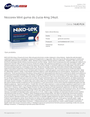 Apteka z Gór Papieska 39, 33-300 Nowy Sącz +48 882 004 443 Niccorex Mint guma do żucia 4mg 24szt. Cena: 14,40 PLN Opis słownikowy Dawka 4 mg Postać guma do żucia lecz. Producent US PHARMACIA SP. Z O.O. Substancja czynna Nicotinum Opis produktu NIKO-LEK Mint 4mg x 24 gumy do żucia Niko-Lek gumy lecznicze o smaku miętowym z 4mg nikotyny - dawka dla osób dorosłych uzależnionych od nikotyny, wypalających więcej niż 20 papierosów w ciągu doby. Niko-Lek to guma dla osób pragnących zredukować nałóg bądź całkowicie porzucić palenie. Skład: Nikotyna 4mg w postaci 26,5mg nikotyny z kationitem. Działanie: Niko-Lek to guma lecznicza zawierająca dawkę nikotyny dostosowaną do rozmiaru nałogu - dawka 4mg to propozycja dla osób wypalających więcej niż 20 papierosów dziennie. Niko-Lek guma lecznicza, skutecznie zastąpi chęć sięgnięcia po papierosa w czasie, gdy nie możesz zapalić - jako substytut papierosa lub kiedy chcesz skutecznie ograniczyć rozmiar nałogu i w rezultacie całkowicie od niego odejść. Niccorex guma lecznicza posiada przyjemny, orzeźwiający smak mięty. Skutecznie pomaga niwelować skutki głodu nikotynowego, dostarczając organizmowi palacza stopniowo uwalnianą podczas żucia nikotynę. Zastosowanie: Niko-Lek guma lecznicza, skutecznie łagodzi objawy odstawienia palenia tytoniu oraz zmniejsza głód nikotynowy u osób planujących rzucić palenie tytoniu lub je ograniczyć, dążąc do całkowitego wyjścia z nałogu. Przeciwdziała nawrotowi palenia u osób zdecydowanych do rzucenia palenia. Dawkowanie i sposób podawania: Gumy są przeznaczone dla palaczy, którzy palą 20 lub więcej papierosów dziennie lub wcześniej nie zdołali rzucić palenia za pomocą gumy leczniczej zawierającej 2 mg nikotyny. Początkowo należy przyjmować 4 mg nikotyny (1 gumę leczniczą) co 1-2 godziny. W większości przypadków wystarczająca jest dawka 32-48 mg nikotyny (8-12 gum leczniczych) dziennie. Nie należy zażywać więcej niż 64 mg nikotyny (16 leczniczych gum do żucia) na dobę. Gdy guma stosowana jest w celu ograniczenia palenia, nie należy przyjmować więcej niż 48 mg nikotyny (12 leczniczych gum do żucia) na dobę. Rzucenie palenia tytoniu: Czas leczenia ma charakter indywidualny, ale zwykle wynosi 3 miesiące. Po upływie tego czasu należy stopniowo zmniejszać liczbę zużywanych gum. Leczenie należy przerwać, gdy dzienna dawka została zmniejszona do 4-8 mg nikotyny (1-2 gum leczniczych). Gumę można zażywać kiedykolwiek pojawi się chęć zapalenia papierosa. Ograniczenie palenia: Produkt Niko-Lek Mint należy stosować w czasie pomiędzy wypalanymi papierosami w celu zmniejszenia łaknienia tytoniu i w ten sposób wydłużenia czasu bez palenia. Papierosy powinny być stopniowo zastępowane gumami leczniczymi z nikotyną. Jeśli w ciągu 6 tygodni leczenia nie udało się ograniczyć liczby wypalanych papierosów co najmniej o połowę, należy zasięgnąć porady profesjonalisty. Należy podjąć próbę rzucenia palenia, kiedy tylko pojawi się motywacja ku temu, ale nie później niż 4 miesiące od rozpoczęcia przyjmowania leku. W tym celu należy stopniowo zmniejszać liczbę stosowanych gum do żucia z nikotyną, na przykład zmniejszając liczbę o jedną gumę co 2-5 dni. Jeżeli w ciągu 4 miesięcy od rozpoczęcia leczenia nie jest możliwa zdecydowana próba zerwania z nałogiem, należy zasięgnąć porady profesjonalisty. Nie zaleca się regularnego stosowania produktu przez okres dłuższy niż 6 miesięcy. W niektórych przypadkach dłuższy okres stosowania leku może być konieczny w celu uniknięcia nawrotu palenia. Niewykorzystane gumy należy zachować na wypadek nagłego pojawienia się głodu nikotynowego. Technika żucia: Podanie na śluzówkę jamy ustnej. Gumy Niccorex nie należy żuć jak zwykłej gumy do żucia. Żucie gumy w sposób szybki i ciągły, powoduje zbyt szybkie uwalnianie nikotyny. Może to powodować dyskomfort (np. zgagę i czkawkę). 1. Żuj gumę Niccorex powoli, aż poczujesz wyraźny smak bądź lekkie mrowienie. 2. Wtedy przerwij żucie i zatrzymaj gumę w ustach między dziąsłem a policzkiem dopóki smak i/lub uczucie mrowienia znikną 3. Następnie zacznij żuć ponownie do momentu poczucia wyraźnego smaku lub uczucia lekkiego mrowienia. 4. Powtarzaj tę czynność przez około 30 minut. Plik wygenerowano: 02-03-2017 Oprogramowanie sklepu: AptusShop Apteka z Gór Papieska 39, 33-300 Nowy Sącz +48 882 004 443 Plik wygenerowano: 02-03-2017 Powered by TCPDF (www.tcpdf.org) Oprogramowanie sklepu: AptusShop