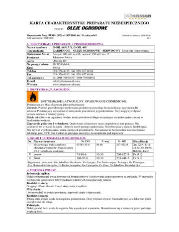 KARTA CHARAKTERYSTYKI PREPARATU NIEBEZPIECZNEGO PRODUKT: OLEJ EJE OL EJ E OGRODOWE Na podstawie Rozp. REACH (WE) nr 1907/2006; Art. 31; załącznik II Ostatnia aktualizacja: 2009-02-26 str. 1 Data wystawienia: 2008-06-26 1. IDENTYFIKACJA PREPARATU I PRZEDSIĘBIORSTWA. Nazwa handlowa G-OIL 665 LUX, G-OIL 465 GARDEN OIL OLEJE OGRODOWE – SERWISOWY Do mycia i smarowania. Typ produktu Opakowanie/ Art. nr Aerozol 400 ml./ xxx 00, aerozol 150 ml./ xxx 15 Johansson Polska Producent Opolska 10F Adres 80-395 Gdańsk Nr poczty / miasto Polska Kraj 058- 556 40 95 lub 058- 677 46 66 Telefon 058- 556 40 95 lub 058- 677 46 66 Fax tel. 0046 708404597 0046 704926911 Tel. alarmowy [email protected]. E-mail Witryna www.johansson–ab.com. 2. IDENTYFIKACJA ZAGROŻEŃ. EKSTREMALNIE ŁATWOPALNY. OPAKOWANIE CIŚNIENIOWE. Produkt ten jest sklasyfikowany jako niebezpieczny. Zdrowie. Podczas prawidłowego użytkowania produkt nie powoduje bezpośredniego zagrożenia dla zdrowia. Powtarzający się kontakt ze skórą może powodować jej podrażnienie. Pary mogą wywoływać uczucie senności i zawroty głowy. Działa szkodliwie na organizmy wodne; może powodować długo utrzymujące się niekorzystne zmiany w środowisku wodnym. Zagrożenia pożarowe i wybuchowe. Opakowanie ciśnieniowe może eksplodować przy pożarze. Nie dziurawić lub wrzucać do ognia - dotyczy nawet pustego opakowania. Przechowywać z dala od źródeł ognia. Nie używać w pobliżu ognia, iskier, żarzących przedmiotów. Nie narażać na bezpośrednie nasłonecznienie lub temp. pow. 50°C. Nie tryskać na pracujące maszyny i na urządzenia pod napięciem. 3. SKŁAD I INFORMACJA O SKŁADNIKACH Nr CAS Nr Nazwa chemiczna 1 Niskowrząca frakcja naftowa 93763-33-8 obrabiana wodorem (Weglowodory C6-11 obrabiane wodorem) 2 propan 74-98-6 3 butan 106-97-8 % wag. Nr WE 30-60 297-852-0 Klasyfikacja Xn, Xi;N, R:1138-65- 67-50/53; Rakotw..kat.2 10-30 10-30 200-827-9 203-448-7 F+,R12 F+,R12 Wyjaśnienie oznakowań: Xn= Szkodliwe dla zdrowia, Xi= Irytujące, T+= Bardzo trujące, T= trujące, O= Utleniające, F+= Ekstremalnie łatwopalne, F= Bardzo łatwopalne, Fo= Łatwopalne, C= Żrące, N= Szkodliwe dla środowiska. 4. PIERWSZA POMOC. Informacja ogólna: Należy przestrzegać uwag dotyczących bezpieczeństwa i użytkowania zamieszczonych na etykiecie. W przypadku wystąpienia symptomów lub wypadkach wątpliwych zasięgnąć rady lekarza. Kontakt ze skórą. Ściągnąć oblane ubranie. Umyć skórę wodą i mydłem. Wdychanie. Wyprowadzić na świeże powietrze, zapewnić ciepło i odpoczynek. Kontakt z oczami. Płukać dużą ilością wody do ustąpienia podrażnienia. Oczy trzymać otwarte. Skontaktować się z lekarzem jeżeli dolegliwości nie ustają. Połknięcie. Należy podać dużo wody do wypicia. Nie wywoływać wymiotów. Skontaktować się z lekarzem, jeżeli połknięto większą ilość. KARTA CHARAKTERYSTYKI PREPARATU NIEBEZPIECZNEGO PRODUKT: OLEJ EJE OL EJ E OGRODOWE Na podstawie Rozp. REACH (WE) nr 1907/2006; Art. 31; załącznik II Data wystawienia: 2008-06-26 Ostatnia aktualizacja: 2009-02-26 str. 2 5. POSTĘPOWANIE W PRZYPADKU POŻARU. Środki gaśnicze. Proszki gaśnicze, piana lub dwutlenek węgla, rozpylony strumień wody. Nieodpowiednie środki gaśnicze. Nie używać zwartego strumienia wody. Szczególne wyposażenie podczas walki z ogniem Środki ochrony ogólnej typowe w przypadku pożaru. Ubranie ochronne, aparaty izolujące drogi oddechowe. Dodatkowe uwagi. Aerozol pod ciśnieniem – niebezpieczeństwo wybuchu w wysokiej temperaturze. Gaz może gromadzić się przy powierzchni ziemi i przemieszczać się stwarzając niebezpieczeństwo pożaru lub wybuchu. W warunkach pożaru mogą powstawać tlenki węgla. Pojemniki znajdujące się w pobliżu ognia usunąć lub chłodzić strumieniem wody. 6. POSTĘPOWANIE W PRZYPADKU NIEZAMIERZONEGO UWOLNIENIA DO ŚRODOWISKA. Indywidualne środki ostrożności Ubrania robocze ze zwartej tkaniny, rękawice z tworzywa odpornego na działanie węglowodorów, buty z tworzywa nitrylowego, okulary ochronne w szczelnej obudowie. Metody oczyszczenia: Uniemożliwić przedostanie się do kanalizacji. Absorbować odpowiednim nie aktywnym materiałem, umieścić w opakowaniu zastępczym i skierować do zniszczenia. Zwrócić uwagę na ryzyko zapalenia. 7. POSTĘPOWANIE Z PREPARATEM I JEGO MAGAZYNOWANIE. Postępowanie z preparatem. Używać jedynie w dobrze wentylowanych pomieszczeniach. W przypadku niewystarczającej wentylacji zakładać maskę z pochłaniaczem par organicznych. Podczas pracy z produktem nie jeść, nie palić, unikać otwartego ognia i źródeł ciepła. Nie wdychać rozpylanego produktu. Zarządzenia podczas obchodzenia się z substancją. Bądź ostrożny przy obsłudze każdych chemikalii również opakowań aerozolowych Magazynowanie. Wszelkie pomieszczenia magazynowe muszą być wentylowane. Instalacje elektryczne powinny spełniać wymogi przeciwwybuchowości. Nie eksponować w bezpośrednich promieniach słonecznych lub temp. pow. 50°C. Przechowywać z dala od źródeł ognia i w miejscach nie dostępnych dla dzieci. Palenie wzbronione. Przechowywać z dala od żywności i pasz. 8. KONTROLA NARAŻENIA I ŚRODKI OCHRONY INDYWIDUALNEJ. Wartości graniczne narażenia: Niskowrząca frakcja naftowa obrabiana wodorem – najwyższe dopuszczalne stężenia – NDS -500 mg/m3; NDSCh-1500 mg/m3 Butan - NDS -1900 mg/m3; NDSCh -3000 mg/m3 Propan - NDS -1800 mg/m3; Kontrola narażenia w miejscu pracy: Zapewnić właściwą wentylację pomieszczenia. Obowiązują przepisy ogólne przemysłowej higieny pracy. Ochrona dróg oddechowych: Zbędne przy dobrej wentylacji i prawidłowym używaniu produktu. Ochrona rąk: Zbędne przy prawidłowym używaniu produktu. Można używać rękawice z tworzywa nitrylowego. Ochrona oczu: Zbędne przy prawidłowym używaniu produktu. Ochrona skóry: Zbędne przy prawidłowym używaniu produktu. KARTA CHARAKTERYSTYKI PREPARATU NIEBEZPIECZNEGO P