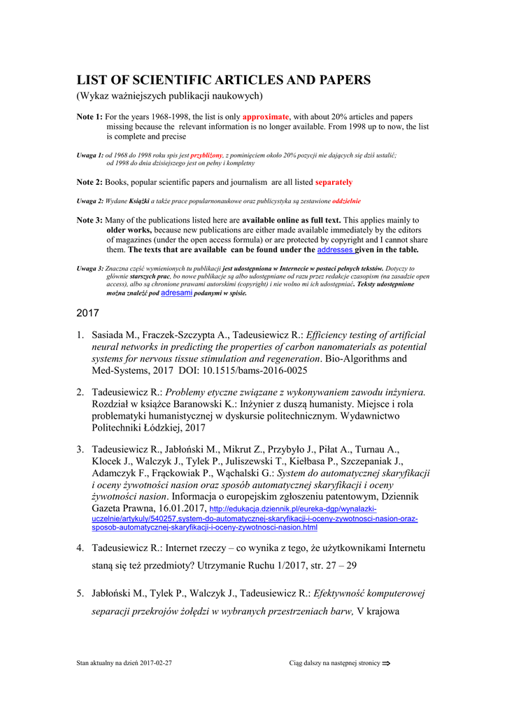 LIST OF SCIENTIFIC ARTICLES AND PAPERS (Wykaz ważniejszych publikacji naukowych) Note 1: For the years 1968-1998, the list is only approximate, with about 20% articles and papers missing because the relevant information is no longer available. From 1998 up to now, the list is complete and precise Uwaga 1: od 1968 do 1998 roku spis jest przybliżony, z pominięciem około 20% pozycji nie dających się dziś ustalić; od 1998 do dnia dzisiejszego jest on pełny i kompletny Note 2: Books, popular scientific papers and journalism are all listed separately Uwaga 2: Wydane Książki a także prace popularnonaukowe oraz publicystyka są zestawione oddzielnie Note 3: Many of the publications listed here are available online as full text. This applies mainly to older works, because new publications are either made available immediately by the editors of magazines (under the open access formula) or are protected by copyright and I cannot share them. The texts that are available can be found under the addresses given in the table. Uwaga 3: Znaczna część wymienionych tu publikacji jest udostępniona w Internecie w postaci pełnych tekstów. Dotyczy to głównie starszych prac, bo nowe publikacje są albo udostępniane od razu przez redakcje czasopism (na zasadzie open access), albo są chronione prawami autorskimi (copyright) i nie wolno mi ich udostępniać. Teksty udostępnione można znaleźć pod adresami podanymi w spisie. 2017 1. Sasiada M., Fraczek-Szczypta A., Tadeusiewicz R.: Efficiency testing of artificial neural networks in predicting the properties of carbon nanomaterials as potential systems for nervous tissue stimulation and regeneration. Bio-Algorithms and Med-Systems, 2017 DOI: 10.1515/bams-2016-0025 2. Tadeusiewicz R.: Problemy etyczne związane z wykonywaniem zawodu inżyniera. Rozdział w książce Baranowski K.: Inżynier z duszą humanisty. Miejsce i rola problematyki humanistycznej w dyskursie politechnicznym. Wydawnictwo Politechniki Łódzkiej, 2017 3. Tadeusiewicz R., Jabłoński M., Mikrut Z., Przybyło J., Piłat A., Turnau A., Klocek J., Walczyk J., Tylek P., Juliszewski T., Kiełbasa P., Szczepaniak J., Adamczyk F., Frąckowiak P., Wąchalski G.: System do automatycznej skaryfikacji i oceny żywotności nasion oraz sposób automatycznej skaryfikacji i oceny żywotności nasion. Informacja o europejskim zgłoszeniu patentowym, Dziennik Gazeta Prawna, 16.01.2017, http://edukacja.dziennik.pl/eureka-dgp/wynalazkiuczelnie/artykuly/540257,system-do-automatycznej-skaryfikacji-i-oceny-zywotnosci-nasion-orazsposob-automatycznej-skaryfikacji-i-oceny-zywotnosci-nasion.html 4. Tadeusiewicz R.: Internet rzeczy – co wynika z tego, że użytkownikami Internetu staną się też przedmioty? Utrzymanie Ruchu 1/2017, str. 27 – 29 5. Jabłoński M., Tylek P., Walczyk J., Tadeusiewicz R.: Efektywność komputerowej separacji przekrojów żołędzi w wybranych przestrzeniach barw, V krajowa Stan aktualny na dzień 2017-02-27 Ciąg dalszy na następnej stronicy konferencja naukowa “Zastosowanie metod wideo-komputerowych w badaniach naukowych”, Uniwersytet Rolniczy, Kraków 2017 6. Przybyło J., Jabłoński M., Tadeusiewicz R.: Predykcja żywotności żołędzi z wykorzystaniem konwolucyjnych sieci neuronowych. V krajowa konferencja naukowa “Zastosowanie metod wideo-komputerowych w badaniach naukowych”, Uniwersytet Rolniczy, Kraków 2017 2016 (Sum of Ministry points = 121 Suma punktów MNiSW ) 7. Jabłoński M., Tylek P., Walczyk J., Tadeusiewicz R., Piłat A.: Colour-Based Binary Discrimination of Scarified Quercus Robur Acorns Under Varying Illumination, Sensors 16 (8), DOI: 10.3390/s16081319, 2016 ; DOI: 10.3390/s16081319 MNiSW = 30, LF https://www.researchgate.net/publication/306296007_ColourBased_Binary_Discrimination_of_Scarified_Quercus_robur_Acorns_under_Varying_Illumination http://www-1mdpi-1com-1atoz.wbg2.bg.agh.edu.pl/1424-8220/16/8/1319/pdf 8. Mazurkiewicz E., Tomecka-Suchoń S., Tadeusiewicz R.: Application of Neural Network Enhanced Ground Penetrating Radar to Localization of Burial Sites. Applied Artificial Intelligence, vol. 30, No. 9, 2016, pp. 844-860 DOI 10.1080/08839514.2016.1274250, PDF MNiSW = 20, LF http://dx.doi.org/10.1080/08839514.2016.1274250 9. Zaikin O., Tadeusiewicz R., Różewski P., Busk Kofoed L., Malinowska M., Żyławski A.: Teachers’ and students’ motivation model as a strategy for open distance learning processes, Bulletin of The Polish Academy of Sciences Technical Sciences, Vol. 64, No. 4, 2016, pp. 943-955 DOI: 10.1515/bpasts2016-0103 MNiSW = 20, LF https://www.researchgate.net/publication/311938894_Teachers%27_and_students%27_motivation _model_as_a_strategy_for_open_distance_learning_processes 10. Staszuk A., Wiatrak B., Tadeusiewicz R., Karuga-Kuźniewska E., Rybak Z.: Telerehabilitation approach for patients with hand impairment, Acta of Bioengineering and Biomechanics, No. 4, 2016, pp. 55-62 ; DOI:10.5277/ABB00428-2015-03, MNiSW = 15, IF = 0,767, LF PDF http://www.actabio.pwr.wroc.pl/Vol18No4/7.pdf https://www.researchgate.net/publication/313068549_Telerehabilitation_approach_for_patients_wit h_hand_impairment 11. Starzomska M., Tadeusiewicz R.: Pitfalls In Anorexia Nervosa Research: The Risk Of Artifacts Linked To Denial Of Illness And Methods Of Preventing Them, Psychiatria Danubina, Vol. 28, No. 3, 2016, pp 202–210 MNiSW = 15, IF = 1.879 ; PDF http://www.hdbp.org/psychiatria_danubina/2016_Vol_28_No_3.html?ver=1.1 http://www.hdbp.org/psychiatria_danubina/pdf/dnb_vol28_no3/dnb_vol28_no3_202.pdf https://www.researchgate.net/publication/308548064_Pitfalls_in_anorexia_nervosa_research_The_ risk_of_artifacts_linked_to_denial_of_illness_and_methods_of_preventing_them Stan aktualny na dzień 2017-02-27 Ciąg dalszy na następnej stronicy 12. Przybyło J., Jabłoński J., Pociecha D., Tadeusiewicz R., Piłat A., Walczyk J., Tylek P., Szczepaniak J., Florczyk A.: Application of Model-Based Design in Rapid Prototyping of Algorithms for