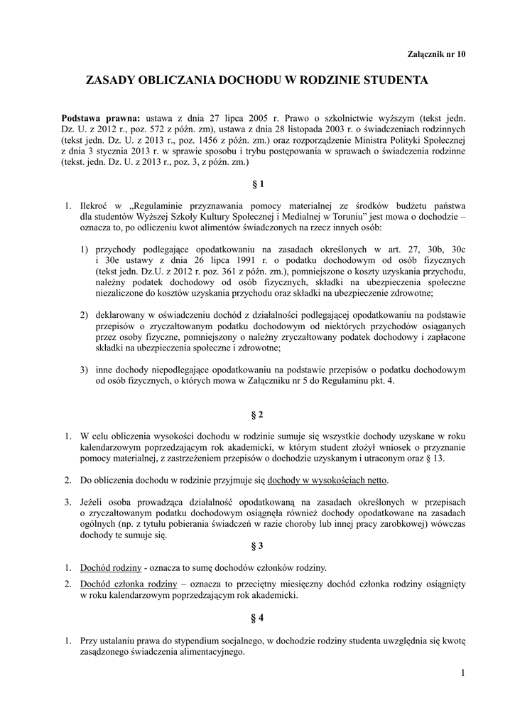 Załącznik nr 10 ZASADY OBLICZANIA DOCHODU W RODZINIE STUDENTA Podstawa prawna: ustawa z dnia 27 lipca 2005 r. Prawo o szkolnictwie wyższym (tekst jedn. Dz. U. z 2012 r., poz. 572 z późn. zm), ustawa z dnia 28 listopada 2003 r. o świadczeniach rodzinnych (tekst jedn. Dz. U. z 2013 r., poz. 1456 z póżn. zm.) oraz rozporządzenie Ministra Polityki Społecznej z dnia 3 stycznia 2013 r. w sprawie sposobu i trybu postępowania w sprawach o świadczenia rodzinne (tekst. jedn. Dz. U. z 2013 r., poz. 3, z późn. zm.) §1 1. Ilekroć w „Regulaminie przyznawania pomocy materialnej ze środków budżetu państwa dla studentów Wyższej Szkoły Kultury Społecznej i Medialnej w Toruniu” jest mowa o dochodzie – oznacza to, po odliczeniu kwot alimentów świadczonych na rzecz innych osób: 1) przychody podlegające opodatkowaniu na zasadach określonych w art. 27, 30b, 30c i 30e ustawy z dnia 26 lipca 1991 r. o podatku dochodowym od osób fizycznych (tekst jedn. Dz.U. z 2012 r. poz. 361 z późn. zm.), pomniejszone o koszty uzyskania przychodu, należny podatek dochodowy od osób fizycznych, składki na ubezpieczenia społeczne niezaliczone do kosztów uzyskania przychodu oraz składki na ubezpieczenie zdrowotne; 2) deklarowany w oświadczeniu dochód z działalności podlegającej opodatkowaniu na podstawie przepisów o zryczałtowanym podatku dochodowym od niektórych przychodów osiąganych przez osoby fizyczne, pomniejszony o należny zryczałtowany podatek dochodowy i zapłacone składki na ubezpieczenia społeczne i zdrowotne; 3) inne dochody niepodlegające opodatkowaniu na podstawie przepisów o podatku dochodowym od osób fizycznych, o których mowa w Załączniku nr 5 do Regulaminu pkt. 4. §2 1. W celu obliczenia wysokości dochodu w rodzinie sumuje się wszystkie dochody uzyskane w roku kalendarzowym poprzedzającym rok akademicki, w którym student złożył wniosek o przyznanie pomocy materialnej, z zastrzeżeniem przepisów o dochodzie uzyskanym i utraconym oraz § 13. 2. Do obliczenia dochodu w rodzinie przyjmuje się dochody w wysokościach netto. 3. Jeżeli osoba prowadząca działalność opodatkowaną na zasadach określonych w przepisach o zryczałtowanym podatku dochodowym osiągnęła również dochody opodatkowane na zasadach ogólnych (np. z tytułu pobierania świadczeń w razie choroby lub innej pracy zarobkowej) wówczas dochody te sumuje się. §3 1. Dochód rodziny - oznacza to sumę dochodów członków rodziny. 2. Dochód członka rodziny – oznacza to przeciętny miesięczny dochód członka rodziny osiągnięty w roku kalendarzowym poprzedzającym rok akademicki. §4 1. Przy ustalaniu prawa do stypendium socjalnego, w dochodzie rodziny studenta uwzględnia się kwotę zasądzonego świadczenia alimentacyjnego. 1 2. W przypadku, gdy członek rodziny ma ustalone prawo do alimentów, ale ich nie otrzymuje lub otrzymuje w wysokości niższej lub wyższej od ustalonej wyrokiem, ugodą sądową lub ugodą przed mediatorem, do dochodu rodziny stanowiącego podstawę ustalania prawa do pomocy materialnej wlicza się alimenty w otrzymywanej wysokości. 3. Kwoty alimentów świadczonych na rzecz innych osób spoza rodziny studenta odejmuje się od dochodu rodziny studenta. §5 1. W przypadku ustalania dochodu z gospodarstwa rolnego dochód rodziny ustala się na podstawie przeciętnej liczby hektarów przeliczeniowych znajdujących się w posiadaniu rodziny w roku kalendarzowym poprzedzającym okres zasiłkowy. 2. Dochód z gospodarstwa rolnego oblicza się na podstawie powierzchni użytków rolnych w hektarach przeliczeniowych i wysokości przeciętnego dochodu z pracy w indywidualnych gospodarstwach rolnych z 1 ha przeliczeniowego, ogłaszanego na podstawie art. 18 ustawy z dnia 15 listopada 1984 r. o podatku rolnym (tekst jedn. Dz. U. z 2013 r. poz. 1381, z późn. zm.). Dochód ten jest ogłaszany corocznie przez Prezesa Głównego Urzędu Statystycznego nie później niż do dnia 23 września każdego roku. 3. Za gospodarstwo rolne uważa się obszar gruntów, o których mowa w art. 1 ustawy o podatku rolnym, o łącznej powierzchni przekraczającej 1 ha lub 1 ha przeliczeniowy, stanowiących własność lub znajdujących się w posiadaniu osoby fizycznej, osoby prawnej albo jednostki organizacyjnej, w tym spółki, nieposiadającej osobowości prawnej. 4. W przypadku powierzchni gospodarstwa rolnego mniejszej niż 1 hektar lub 1 hektar przeliczeniowy za dochód przyjmuje się zero. 5. Zmiana powierzchni gospodarstwa rolnego (np. sprzedaż, zakup) nie stanowi utraty ani uzyskania dochodu w myśl ustawy o świadczeniach rodzinnych. Wszelkie zmiany uwzględniane są w latach, które stanowią podstawę przyznawania pomocy materialnej, z zastrzeżeniem, że jeśli zmiana powierzchni nastąpiła w trakcie roku, dochód należy liczyć proporcjonalnie do liczby miesięcy posiadania gospodarstwa rolnego. Tak wyliczony dochód dzieli się przez 12 miesięcy. 6. Ustalając dochód rodziny uzyskany z gospodarstwa rolnego, do powierzchni gospodarstwa stanowiącego podstawę wymiaru podatku rolnego wlicza się obszary rolne oddane w dzierżawę, z wyjątkiem: 1) 2) 3) oddanej w dzierżawę, na podstawie umowy dzierżawy zawartej stosownie do przepisów o ubezpieczeniu społecznym rolników, części lub całości znajdującego się w posiadaniu rodziny gospodarstwa rolnego, gospodarstwa rolnego wniesionego do użytkowania przez rolniczą spółdzielnię produkcyjną, gospodarstwa rolnego oddanego w dzierżawę w związku z pobieraniem renty określonej w przepisach o wspieraniu rozwoju obszarów wiejskich ze środków pochodzących z Sekcji Gwarancji Europejskiego Funduszu Orientacji i Gwarancji Rolnej oraz w przepisach o wspieraniu rozwoju obszarów wiejskich z udziałem środków Europejskiego Funduszu Rolnego na rzecz Rozwoju Obszarów Wiejskich. Zgodnie z przepisami ustawy o ubezpieczeniu społecznym rolników umowa dzierżawy zawarta jest w formie pisemnej na okre