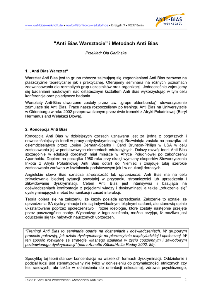 www.anti-bias-werkstatt.de ● [email protected] ● Kinzigstr. 9 ● 10247 Berlin "Anti Bias Warsztacie" i Metodach Anti Bias Przekład: Ola Garlinska 1. „Anti Bias Warsztat“ Warsztat Anti Bias jest to grupa robocza zajmującą się zagadnieniami Anti Bias zarówno na płaszczyźnie teoretycznej jak i praktycznej. Oferujemy seminaria na róŜnych poziomach zaawansowania dla rozmaitych grup uczestników oraz organizacji. Jednocześnie zajmujemy się badaniami naukowymi nad ostatecznym kształtem Anti Bias wykorzystując w tym celu konferencje oraz pojedyncze badania. Warsztaty Anti-Bias utworzone zostały przez tzw. „grupe oldenburską”, stowarzyszenie zajmujace się Anti Bias. Prace nasza rozpoczęliśmy po treningu Anti Bias na Uniwersytecie w Oldenburgu w roku 2002 przeprowadzonym przez dwie trenerki z Afryki Południowej (Beryl Hermanus and Welakazi Dlowa). 2. Koncepcja Anti Bias Koncepcja Anti Bias w dzisiejszych czasach uznawana jest za jedną z bogatszych i nowocześniejszych teorii w pracy antydyskryminacyjnej. Rozwinięta została na początku lat osiemdziesiątych przez Louise Derman-Sparks i Carol Brunson-Philips w USA w celu zastosowania jej w podstawowych elementach edukacyjnych. Dalszy rozwój teorii Anti Bias szczególnie w edukacji dorosłych miał miejsce w Afryce Południowej po zakończeniu Apartheidu. Dopiero na początku 1980 roku przy okazji wymiany ekspertów Stowarzyszenia Inkota z Afryki Południowej Anti Bias dotarł do Niemiec i znajduje tutaj szerokie zastosowanie zarówno w kształceniu podstawowym jak i w edukacji dorosłych. Angielskie słowo Bias oznacza stronniczość lub uprzedzenie. Anti Bias ma na celu zniwelowanie błednej sytuacji powstalej w przypadku stronniczości lub uprzedzenia i zlikwidowanie dyskryminacji. Celem Anti Bias jest intensywna i bazująca na doświadczeniach konfrontacja z pojęciami władzy i dyskryminacji a takŜe „oduczenie się” dyskryminujących metod komunikacji i zasad interakcji. Teoria opiera się na załoŜeniu, Ŝe kaŜdy posiada uprzedzenia. ZałoŜenie to uznaje, ze uprzedzenia SA dyskryminacje i nie są indywidualnymi błędnymi sadami, ale stanowią opinie ukształtowane poprzez społeczeństwo i róŜne ideologie, które zostały następnie przejęte przez poszczególne osoby. Wychodząc z tego załoŜenia, moŜna przyjąć, iŜ moŜliwe jest oduczenie się tak nabytych nauczonych uprzedzeń. “Treningi Anti Bias to seminaria oparte na doznaniach i doświadczeniach. W grupowym procesie pokazują, jak działa dyskryminacja na płaszczyźnie międzyludzkiej i społecznej. W ten sposób rozwijane sa strategie własnego działania w Ŝyciu codziennym i zawodowym pozbawionego dyskryminacji” (patrz Annette Kübler/Anita Reddy 2002, 89). Specyfikę tej teorii stanowi koncentracja na wszelkich formach dyskryminacji. Oddzielenie i podział ludzi jest stematyzowany nie tylko w odniesieniu do przynaleŜności etnicznych czy tez rasowych, ale takŜe w odniesieniu do orientacji seksualnej, zdrowia psychicznego, Tekst 1: "Anti Bias Warsztacie" i Metodach Anti Bias 1 www.anti-bias-werkstatt.de ● [email protected] ● Kinzigstr. 9 ● 10247 Berlin fizycznego tudzieŜ sprawności społecznej. Przy czym występują tu najróŜniejsze połączenia i obopólne zaleŜności tych dymisji o duŜym znaczeniu. O wyjątkowości metody Anti Bias stanowi równieŜ włączenie tudzieŜ połączenie płaszczyzny indywidualnej i społecznej. Dyskryminacja nie wywodzi się, bowiem z uprzedzeń jednostek w stosunku do jednostek, ale bazuje na powszechnie dzielonych przez społeczeństwo obrazach, ocenach i poglądach. Te kompleksowe zaleŜności sięgają w wielu przypadkach bardzo często w głąb ogólnych zasad instytucjonalnych, prawnych i organizacyjnych oraz w głąb Ŝycia codziennego i oddziaływania pedagogicznego. Celem Anti Bias jest pewnego rodzaju uwraŜliwienie na wszystkie te czynniki, ich połączenie oraz rozwój dalszych moŜliwości działania. Anti Bias jest dla nas czymś więcej niŜ samym w sobie zamkniętym systemem specjalnych metod Anti Bias. Anti Bias oznacza dla nas pewien rodzaj postawy Ŝyciowej, która kształtuje się przez cale Ŝycie. Jest to dla nas otwarta koncepcja, która zdaje się działać dzięki połączeniu innych koncepcji i pojedynczych modeli. Poprzez opracowywanie i dostosowywanie tych koncepcji, Anti Bias staje się dla nas procesem dalszego badania i rozwoju. Tekst 1: "Anti Bias Warsztacie" i Metodach Anti Bias 2