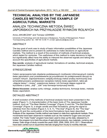 Journal of Central European Agriculture, 2013, 14(1), p.192-202 DOI: 10.5513/JCEA01/14.1.1181 TECHNICAL ANALYSIS BY THE JAPANESE CANDLES METHOD ON THE EXAMPLE OF AGRICULTURAL MARKETS ANALIZA TECHNICZNA METODĄ ŚWIEC JAPOŃSKICH NA PRZYKŁADZIE RYNKÓW ROLNYCH Anna JAKUBCZAK* and Tomasz UZARSKI University of Technology and Life Sciences in Bydgoszcz, Faculty of Management, Poland *Corresponding author: tel. +487 93 12 06 77; e-mail: [email protected] ABSTRACT The key goal of work was to study of basic information possibilities of the Japanese Candles method and to present its usefulness to make decisions on agricultural markets. The method is a result of the evolution of methods of technical analysis, which lasted for centuries. The usefulness of this method to make decisions is high, but significantly affect have the ability to interpret the observed signals and taking into account the specificities of agricultural markets. Key words: analysis of agricultural market, formations of candles, technical analysis, the Japanese Candles method. STRESZCZENIE Celem opracowania było zbadanie podstawowych możliwości informacyjnych metody świec japońskich oraz przedstawienie jej przydatności do podejmowania decyzji na rynkach rolnych. Zaprezentowano zwięzłą ewolucję metod analizy technicznej oraz scharakteryzowano podstawowe narzędzia metody świec japońskich, takie jak „objęcie bessy” i „hossy”, pojedyncze świece i ich formacje dające sygnał do wycofania z rynku, „doji” , „luki” oraz formacje kontynuacji trendu. Słowa kluczowe: analiza rynku rolnego, analiza techniczna, formacje świec, metoda Świec Japońskich. DETAILED ABSTRACT A brief evolution of the methods of technical analysis have been presented in the paper (Figure 1). A characterization of the basic tools of The Japanese Candle method, such as "The Bear Market Coverage" (Figure 2) and the "The Bull Market Coverage" (Figure 3), a single candle and their formations, giving the signal to withdraw from the market (Figure 4, 5, 6, 7), "The Doji" (Figure 8), the "The Gap" (Figure 9) and the continuation of the trend formations have been described. Analysis of the Japanese Candle method was based on data from agricultural markets. Price movements have been observed in markets such as: the market for sugar cane and pork market. The "meta Trader" program have been used to draw up the data, released by Xbroker, the program is to track the prices of agricultural products, raw materials, currency and shares. Date range of study covered the years 2005, 2006, 2009, 2010, 2011. Observations have been carried out on equal time intervals ranging from hourly to monthly intervals. 192 Jakubczak and Uzarski: Technical Analysis By The Japanese Candles Method On The Example O... Evolution of technical analysis tools towards the creation of a Japanese Candle allows for an easier reception of many important information to decision-making. A single candle informational signal is amplified by the presence of groups of candles in various systems, called formations. Creating a specific system of candles gives boost to investors in the market. Their reaction causes further movement that occurs in the direction formed by the signal. Interpretation of changes in prices on agricultural markets is difficult because of the interference of appearing trends formed by random factors such as weather conditions and seasonality of agricultural production. Informative value of the Japanese Candles method depends on its fit to the kind of "player" and the specifics of the market. Success of investors which use the tools of technical analysis depends on many factors including the ability to interpret the observed changes, market knowledge and experience. WSTĘP W podejmowaniu decyzji o inwestowaniu na rynkach, również na rynkach produktów rolnych, istotne są dwa rodzaje uzupełniających się metod, które sięgają do różnych źródeł informacji. Do pierwszej grupy należą metody analizy fundamentalnej, w której wykorzystywane są informacje niesione przez wskaźniki makroekonomiczne, analizy branżowe, czy raporty ogłaszane przez spółki. Druga grupa metod obejmuje analizę techniczną, której podstawowym zadaniem jest prognoza przyszłych poziomów cen na podstawie ich ruchów w przeszłości. Metody analizy technicznej rozwijały się przez wieki. Dodawano nowe wskaźniki oraz sposoby przedstawienia ruchów cen, czyli formy przekazywania informacji istotnych do analizy (Murphy, 2008). Obecnie dzięki wykorzystaniu platform inwestycyjnych, każdy zainteresowany może zawierać transakcje, nabywając odpowiednie narzędzia bazowe oraz instrumenty pochodne. Wykorzystanie nawet prostych narzędzi, do których zalicza się linie wsparcia i oporu (Kochan, 2006), formacje kontynuacji trendu oraz jego zmiany, a także sygnały z wskaźników, wymaga umiejętności interpretacji tworzących się sygnałów. Na samym początku informacje o zmianie cen lub też wielkości sprzedaży, były skrzętnie notowane i nanoszone na wykresy. Postęp techniczny oraz ewolucja metod analizy technicznej wprowadził wiele udogodnień, dzięki nim systemy automatycznie tworzą wykresy w zadanych interwałach czasowych, a nawet podejmują decyzje w imieniu inwestorów po wcześniejszym ustaleniu warunków. Wzrost szybkości przepływu pieniędzy wymusił na inwestorach stworzenie równie szybkich systemów do analiz wielkości wolumenu sprzedaży oraz obserwowania rynku w coraz krótszych interwałach czasu. Podejmując się analiz parametrów rynkowych należy pamiętać o tym, że rynek dyskontuje każdą informację, tzn. poddawana jest, przez uczestników rynku, ocenie jej wartość w odniesieniu do danych fundamentalnych, w wyniku tego np. ceny podlegają trendom (Śliwa, 2009). Naukowcy z zakresu analizy technicznej, próbowali ustalić pewne prawidłowości i zasady funkcjonowania rynków. Na przykład autor o nazwisku Dow po przeprowadzonych obserwa