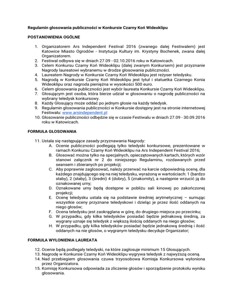 Regulamin głosowania publiczności w Konkursie Czarny Koń Wideoklipu POSTANOWIENIA OGÓLNE 1. Organizatorem Ars Independent Festival 2016 (zwanego dalej Festiwalem) jest Katowice Miasto Ogrodów - Instytucja Kultury im. Krystyny Bochenek, zwana dalej Organizatorem. 2. Festiwal odbywa się w dniach 27.09 - 02.10.2016 roku w Katowicach. 3. Celem Konkursu Czarny Koń Wideoklipu (dalej zwanym Konkursem) jest przyznanie Nagrody laureatowi wybranemu w drodze głosowania publiczności. 4. Laureatem Nagrody w Konkursie Czarny Koń Wideoklipu jest reżyser teledysku. 5. Nagrodą w Konkursie Czarny Koń Wideoklipu jest tytuł i statuetka Czarnego Konia Wideoklipu oraz nagroda pieniężna w wysokości 500 euro. 6. Celem głosowania publiczności jest wybór laureata Konkursie Czarny Koń Wideoklipu. 7. Głosującym jest osoba, która bierze udział w głosowaniu o nagrodę publiczności na wybrany teledysk konkursowy. 8. Każdy Głosujący może oddać po jednym głosie na każdy teledysk. 9. Regulamin głosowania publiczności w Konkursie dostępny jest na stronie internetowej Festiwalu: www.arsindependent.pl 10. Głosowanie publiczności odbędzie się w czasie Festiwalu w dniach 27.09 - 30.09.2016 roku w Katowicach. FORMUŁA GŁOSOWANIA 11. Ustala się następujące zasady przyznawania Nagrody: A. Ocenie publiczności podlegają tylko teledyski konkursowe, prezentowane w ramach Konkursu Czarny Koń Wideoklipu na Ars Independent Festival 2016; B. Głosować można tylko na specjalnych, opieczętowanych kartach, których wzór stanowi załącznik nr 2 do niniejszego Regulaminu, rozdawanych przed seansem i zbieranych po projekcji; C. Aby poprawnie zagłosować, należy przerwać na karcie odpowiednią ocenę, dla każdego znajdującego się na niej teledysku, wyrażoną w wartościach: 1 (bardzo słaby), 2 (słaby), 3 (średni) 4 (dobry), 5 (znakomity), a następnie wrzucić ją do oznakowanej urny; D. Oznakowane urny będą dostępne w pobliżu sali kinowej po zakończonej projekcji; E. Ocenę teledysku ustala się na podstawie średniej arytmetycznej – sumując wszystkie oceny przyznane teledyskowi i dzieląc je przez ilość oddanych na niego głosów; F. Ocena teledysku jest zaokrąglana w górę, do drugiego miejsca po przecinku; G. W przypadku, gdy kilka teledysków posiadać będzie jednakową średnią, za wygrany uznaje się teledysk z większą ilością oddanych na niego głosów; H. W przypadku, gdy kilka teledysków posiadać będzie jednakową średnią i ilość oddanych na nie głosów, o wygranym teledysku decyduje Organizator; FORMUŁA WYŁONIENIA LAUREATA 12. Ocenie będą podlegały teledyski, na które zagłosuje minimum 15 Głosujących. 13. Nagrodę w Konkursie Czarny Koń Wideoklipu wygrywa teledysk z najwyższą oceną. 14. Nad przebiegiem głosowania czuwa trzyosobowa Komisja Konkursowa wyłoniona przez Organizatora. 15. Komisję Konkursowa odpowiada za zliczenie głosów i sporządzenie protokołu wyniku głosowania. 16. Protokół wyniku głosowania musi zostać zaakceptowany przez Organizatora. 17. Wyniki głosowania zostaną ogłoszone na zamknięciu Festiwalu oraz zamieszczone na stronie internetowej Festiwalu i Organizatora. Po rozstrzygnięciu głosowania w Konkursie, każdy z laureatów zostanie poinformowany nie później 24 godziny od akceptacji protokołu wyników głosowania. 18. Nagroda dla Laureata w wyniku głosowania Konkursu Czarny Koń Wideoklipu zostanie wręczona podczas zamknięcia Festiwalu, które odbędzie się w dniu 02.10.2016 roku. POSTANOWIENIA KOŃCOWE 19. We wszystkich sprawach nieobjętych niniejszym Regulaminem decyduje Organizator reprezentowany przez Dyrektora Festiwalu. 20. W przypadku jakichkolwiek wątpliwości za obowiązującą uznaje się polską wersję regulaminu. 21. Organizator nie ponosi odpowiedzialności za udział w głosowaniu niezgodny z postanowieniami niniejszego Regulaminu i szkody tym spowodowane. 22. Organizator zastrzega sobie prawo do zmiany Regulaminu w razie zmiany przepisów prawnych lub innej ważnej przyczyny. Wszelkie zmiany niniejszego regulaminu zostaną ogłoszone na stronie Festiwalu: www.arsindependent.pl 23. Niniejszy Regulamin wchodzi w życie z dniem 27.09.2016 roku i jest udostępniony do wglądu w siedzibie Organizatora, pod adresem plac Sejmu Śląskiego 2, 40-032 Katowice oraz na stronie internetowej Festiwalu: www.arsindependent.pl 24. Ostatecznym warunkiem przyznania nagrody w Konkursie Czarny Koń Wideoklipu jest akceptacja Organizatora. 25. Wszelkie kwestie nieobjęte niniejszym regulaminem rozpatrywane będą w świetle polskiego prawa. 26. Wszelkie spory prawne rozstrzyga właściwy miejscowo i rzeczowo Sąd dla siedziby Organizatora.