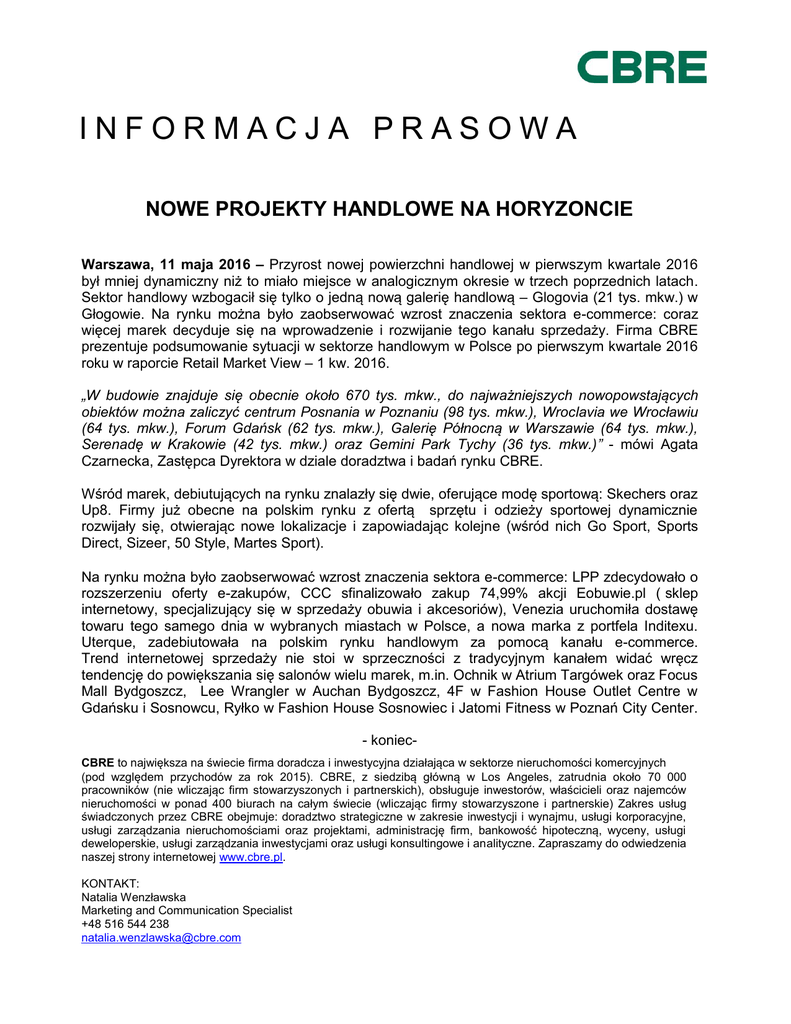 INFORMACJA PRASOWA NOWE PROJEKTY HANDLOWE NA HORYZONCIE Warszawa, 11 maja 2016 – Przyrost nowej powierzchni handlowej w pierwszym kwartale 2016 był mniej dynamiczny niż to miało miejsce w analogicznym okresie w trzech poprzednich latach. Sektor handlowy wzbogacił się tylko o jedną nową galerię handlową – Glogovia (21 tys. mkw.) w Głogowie. Na rynku można było zaobserwować wzrost znaczenia sektora e-commerce: coraz więcej marek decyduje się na wprowadzenie i rozwijanie tego kanału sprzedaży. Firma CBRE prezentuje podsumowanie sytuacji w sektorze handlowym w Polsce po pierwszym kwartale 2016 roku w raporcie Retail Market View – 1 kw. 2016. „W budowie znajduje się obecnie około 670 tys. mkw., do najważniejszych nowopowstających obiektów można zaliczyć centrum Posnania w Poznaniu (98 tys. mkw.), Wroclavia we Wrocławiu (64 tys. mkw.), Forum Gdańsk (62 tys. mkw.), Galerię Północną w Warszawie (64 tys. mkw.), Serenadę w Krakowie (42 tys. mkw.) oraz Gemini Park Tychy (36 tys. mkw.)” - mówi Agata Czarnecka, Zastępca Dyrektora w dziale doradztwa i badań rynku CBRE. Wśród marek, debiutujących na rynku znalazły się dwie, oferujące modę sportową: Skechers oraz Up8. Firmy już obecne na polskim rynku z ofertą sprzętu i odzieży sportowej dynamicznie rozwijały się, otwierając nowe lokalizacje i zapowiadając kolejne (wśród nich Go Sport, Sports Direct, Sizeer, 50 Style, Martes Sport). Na rynku można było zaobserwować wzrost znaczenia sektora e-commerce: LPP zdecydowało o rozszerzeniu oferty e-zakupów, CCC sfinalizowało zakup 74,99% akcji Eobuwie.pl ( sklep internetowy, specjalizujący się w sprzedaży obuwia i akcesoriów), Venezia uruchomiła dostawę towaru tego samego dnia w wybranych miastach w Polsce, a nowa marka z portfela Inditexu. Uterque, zadebiutowała na polskim rynku handlowym za pomocą kanału e-commerce. Trend internetowej sprzedaży nie stoi w sprzeczności z tradycyjnym kanałem widać wręcz tendencję do powiększania się salonów wielu marek, m.in. Ochnik w Atrium Targówek oraz Focus Mall Bydgoszcz, Lee Wrangler w Auchan Bydgoszcz, 4F w Fashion House Outlet Centre w Gdańsku i Sosnowcu, Ryłko w Fashion House Sosnowiec i Jatomi Fitness w Poznań City Center. - koniecCBRE to największa na świecie firma doradcza i inwestycyjna działająca w sektorze nieruchomości komercyjnych (pod względem przychodów za rok 2015). CBRE, z siedzibą główną w Los Angeles, zatrudnia około 70 000 pracowników (nie wliczając firm stowarzyszonych i partnerskich), obsługuje inwestorów, właścicieli oraz najemców nieruchomości w ponad 400 biurach na całym świecie (wliczając firmy stowarzyszone i partnerskie) Zakres usług świadczonych przez CBRE obejmuje: doradztwo strategiczne w zakresie inwestycji i wynajmu, usługi korporacyjne, usługi zarządzania nieruchomościami oraz projektami, administrację firm, bankowość hipoteczną, wyceny, usługi deweloperskie, usługi zarządzania inwestycjami oraz usługi konsultingowe i analityczne. Zapraszamy do odwiedzenia naszej strony internetowej www.cbre.pl. KONTAKT: Natalia Wenzławska Marketing and Communication Specialist +48 516 544 238 [email protected]