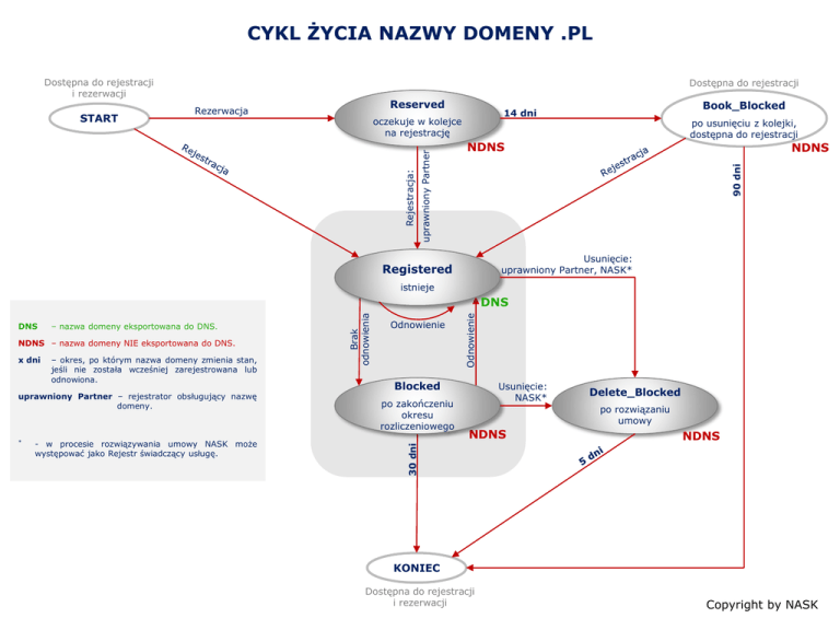 CYKL ŻYCIA NAZWY DOMENY .PL Dostępna do rejestracji i rezerwacji Reserved Rezerwacja po usunięciu z kolejki, dostępna do rejestracji NDNS NDNS 90 dni Rejestracja: Book_Blocked 14 dni oczekuje w kolejce na rejestrację uprawniony Partner START Dostępna do rejestracji Usunięcie: uprawniony Partner, NASK* Registered istnieje NDNS – nazwa domeny NIE eksportowana do DNS. x dni – okres, po którym nazwa domeny zmienia stan, jeśli nie została wcześniej zarejestrowana lub odnowiona. uprawniony Partner – rejestrator obsługujący nazwę domeny. * - w procesie rozwiązywania umowy NASK może występować jako Rejestr świadczący usługę. Odnowienie Odnowienie – nazwa domeny eksportowana do DNS. Blocked po zakończeniu okresu rozliczeniowego Usunięcie: NASK* Delete_Blocked po rozwiązaniu umowy NDNS NDNS 30 dni DNS Brak odnowienia DNS KONIEC Dostępna do rejestracji i rezerwacji Copyright by NASK