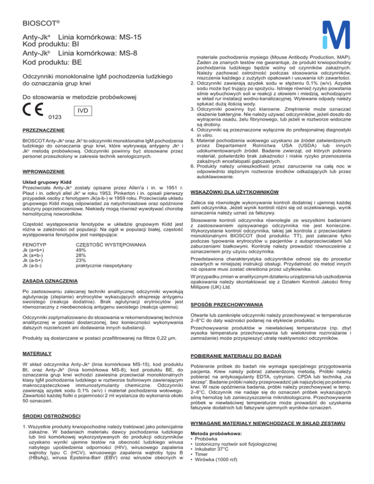 BIOSCOT® Anty-Jka Linia komórkowa: MS-15 Kod produktu: BI Anty-Jkb Linia komórkowa: MS-8 Kod produktu: BE Odczynniki monoklonalne IgM pochodzenia ludzkiego do oznaczania grup krwi Do stosowania w metodzie probówkowej C 0123 IVD PRZEZNACZENIE BIOSCOT Anty-Jka oraz Jkb to odczynniki monoklonalne IgM pochodzenia ludzkiego do oznaczania grup krwi, które wykrywają antygeny Jka i Jkb metodą probówkową. Odczynniki powinny być stosowane przez personel przeszkolony w zakresie technik serologicznych. WPROWADZENIE Układ grupowy Kidd Przeciwciała Anty-Jka zostały opisane przez Allen'a i in. w 1951 r. Plaut i in. odkryli allel Jkb w roku 1953. Pinkerton i in. opisali pierwszy przypadek osoby z fenotypem Jk(a-b-) w 1959 roku. Przeciwciała układu grupowego Kidd mogą odpowiadać za natychmiastowe oraz opóźnione odczyny poprzetoczeniowe. Niekiedy mogą również wywoływać chorobę hemolityczną noworodków. Częstość występowania fenotypów w układzie grupowym Kidd jest różna w zależności od populacji: Na ogół w populacji białej, częstość występowania fenotypów jest następująca: FENOTYP Jk (a+b+) Jk (a+b-) Jk (a-b+) Jk (a-b-) CZĘSTOŚĆ WYSTĘPOWANIA 49% 28% 23% praktycznie niespotykany ZASADA OZNACZENIA Po zastosowaniu zalecanej techniki analitycznej odczynniki wywołują aglutynację (zlepianie) erytrocytów wykazujących ekspresję antygenu swoistego (reakcja dodatnia). Brak aglutynacji erytrocytów jest równoznaczny z nieobecnością antygenu swoistego (reakcja ujemna). Odczynniki zoptymalizowano do stosowania w rekomendowanej technice analitycznej w postaci dostarczonej, bez konieczności wykonywania dalszych rozcieńczeń ani dodawania innych substancji. Produkty są dostarczane w postaci przefiltrowanej na filtrze 0,22 μm. MATERIAŁY materiale pochodzenia mysiego (Mouse Antibody Production, MAP). Żaden ze znanych testów nie gwarantuje, że produkt krwiopochodny pochodzenia ludzkiego będzie wolny od czynników zakaźnych. Należy zachować ostrożność podczas stosowania odczynników, niszczenia każdego z zużytych opakowań i usuwania ich zawartości. 2. Odczynniki zawierają azydek sodu w stężeniu 0,1% (w/v). Azydek sodu może być trujący po spożyciu. Istnieje również ryzyko powstania silnie wybuchowych soli w reakcji z ołowiem i miedzią, wchodzącymi w skład rur instalacji wodno-kanalizacyjnej. Wylewane odpady należy spłukać dużą ilością wody. 3. Odczynniki powinny być klarowne. Zmętnienie może oznaczać skażenie bakteryjne. Nie należy używać odczynników, jeżeli doszło do wytrącenia osadu, żelu fibrynowego, lub jeżeli w roztworze widoczne są drobiny. 4. Odczynniki są przeznaczone wyłącznie do profesjonalnej diagnostyki in vitro. 5. Materiał pochodzenia wołowego uzyskano ze źródeł zatwierdzonych przez Departament Rolnictwa USA (USDA) lub innych udokumentowanych źródeł. Badanie zwierząt, od których pobrano materiał, potwierdziło brak zakaźności i niskie ryzyko przenoszenia zakaźnych encefalopatii gąbczastych. 6. Produkty należy unieszkodliwić przez zanurzenie na całą noc w odpowiednio stężonym roztworze środków odkażających lub przez autoklawowanie. WSKAZÓWKI DLA UŻYTKOWNIKÓW Zaleca się równoległe wykonywanie kontroli dodatniej i ujemnej każdej serii odczynnika. Jeżeli wynik kontroli różni się od oczekiwanego, wynik oznaczenia należy uznać za fałszywy. Stosowanie kontroli odczynnika równolegle ze wszystkimi badaniami z zastosowaniem opisywanego odczynnika nie jest konieczne. Wykorzystanie kontroli odczynnika, takiej jak kontrola z przeciwciałami monoklonalnymi BIOSCOT (kod produktu: TT), jest zalecane tylko podczas typowania erytrocytów u pacjentów z autoprzeciwciałami lub zaburzeniami białkowymi. Kontrolę należy prowadzić równocześnie z oznaczeniem przy użyciu odczynnika. Przedstawiona charakterystyka odczynników odnosi się do procedur zawartych w niniejszej instrukcji obsługi. Przydatność do metod innych niż opisane musi zostać określona przez użytkownika. W przypadku zmian w analitycznym działaniu urządzenia lub uszkodzenia opakowania należy skontaktować się z Działem Kontroli Jakości firmy Millipore (UK) Ltd. SPOSÓB PRZECHOWYWANIA Otwarte lub zamknięte odczynniki należy przechowywać w temperaturze 2–8°C do daty ważności podanej na etykiecie produktu. Przechowywanie produktów w niewłaściwej temperaturze (np. zbyt wysoka temperatura przechowywania lub wielokrotne rozmrażanie i zamrażanie) może przyspieszyć utratę reaktywności odczynników. POBIERANIE MATERIAŁU DO BADAŃ W skład odczynnika Anty-Jk (linia komórkowa MS-15), kod produktu BI, oraz Anty-Jkb (linia komórkowa MS-8), kod produktu BE, do oznaczania grup krwi wchodzi zawiesina przeciwciał monoklonalnych klasy IgM pochodzenia ludzkiego w roztworze buforowym zawierającym makrocząsteczkowe immunostymulanty chemiczne. Odczynniki zawierają azydek sodu 0,1% (w/v) i materiał pochodzenia wołowego. Zawartość każdej fiolki o pojemności 2 ml wystarcza do wykonania około 50 oznaczeń. a Pobieranie próbek do badań nie wymaga specjalnego przygotowania pacjenta. Krew należy pobrać zatwierdzoną metodą. Próbki należy pobierać na antykoagulanty EDTA, cytrynian, CPDA lub techniką „na skrzep”. Badanie próbki należy przeprowadzić jak najszybciej po pobraniu krwi. W razie opóźnienia badania, próbki należy przechowywać w temp. 2–8°C. Odczynnik nie nadaje się do oznaczeń próbek wykazujących silną hemolizę lub zanieczyszczenia mikrobiologiczne. Przechowywanie próbek w niewłaściwej temperaturze może prowadzić do uzyskania fałszywie dodatnich lub fałszywie ujemnych wyników oznaczeń. ŚRODKI OSTROŻNOŚCI 1. Wszystkie produkty krwiopochodne należy traktować jako potencjalnie zakaźne. W badaniach materiału dawcy pochodzenia ludzkiego lub linii komórkowej wykorzystywanych do produkcji odczynników uzyskano wyniki ujemne testów na obecność ludzk