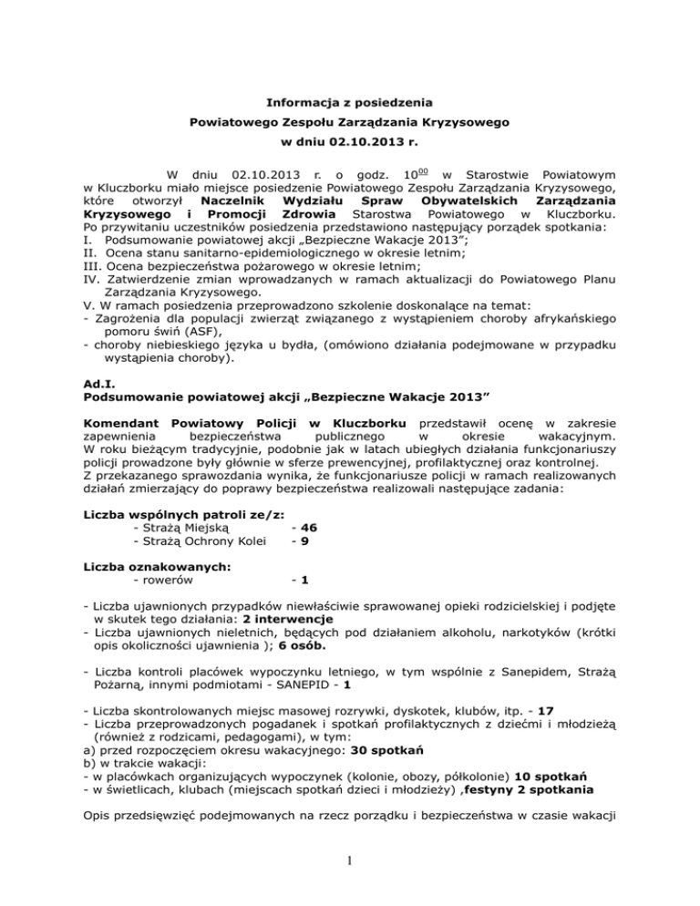 Informacja z posiedzenia Powiatowego Zespołu Zarządzania Kryzysowego w dniu 02.10.2013 r. W dniu 02.10.2013 r. o godz. 1000 w Starostwie Powiatowym w Kluczborku miało miejsce posiedzenie Powiatowego Zespołu Zarządzania Kryzysowego, które otworzył Naczelnik Wydziału Spraw Obywatelskich Zarządzania Kryzysowego i Promocji Zdrowia Starostwa Powiatowego w Kluczborku. Po przywitaniu uczestników posiedzenia przedstawiono następujący porządek spotkania: I. Podsumowanie powiatowej akcji „Bezpieczne Wakacje 2013”; II. Ocena stanu sanitarno-epidemiologicznego w okresie letnim; III. Ocena bezpieczeństwa pożarowego w okresie letnim; IV. Zatwierdzenie zmian wprowadzanych w ramach aktualizacji do Powiatowego Planu Zarządzania Kryzysowego. V. W ramach posiedzenia przeprowadzono szkolenie doskonalące na temat: - Zagrożenia dla populacji zwierząt związanego z wystąpieniem choroby afrykańskiego pomoru świń (ASF), - choroby niebieskiego języka u bydła, (omówiono działania podejmowane w przypadku wystąpienia choroby). Ad.I. Podsumowanie powiatowej akcji „Bezpieczne Wakacje 2013” Komendant Powiatowy Policji w Kluczborku przedstawił ocenę w zakresie zapewnienia bezpieczeństwa publicznego w okresie wakacyjnym. W roku bieżącym tradycyjnie, podobnie jak w latach ubiegłych działania funkcjonariuszy policji prowadzone były głównie w sferze prewencyjnej, profilaktycznej oraz kontrolnej. Z przekazanego sprawozdania wynika, że funkcjonariusze policji w ramach realizowanych działań zmierzający do poprawy bezpieczeństwa realizowali następujące zadania: Liczba wspólnych patroli ze/z: - Strażą Miejską - 46 - Strażą Ochrony Kolei -9 Liczba oznakowanych: - rowerów -1 - Liczba ujawnionych przypadków niewłaściwie sprawowanej opieki rodzicielskiej i podjęte w skutek tego działania: 2 interwencje - Liczba ujawnionych nieletnich, będących pod działaniem alkoholu, narkotyków (krótki opis okoliczności ujawnienia ); 6 osób. - Liczba kontroli placówek wypoczynku letniego, w tym wspólnie z Sanepidem, Strażą Pożarną, innymi podmiotami - SANEPID - 1 - Liczba skontrolowanych miejsc masowej rozrywki, dyskotek, klubów, itp. - 17 - Liczba przeprowadzonych pogadanek i spotkań profilaktycznych z dziećmi i młodzieżą (również z rodzicami, pedagogami), w tym: a) przed rozpoczęciem okresu wakacyjnego: 30 spotkań b) w trakcie wakacji: - w placówkach organizujących wypoczynek (kolonie, obozy, półkolonie) 10 spotkań - w świetlicach, klubach (miejscach spotkań dzieci i młodzieży) ,festyny 2 spotkania Opis przedsięwzięć podejmowanych na rzecz porządku i bezpieczeństwa w czasie wakacji 1 (krótka charakterystyka działań wraz z osiągniętymi wynikami, ilością uczestników). Policjanci Komendy Powiatowej Policji w Kluczborku podczas wakacji w toku codziennej służby dokonywali systematycznych kontroli stałych miejsc grupowania się dzieci i młodzieży, głównie parki, skwery, tereny przyszkolne itp., gdyż w tych miejscach dochodzi najczęściej do zakłóceń spoczynku nocnego , ładu i porządku czy też uszkodzeń mienia. Ponadto mając na uwadze kontynuację ogólnopolskiej kampanii edukacyjnej „Pozory mylą - dowód nie” – której głównym celem jest edukacja sprzedawców napojów alkoholowych poprzez zwracanie uwagi, że dorosły wygląd klienta nie oznacza pełnoletniości. Funkcjonariusze tut. KPP, a szczególnie dzielnicowi mając na uwadze przepisy Ustawy o wychowaniu w trzeźwości kontrolowali systematycznie placówki handlowe sprzedające alkohol. Podczas kontroli nie ujawniono nieprawidłowości. Przy okazji tych kontroli przypomniano właścicielom i pracownikom w/w sklepów o zakazie sprzedaży napojów alkoholowych i wyrobów tytoniowych osobom poniżej 18 roku życia. W okresie dwóch miesięcy wakacyjnych na terenie powiatu kluczborskiego ujawniono ogółem 6 osób niepełnoletnich będących pod wpływem alkoholu. Bezpośrednio przed wakacjami na terenie powiatu kluczborskiego realizowano spotkania z dziećmi i młodzieżą szkół podstawowych i gimnazjalnych jak również najmłodszymi wychowankami przedszkoli. Spotkania te miały na celu podniesienie świadomości z zakresu bezpieczeństwa w ruchu drogowym jak również przypomnienie o zachowaniu bezpieczeństwa w trakcie beztroskiego odpoczynku w domu, na podwórku czy też podczas pobytu nad wodą. W trakcie spotkań z młodzieżą przypomniano również o odpowiedzialności prawnej w myśl „ Ustawy o postępowaniu w sprawach nieletnich” i konsekwencjach prawnych wszelkich zachowań ryzykownych. Trzeciego lipca 2013 roku Asystent ds. Nieletnich i Patologii Komendy Powiatowej w Kluczborku przeprowadził spotkania z dziećmi oraz młodzieżą przebywającą na kolonii znajdującej się na terenie polsko - czeskiego Centrum Szkolenia Rycerskiego w Biskupicach – Brzóskach. Na turnusie przebywały dzieci z Polski i Czech – łącznie 46 osób w wieku 10 - 18 lat .W trakcie tego spotkania zostały przypomniane zasady bezpiecznego wypoczynku oraz poruszania się po drogach. Został również zaprezentowany radiowóz policyjny wraz ze sprzętem. W dniu 12 lipca 2013 roku funkcjonariusze Komendy Powiatowej Policji w Kluczborku gościli dzieci z półkolonii Młodzieżowego Domu Kultury w Kluczborku. W trakcie tej wizyty dzieci oprócz przypomnienia wiedzy teoretycznej na temat bezpiecznego zachowania w domu, na podwórku czy też nad wodą miały możliwość zapoznania się z bliska z radiowozem, motocyklem jak również mogły zwiedzić osobiście pomieszczenia dla osób zatrzymanych. W dniu 09 lipca 2013 roku odbyło się spotkanie z najmłodszymi uczestnikami półkolonii letniej zorganizowanej przez Świetlicę Socjoterapeutyczna PARASOL w Kluczborku. W trakcie tego spotkania zostały przypomniane zasady bezpiecznego wypoczynku, prawidłowego zachowania się wobec osób nieznajomych przyjęcia właściwej postawy wobec atakującego psa itp. Dzielnicowi Poste