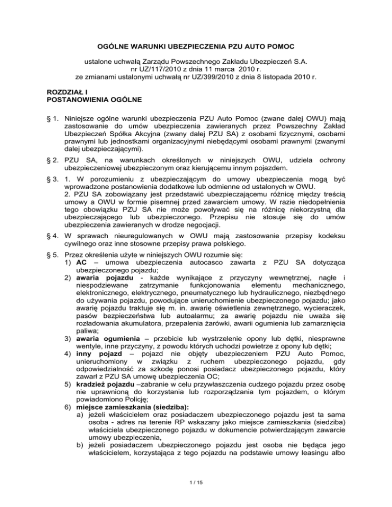 OGÓLNE WARUNKI UBEZPIECZENIA PZU AUTO POMOC ustalone uchwałą Zarządu Powszechnego Zakładu Ubezpieczeń S.A. nr UZ/117/2010 z dnia 11 marca 2010 r. ze zmianami ustalonymi uchwałą nr UZ/399/2010 z dnia 8 listopada 2010 r. ROZDZIAŁ I POSTANOWIENIA OGÓLNE § 1. Niniejsze ogólne warunki ubezpieczenia PZU Auto Pomoc (zwane dalej OWU) mają zastosowanie do umów ubezpieczenia zawieranych przez Powszechny Zakład Ubezpieczeń Spółka Akcyjna (zwany dalej PZU SA) z osobami fizycznymi, osobami prawnymi lub jednostkami organizacyjnymi niebędącymi osobami prawnymi (zwanymi dalej ubezpieczającymi). § 2. PZU SA, na warunkach określonych w niniejszych OWU, udziela ochrony ubezpieczeniowej ubezpieczonym oraz kierującemu innym pojazdem. § 3. 1. W porozumieniu z ubezpieczającym do umowy ubezpieczenia mogą być wprowadzone postanowienia dodatkowe lub odmienne od ustalonych w OWU. 2. PZU SA zobowiązany jest przedstawić ubezpieczającemu różnicę między treścią umowy a OWU w formie pisemnej przed zawarciem umowy. W razie niedopełnienia tego obowiązku PZU SA nie może powoływać się na różnicę niekorzystną dla ubezpieczającego lub ubezpieczonego. Przepisu nie stosuje się do umów ubezpieczenia zawieranych w drodze negocjacji. § 4. W sprawach nieuregulowanych w OWU mają zastosowanie przepisy kodeksu cywilnego oraz inne stosowne przepisy prawa polskiego. § 5. Przez określenia użyte w niniejszych OWU rozumie się: 1) AC – umowa ubezpieczenia autocasco zawarta z PZU SA dotycząca ubezpieczonego pojazdu; 2) awaria pojazdu - każde wynikające z przyczyny wewnętrznej, nagłe i niespodziewane zatrzymanie funkcjonowania elementu mechanicznego, elektronicznego, elektrycznego, pneumatycznego lub hydraulicznego, niezbędnego do używania pojazdu, powodujące unieruchomienie ubezpieczonego pojazdu; jako awarię pojazdu traktuje się m. in. awarię oświetlenia zewnętrznego, wycieraczek, pasów bezpieczeństwa lub autoalarmu; za awarię pojazdu nie uważa się rozładowania akumulatora, przepalenia żarówki, awarii ogumienia lub zamarznięcia paliwa; 3) awaria ogumienia – przebicie lub wystrzelenie opony lub dętki, niesprawne wentyle, inne przyczyny, z powodu których uchodzi powietrze z opony lub dętki; 4) inny pojazd – pojazd nie objęty ubezpieczeniem PZU Auto Pomoc, unieruchomiony w związku z ruchem ubezpieczonego pojazdu, gdy odpowiedzialność za szkodę ponosi posiadacz ubezpieczonego pojazdu, który zawarł z PZU SA umowę ubezpieczenia OC; 5) kradzież pojazdu –zabranie w celu przywłaszczenia cudzego pojazdu przez osobę nie uprawnioną do korzystania lub rozporządzania tym pojazdem, o którym powiadomiono Policję; 6) miejsce zamieszkania (siedziba): a) jeżeli właścicielem oraz posiadaczem ubezpieczonego pojazdu jest ta sama osoba - adres na terenie RP wskazany jako miejsce zamieszkania (siedziba) właściciela ubezpieczonego pojazdu w dokumencie potwierdzającym zawarcie umowy ubezpieczenia, b) jeżeli posiadaczem ubezpieczonego pojazdu jest osoba nie będąca jego właścicielem, korzystająca z tego pojazdu na podstawie umowy leasingu albo 1 / 15 najemca, albo kredytobiorca, któremu bank oddał przewłaszczony pojazd do używania – adres na terenie RP wskazany jako miejsce zamieszkania (siedziba) posiadacza ubezpieczonego pojazdu w dokumencie potwierdzającym zawarcie umowy ubezpieczenia; 7) naprawa na miejscu zdarzenia - usunięcie usterki technicznej przez służby drogowe (techniczne) w zakresie niezbędnym do kontynuowania jazdy, bez konieczności holowania pojazdu do warsztatu naprawczego; 8) OC – umowa obowiązkowego ubezpieczenia OC posiadaczy pojazdów mechanicznych zawarta z PZU SA dotycząca ubezpieczonego pojazdu; 9) ubezpieczony pojazd – pojazd określony w dokumencie potwierdzającym zawarcie umowy ubezpieczenia PZU Auto Pomoc; 10) przepalenie żarówki – całkowite zużycie żarówki świateł mijania, świateł hamowania, świateł tylnych, świateł cofania lub kierunkowskazu; 11) rozładowanie akumulatora – rozładowanie akumulatora z przyczyn nie wynikających z jego zużycia eksploatacyjnego, po którym możliwe jest jego doładowanie i dalsze użytkowanie bez konieczności ponownego doładowywania ze źródła zewnętrznego, tzn. pochodzącego z zewnątrz pojazdu; 12) ubezpieczony – kierowca lub pasażerowie ubezpieczonego pojazdu w liczbie określonej w dowodzie rejestracyjnym; 13) ubezpieczający – osoba zawierająca z PZU SA umowę ubezpieczenia (właściciel pojazdu zawierający umowę ubezpieczenia na własny rachunek albo inna osoba zawierająca umowę ubezpieczenia na rachunek właściciela pojazdu); 14) unieruchomienie pojazdu – brak możliwości poruszania się pojazdem w następstwie zdarzeń powodujących niewłaściwe funkcjonowanie pojazdu lub uniemożliwiające jazdę w sposób bezpieczny, lub zgodny z przepisami ruchu drogowego; 15) uraz ciała - uszkodzenia ciała zaistniałe wskutek wypadku lub innych zdarzeń związanych z ubezpieczonym pojazdem, tj. podczas wsiadania lub wysiadania z pojazdu, bezpośrednio przy jego załadunku lub wyładunku, podczas postoju i naprawy na trasie jazdy - zagrażające życiu kierowcy lub pasażera albo mogące spowodować w krótkim czasie poważne pogorszenie się ich stanu zdrowia, zagrażające ich życiu, jeżeli nie zostanie im szybko udzielona odpowiednia pomoc medyczna; 16) wypadek - zdarzenie, w wyniku którego ubezpieczony pojazd uległ uszkodzeniu lub zniszczeniu, które spowodowało jego unieruchomienie, z wyłączeniem kradzieży pojazdu i awarii; 17) zgon – śmierć kierowcy lub pasażera wskutek wypadku lub innych zdarzeń związanych z pojazdem, o których mowa w pkt 15; 18) PZU Pomoc – jednostka organizacyjna PZU SA świadcząca na rzecz ubezpieczonych usługi assistance określone w niniejszych OWU, do której ubezpieczony (lub osoba działająca w jego imieniu) zobowiązany jest zgłosić telefonicznie zdarzenie objęte ochroną ubezpieczeni