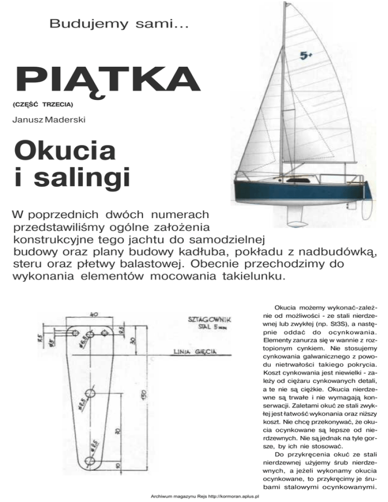 Budujemy sami... PIĄTKA (CZĘŚĆ TRZECIA) Janusz Maderski Okucia i salingi W poprzednich dwóch numerach przedstawiliśmy ogólne założenia konstrukcyjne tego jachtu do samodzielnej budowy oraz plany budowy kadłuba, pokładu z nadbudówką, steru oraz płetwy balastowej. Obecnie przechodzimy do wykonania elementów mocowania takielunku. Okucia możemy wykonać-zależnie od możliwości - ze stali nierdzewnej lub zwykłej (np. St3S), a następnie oddać do ocynkowania. Elementy zanurza się w wannie z roztopionym cynkiem. Nie stosujemy cynkowania galwanicznego z powodu nietrwałości takiego pokrycia. Koszt cynkowania jest niewielki - zależy od ciężaru cynkowanych detali, a te nie są ciężkie. Okucia nierdzewne są trwałe i nie wymagają konserwacji. Zaletami okuć ze stali zwykłej jest łatwość wykonania oraz niższy koszt. Nie chcę przekonywać, że okucia ocynkowane są lepsze od nierdzewnych. Nie są jednak na tyle gorsze, by ich nie stosować. Do przykręcenia okuć ze stali nierdzewnej użyjemy śrub nierdzewnych, a jeżeli wykonamy okucia ocynkowane, to przykręcimy je śrubami stalowymi ocynkowanymi. Archiwum magazynu Rejs http://kormoran.aplus.pl Wszystkie okucia należy przykręcić na przekładce z elastycznego tworzywa uszczelniającego (np. Sikaflex 292) - zabezpieczenie przed korozją elektrochemiczną. Jeżeli zamówimy gotowy takielunek, to producent prawdopodobnie zaproponuje swoje typowe oku- cia. Porównujemy wytrzymałość z oryginalnymi. Należy zwrócić uwagę, czy elementy połączenia masztu z bomem, mogące się przetrzeć, są wykonane ze stali. Okucia będą pasowane do profili ZML Kęty: maszty - A 5456 (92x70), bom - A4066 (74x62). Archiwum magazynu Rejs http://kormoran.aplus.pl - Okucia salingów i want kolumnowych wykonujemy z blachy 2 mm. Prostokąt o wymiarach 210 x 100 doginamy do kształtu profilu masztu. Wyginamy, docinamy i spawamy gniazda salingów. Należy zwrócić uwagę na zachowanie kątów podniesienia i odchylę- nią salingów. Pod przelotowe śruby mocujące M8 wiercimy otwory o średnicy 8,5 mm. Poniżej wykonujemy otwór pasowany do końcówki wanty. - Okucie sztagu i stenwant wykonujemy z blachy 2 mm. Prostokąt o wymiarach 154 x 70 doginamy do kształtu profilu masztu i wiercimy otwory pod śruby mocujące (8,5 mm) oraz dla zaczepienia stenwant i sztagu. - Podwieź wantową wycinamy z blachy 5 mm. Do kadłuba będzie ona przykręcona trzema śrubami M8, pod które wiercimy otwory o średnicy 8,5 mm. Górne fragmenty podwięzi odginamy tak, by pracowały w linii want. Bliższy dziobu zaczep stenwanty odginamy od płaszczyzny podwięzi o 3°, a zaczep wanty kolumnowej o 23°. Do kadłuba, tak jak do masztu, wszystkie okucia przykręcamy na przekładce z elastycznego uszczelniacza. -Sztagownik wycinamy z blachy 5 mm. Do dziobnicy będzie on przykręcony dwiema śrubami M8, pod które wiercimy otwory o średnicy 8,5 mm. Końcówkę odginamy od płaszczyzny okucia o kąt 20°, zgodnie z linią sztagu. - Okucie bomu. Bom nie ma możliwości obrotu. Ceownik przykręcimy do półki profilu bomu trzema śrubami M6 (otwory 8,5 mm). Otwory w pobliżu przegubu służą do montażu bloków wyprowadzających refliny i topenantę - pasujemy je do zakupionych bloków. Głównym elementem przegubu jest stalowa kostka 20 x 20 x 42 zaokrąglona na końcach. Przez nią przechodzą dwie śruby M10. Część przymasztowa okucia zostanie przykręcona do masztu przelotowe dwiema śrubami M6. - Okucie przymasztowe wyginamy lub spawamy z blachy 3 mm. Otwory w podstawie służą do przyArchiwum magazynu Rejs http://kormoran.aplus.pl kręcenia okucia do kadłuba. Przez otwór o średnicy 10,5 mm przejdzie śruba M10 łącząca okucie z masztem. Otwory 6 mm w obniżonej części okucia służą do zamontowania bloków prowadzących reflin, fałów i topenanty, - Saling wycinamy z deski dębowej lub jesionowej. Przyciętą li- stwę profilujemy za pomocą struga. Pasujemy końcówkę do gniazda w okuciu. Saling powinien wchodzić do gniazda z lekkim luzem, tak by mógł być osadzony na szczeliwo elastyczne. Zabezpieczamy saling przed wypadnięciem za pomocą przetyczki z drutu. Zewnętrzną końcówkę salingu okuwamy dwiema cienkimi blaszkami mosiężnymi. Pierwsza zabezpiecza drewno przed rozszczepieniem pod obciążeniem od wanty, a druga utrzymuje wantę w miejscu. Archiwum magazynu Rejs http://kormoran.aplus.pl