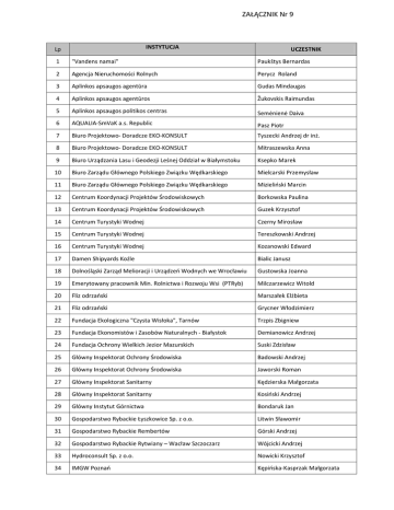 ZAŁĄCZNIK Nr 9 INSTYTUCJA Lp UCZESTNIK 1 "Vandens namai" Paukštys Bernardas 2 Agencja Nieruchomości Rolnych Perycz Roland 3 Aplinkos apsaugos agentūra Gudas Mindaugas 4 Aplinkos apsaugos agentūros Žukovskis Raimundas 5 Aplinkos apsaugos politikos centras Semėnienė Daiva 6 AQUALIA-SmVaK a.s. Republic Pasz Piotr 7 Biuro Projektowo- Doradcze EKO-KONSULT Tyszecki Andrzej dr inż. 8 Biuro Projektowo- Doradcze EKO-KONSULT Mitraszewska Anna 9 Biuro Urządzania Lasu i Geodezji Leśnej Oddział w Białymstoku Ksepko Marek 10 Biuro Zarządu Głównego Polskiego Związku Wędkarskiego Mielcarski Przemysław 11 Biuro Zarządu Głównego Polskiego Związku Wędkarskiego Mizieliński Marcin 12 Centrum Koordynacji Projektów Środowiskowych Borkowska Paulina 13 Centrum Koordynacji Projektów Środowiskowych Guzek Krzysztof 14 Centrum Turystyki Wodnej Czerny Mirosław 15 Centrum Turystyki Wodnej Tereszkowski Andrzej 16 Centrum Turystyki Wodnej Kozanowski Edward 17 Damen Shipyards Koźle Bialic Janusz 18 Dolnośląski Zarząd Melioracji i Urządzeń Wodnych we Wrocławiu Gustowska Joanna 19 Emerytowany pracownik Min. Rolnictwa i Rozwoju Wsi (PTRyb) Milczarzewicz Witold 20 Fliz odrzański Marszałek Elżbieta 21 Fliz odrzański Grycner Włodzimierz 22 Fundacja Ekologiczna "Czysta Wisłoka", Tarnów Trzpis Zbigniew 23 Fundacja Ekonomistów i Zasobów Naturalnych - Białystok Demianowicz Andrzej 24 Fundacja Ochrony Wielkich Jezior Mazurskich Suski Zdzisław 25 Główny Inspektorat Ochrony Środowiska Badowski Andrzej 26 Główny Inspektorat Ochrony Środowiska Jaworski Roman 27 Główny Inspektorat Sanitarny Kędzierska Małgorzata 28 Główny Inspektorat Sanitarny Kosiński Andrzej 29 Główny Instytut Górnictwa Bondaruk Jan 30 Gospodarstwo Rybackie Łyszkowice Sp. z o.o. Litwin Sławomir 31 Gospodarstwo Rybackie Rembertów Górski Andrzej 32 Gospodarstwo Rybackie Rytwiany – Wacław Szczoczarz Wójcicki Andrzej 33 Hydroconsult Sp. z o.o. Nowicki Krzysztof 34 IMGW Poznań Kępińska-Kasprzak Małgorzata ZAŁĄCZNIK Nr 9 INSTYTUCJA Lp UCZESTNIK 35 IMGW Warszawa Kędziora Wanda 36 IMGW Warszawa Legutko Łukasz 37 IMGW Wrocław Błachuta Jan 38 Instytut Melioracji i Użytków Zielonych Falenty Mioduszewski Waldemar 39 Instytut Ochrony Środowiska Błaszczyk Paweł 40 Instytut Ochrony Środowiska Soszka Hanna 41 Instytut Ochrony Środowiska Kolada Agnieszka 42 Instytut Rybactwa Śródlądowego Lirski Andrzej 43 Instytut Rybactwa Śródlądowego im. S. Sakowicza Wiśniewolski Wiesław 44 Izba Gospodarcza Wodociągi Polskie Tokarczuk Antoni 45 Krajowa Rada Gospodarki Wodnej Janusz Bielakowski 46 Krajowa Rada Gospodarki Wodnej Kledyński Zbigniew 47 Krajowe Forum Spółek Wodnych Surowiak Sylwia 48 Krajowe Forum Spółek Wodnych Wit Piotr 49 Krajowy Zarząd Gospodarki Wodnej Baczewska Katarzyna 50 Krajowy Zarząd Gospodarki Wodnej Bielakowska Wanda 51 Krajowy Zarząd Gospodarki Wodnej Dembowska Adriana 52 Krajowy Zarząd Gospodarki Wodnej Dębiec Barbara 53 Krajowy Zarząd Gospodarki Wodnej Gontarz Justyna 54 Krajowy Zarząd Gospodarki Wodnej Jabłońska Katarzyna 55 Krajowy Zarząd Gospodarki Wodnej Jóźków – Drążkowiak Marta 56 Krajowy Zarząd Gospodarki Wodnej Kania Justyna 57 Krajowy Zarząd Gospodarki Wodnej Karwowski Leszek 58 Krajowy Zarząd Gospodarki Wodnej Kęsy Robert 59 Krajowy Zarząd Gospodarki Wodnej Koszałka Małgorzata 60 Krajowy Zarząd Gospodarki Wodnej Koza Iwona 61 Krajowy Zarząd Gospodarki Wodnej Oleszczyk Anna 62 Krajowy Zarząd Gospodarki Wodnej Opęchowska Małgorzata 63 Krajowy Zarząd Gospodarki Wodnej Pawlak Agnieszka 64 Krajowy Zarząd Gospodarki Wodnej Piętowska Ewa 65 Krajowy Zarząd Gospodarki Wodnej Piórkowski Piotr 66 Krajowy Zarząd Gospodarki Wodnej Pytkowska Marta 67 Krajowy Zarząd Gospodarki Wodnej Rutkiewicz Piotr 68 Krajowy Zarząd Gospodarki Wodnej Rynkiewicz Alina ZAŁĄCZNIK Nr 9 INSTYTUCJA Lp UCZESTNIK 69 Krajowy Zarząd Gospodarki Wodnej Seliga Aleksandra 70 Krajowy Zarząd Gospodarki Wodnej Skowysz Aleksandra 71 Krajowy Zarząd Gospodarki Wodnej Tkaczewska Ewa 72 Krajowy Zarząd Gospodarki Wodnej Tomaszewski Łukasz 73 Krajowy Zarząd Gospodarki Wodnej Zabrzeńska – Chaterera Monika 74 Krajowy Zarząd Gospodarki Wodnej Zań Teresa 75 Krajowy Zarząd Gospodarki Wodnej Suszyńska Ewa 76 Kujawsko Pomorski Zarząd Melioracji i Urządzeń Wodnych Wilmanowicz Marian 77 Liga Morska i Rzeczna-Bractwo Wiślane Potapowicz Andrzej 78 Lubelski Ośrodek Doradztwa Rolniczego w Końskowoli Zając Zbigniew 79 Lubuski Urząd Wojewódzki w Gorzowie Wielkopolskim Tołkacz Bohdan 80 Lubuski Zarząd Melioracji i Urządzeń Wodnych Maciejak Jerzy 81 Mazowiecki Ośrodek Doradztwa Rolniczego w Warszawie Lech Krzysztof 82 Mazowiecki Ośrodek Doradztwa Rolniczego w Warszawie Samoraj Marta 83 MGGP S.A. Będkowski Michał 84 MGGP S.A. Grela Agnieszka 85 MGGP S.A. Gryboś Franciszek 86 MGGP S.A. Gumuła Maria 87 MGGP S.A. Hobot Agnieszka 88 MGGP S.A. Komosa Małgorzata 89 MGGP S.A. Paluszkiewicz Bartłomiej 90 MGGP S.A. Rajski Sławomir 91 MGGP S.A. Sabat Alicja 92 MGGP S.A./ UE Berbeka Krzysztof 93 94 95 96 97 98 99 100 Miejskie Przedsiębiorstwo Wodociągów i Kanalizacji Sp. z o.o., Mysłowice Miejskie Przedsiębiorstwo Wodociągów i Kanalizacji w m.st. Warszawie S.A. Miejskie Przedsiębiorstwo Wodociągów i Kanalizacji w m.st. Warszawie S.A. Miejskie Przedsiębiorstwo Wodociągów i Kanalizacji w m.st. Warszawie, Izba Gospodarcza Wodociągi Polskie Miejskie Przedsiębiorstwo Wodociągów i Kanalizacji w m.st. Warszawie, Izba Gospodarcza Wodociągi Polskie Miejskie Przedsiębiorstwo Wodociągów i Kanalizacji w m.st. Warszawie, Izba Gospodarcza Wodociągi Polskie Miejskie Przedsiębiorstwo Wodociągów i Kanalizacji w m.st. Warszawie, Izba Gospodarcza Wodociągi Polskie Miejskie Przedsiębiorstwo Wodociągów i Kanalizacji w Mysłowicach Kumór Krzysztof Reczulska Agata Sirko Krzysztof Szatkiewicz Klara Krekora Bernard Fronczak Wojciech Sroka Mirosława Buczyński Kaz