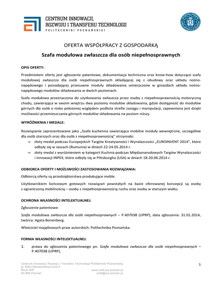 OFERTA WSPÓŁPRACY Z GOSPODARKĄ Szafa modułowa zwłaszcza dla osób niepełnosprawnych OPIS OFERTY: Przedmiotem oferty jest zgłoszenie patentowe, dokumentacja techniczna oraz know-how dotyczące szafy modułowej zwłaszcza dla osób niepełnosprawnych składającej się z obudowy oraz układu nośnonapędowego i posiadającej przesuwne moduły składowania umieszczone w gniazdach układu nośnonapędowego modułów składowania w dwóch poziomach. Szafa modułowa przeznaczona do użytkowania zwłaszcza przez osoby z niepełnosprawnością motoryczną chodu, zawierająca w swoim wnętrzu dwa poziomy modułów składowania, gdzie dostępność do modułów górnych dla osób o nisko położonej względem podłoża strefie zasięgu i manipulacji, zapewniona jest dzięki możliwości przemieszczania górnych modułów składowania na poziom niższy. WYRÓŻNIENIA I MEDALE: Rozwiązanie zaprezentowane jako „Szafa kuchenna zawierająca mobilne moduły wewnętrzne, szczególnie dla osób starszych oraz dla osób z niepełnosprawnością” otrzymało: • złoty medal podczas Europejskich Targów Kreatywności i Wynalazczości „EUROINVENT 2014”, które odbyły się w Jassach (Rumunia) w dniach 22-24.05.2014 r. • złoty medal z wyróżnieniem w kategorii Kuchnia podczas Międzynarodowych Targów Wynalazczości i Innowacji INPEX, które odbyły się w Pittsburghu (USA) w dniach 18-20.06.2014 r. ODBIORCA OFERTY I MOŻLIWOŚCI ZASTOSOWANIA ROZWIĄZANIA: Odbiorcą oferty są przedsiębiorstwa produkujące meble. Użytkownikiem końcowym gotowych rozwiązań powstałych na bazie oferowanej koncepcji są osoby z ograniczoną mobilnością – osoby z niepełnosprawnością ruchu oraz osoby w starszym wieku. OCHRONA WŁASNOŚCI INTELEKTUALNEJ: Zgłoszenie patentowe: Szafa modułowa zwłaszcza dla osób niepełnosprawnych – P.407038 (UPRP), data zgłoszenia: 31.01.2014, twórca: Agata Bonenberg. Właściciel majątkowych praw autorskich: Politechnika Poznańska. FORMA WŁASNOŚCI INTELEKTUALNEJ: 1. prawa do zgłoszenia patentowego pn. Szafa modułowa zwłaszcza dla osób niepełnosprawnych – P.407038 (UPRP), Centrum Innowacji, Rozwoju i Transferu Technologii Politechniki Poznańskiej pl. Marii Skłodowskiej-Curie 5 Biuro 409 www.ciritt.put.poznan.pl 60-965 Poznań [email protected] 1 2. Komplet dokumentacji technicznej („Szafa kuchenna multikonfiguracyjna – mechanika”) w wersji papierowej: - rysunek poglądowy („Projekt multikonfiguracyjnej szafy kuchennej”), - rysunki złożeniowe („Szafa mechanika”, „Rama”), - rysunki wykonawcze („Moduł góra”, „Napęd dolny”, „Napęd górny” itd.). 3. know-how twórców: A. B. część wyodrębniona jako nieopatentowana wiedza techniczna, nadzór autorski dot. wdrożenia; warunkiem przeprowadzenia wdrożenia jest wykonanie prototypu konstrukcji. DZIEDZINY NAUKI I TECHNIKI: Design, inżynieria mechaniczna, automatyka i robotyka. SŁOWA KLUCZOWE: Meble kuchenne, zabudowa kuchenna, osoby niepełnosprawne. PREFEROWANA FORMA WSPÓŁPRACY: Umowa licencyjna ze zobowiązaniem Licencjobiorcy do wykonania prototypu i wdrożenia do produkcji. KONTAKT: Centrum Innowacji, Rozwoju i Transferu Technologii Politechniki Poznańskiej pl. Marii Skłodowskiej-Curie 5 (Biuro 409), 60-965 Poznań e-mail: [email protected] INFORMACJE DODATKOWE: 1. Niniejsza oferta nie jest ofertą w rozumieniu art. 66-71 Kodeksu Cywilnego. 2. Politechnika Poznańska odrzuci ofertę, jeżeli będzie zawierała rażąco niską cenę w stosunku do wartości rozwiązania. 3. Politechnika Poznańska w celu ustalenia, czy oferta zawiera rażąco niską cenę w stosunku do wartości rozwiązania, zwróci się do Oferenta o udzielenie w określonym terminie wyjaśnień dotyczących elementów oferty mających wpływ na wysokość ceny. 4. Jeżeli w postępowaniu konkursowym nie można dokonać wyboru najkorzystniej oferty ze względu na to, że zostały złożone oferty o takiej samej cenie, Politechnika Poznańska wezwie Oferentów, którzy złożyli te oferty, do złożenia w terminie określonym przez Politechnikę Poznańską ofert dodatkowych. 5. Politechnika Poznańska zastrzega sobie prawo do unieważnienia postępowania konkursowego, jeżeli złożone oferty będą zawierały ceny, których wartość nie będzie przewyższała wartości rozwiązania. Centrum Innowacji, Rozwoju i Transferu Technologii Politechniki Poznańskiej pl. Marii Skłodowskiej-Curie 5 Biuro 409 www.ciritt.put.poznan.pl 60-965 Poznań [email protected] 2