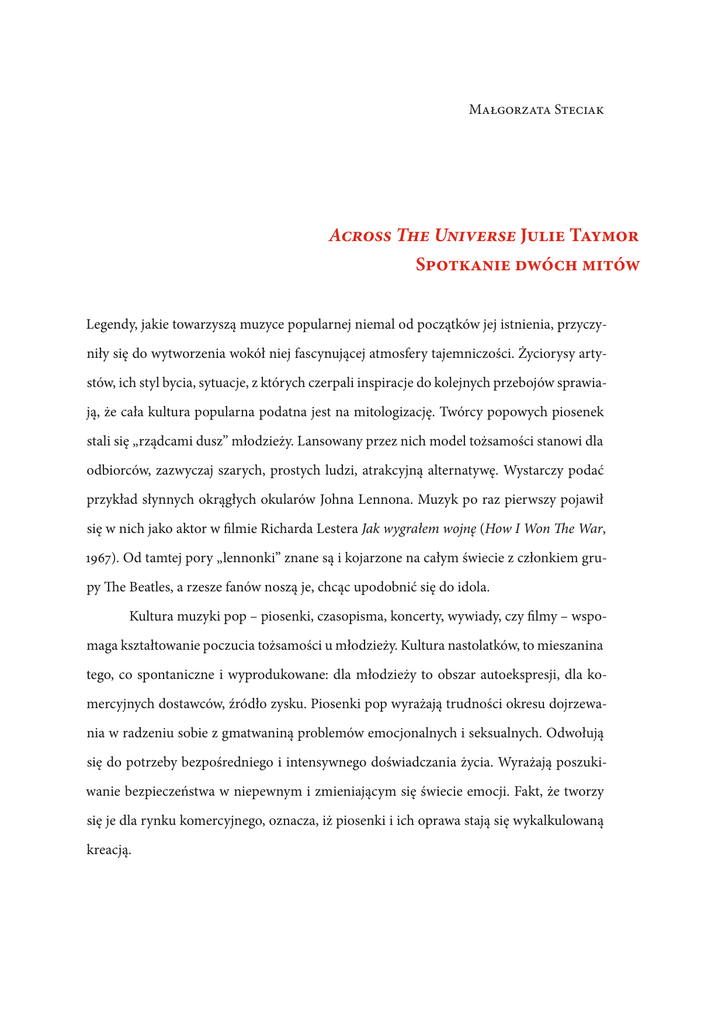 Małgorzata Steciak Across The Universe Julie Taymor Spotkanie dwóch mitów Legendy, jakie towarzyszą muzyce popularnej niemal od początków jej istnienia, przyczyniły się do wytworzenia wokół niej fascynującej atmosfery tajemniczości. Życiorysy artystów, ich styl bycia, sytuacje, z których czerpali inspiracje do kolejnych przebojów sprawiają, że cała kultura popularna podatna jest na mitologizację. Twórcy popowych piosenek stali się „rządcami dusz” młodzieży. Lansowany przez nich model tożsamości stanowi dla odbiorców, zazwyczaj szarych, prostych ludzi, atrakcyjną alternatywę. Wystarczy podać przykład słynnych okrągłych okularów Johna Lennona. Muzyk po raz pierwszy pojawił się w nich jako aktor w filmie Richarda Lestera Jak wygrałem wojnę (How I Won The War, 1967). Od tamtej pory „lennonki” znane są i kojarzone na całym świecie z członkiem grupy The Beatles, a rzesze fanów noszą je, chcąc upodobnić się do idola. Kultura muzyki pop – piosenki, czasopisma, koncerty, wywiady, czy filmy – wspomaga kształtowanie poczucia tożsamości u młodzieży. Kultura nastolatków, to mieszanina tego, co spontaniczne i wyprodukowane: dla młodzieży to obszar autoekspresji, dla komercyjnych dostawców, źródło zysku. Piosenki pop wyrażają trudności okresu dojrzewania w radzeniu sobie z gmatwaniną problemów emocjonalnych i seksualnych. Odwołują się do potrzeby bezpośredniego i intensywnego doświadczania życia. Wyrażają poszukiwanie bezpieczeństwa w niepewnym i zmieniającym się świecie emocji. Fakt, że tworzy się je dla rynku komercyjnego, oznacza, iż piosenki i ich oprawa stają się wykalkulowaną kreacją. Across The Universe Julie Taymor. Spotkanie dwóch mitów Za pośrednictwem muzyki pop młodzi ludzie kształtują i porządkują swój mentalny obraz świata. Określony sposób wypowiadania się, miejsca, do których chodzą, ubiór, taniec – to wszystko stanowi wyraz dystansu wobec świata dorosłych. Styl ubierania się może wyrażać nonkonformizm i bunt społeczny. Konsumpcja określonej muzyki staje się więc sposobem bycia w świecie. Muzyki używa się jako znaku, za pomocą którego młodzież ocenia i jest oceniana przez innych. Słuchanie tego samego zespołu rodzi poczucie wspólnoty. Jednym z najbardziej kultowych przedstawicieli muzyki popularnej jest zespół The Beatles. Czwórka młodych chłopców z Liverpoolu w ciągu zaledwie kilku miesięcy zawładnęła umysłami młodzieży na całym świecie. Z pewnością stali się oni symbolem burzliwej dekady lat 60. Ich piosenki, choć opowiadają zwykle o banalnych sprawach, koncentrujących się wokół problemów miłosnych, przetrwały próbę czasu i cieszą się powodzeniem do dziś. Jedną z przyczyn niesłabnącej popularności zespołów popularnych, podaje Simon Frith: „W piosenkach słowa są znakami dźwięku. Piosenka jest zawsze interpretacją, słowa piosenki zaś są otwarcie wypowiadane – są nośnikami dźwięku, strukturami dźwięku, które są bezpośrednimi znakami emocji i cech charakteru. Piosenki pop celebrują nie to, co werbalne, lecz to, co niewerbalne, a ocena piosenkarzy pop nie zależy od słów, lecz od dźwięków – dźwięków otaczających słowa”1. Siła piosenek Beatlesów nie polega również na treści zawartej w słowach, lecz na specyficznym połączeniu języka z melodią. Roland Barthes twierdzi, że przyjemność płynąca z muzyki nie polega na przedstawianiu czegoś, co się zdarzyło, lecz na tworzeniu przez słuchacza własnego znaczenia związanego z konkretną piosenką. Przyjemność i siła, Cyt. Za J. Storey, Studia kulturowe i badania kultury popularnej, tł. Janusz Barański, Wydawnictwo UJ, Kraków 2003, s. 100. 1 2 Across The Universe Julie Taymor. Spotkanie dwóch mitów płynące z muzyki popularnej, nie tkwią w interpretacji emocji, lecz w emocjach interpretowania. Barthes tworzy pojęcie „rdzenia wyśpiewanego głosu”2. Sam sposób wykonania utworu niesie ze sobą szereg znaczeń i pozwala na zaakceptowanie treści, które wyrażają poglądy w innym wypadku przez nas nieakceptowane. Konstatacja Barthes’a stanowi wyraz ogólnego poglądu na temat różnicy między plaisir a jouissance. Pierwsze z pojęć wyraża przyjemności konwencji i rozpoznania. Drugie natomiast manifestuje wolność istnienia poza znaczeniem. Muzyka Beatlesów umożliwia odbiorcom zatracenie się w świecie dźwięków, bez wpadnięcia w pułapkę szukania zawsze tych samych, konkretnych znaczeń. Jej uniwersalność pozwala odnosić ją do wielu kontekstów, bez strat dla przesłania kompozytorów. Jedną z artystek, która postanowiła mit Beatlesów wpisać we własne dzieło, jest Julie Taymor. W filmie Across The Universe (2007) reżyserka tworzy własną wizję czasów amerykańskiej kontestacji, odwołując się przy tym do twórczości brytyjskiego zespołu. Choć obraz ten nie jest typową biografią, zawiera w sobie wiele odwołań do historii działalności czwórki z Liverpoolu, na przykład do tekstów ich piosenek. Znaczenia te ujawniają się zarówno w warstwie wizualnej, jak i fabularnej. Nie opowiadając wprost o podmiocie swoich rozważań, Taymor przemyca treści, które będą czytelne dla widza o odpowiedniej kompetencji kulturowej. Odwołuje się zarówno do mitów dotyczących amerykańskiej kontestacji, jak i Beatlesów, tworząc niezwykle interesującą mozaikę filmową. Jednym z nich jest rytuał palenia powołania do wojska. Dokument niszczony jest przez bohaterów filmu Hair (Hair, reż. Milos Forman, 1979). Również w Across The Universe przyszły żołnierz, na wieść, że Ojczyzna potrzebuje jego pomocy, ostentacyjnie podpala świstek papieru. Fabuła filmu stanowi jedynie pretekst do numerów tanecznych i przyczynek do odtworzenia przez reżyserkę atmosfery burzliwych lat 60. XX wieku w Stanach Zjednoczonych. Grupa bohaterów u progu dorosłości mierzy się z Ameryką s