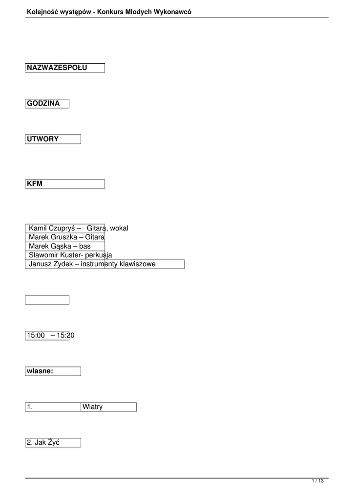 Kolejność występów - Konkurs Młodych Wykonawcó NAZWAZESPOŁU GODZINA UTWORY KFM Kamil Czupryś – Gitara, wokal Marek Gruszka – Gitara Marek Gąska – bas Sławomir Kuster- perkusja Janusz Żydek – instrumenty klawiszowe 15:00 – 15:20 własne: 1. Wiatry 2. Jak Żyć 1 / 13 Kolejność występów - Konkurs Młodych Wykonawcó cover: 1. Zobacz Jak Pięknie ACUSTIC Grzegorz Achtelik vocal gitara akustyczna, Szymon Borkowski gitara akustyczna, Jacek Szuła harmon 15:25 – 15:45 własne: Drzwi Stan wariata CINEMON 2 / 13 Kolejność występów - Konkurs Młodych Wykonawcó Michał Wójcik (gitara, wokal) Michał Braszak (bas) Kuba Pałka (perkusja) Paweł Harańczyk (klawisze) Adam Cygan (wokal) 15:50 – 16:10 własne: 1.Sześć 2.Little Babe cover: Na dnie moich oczu DYJAK / PIETRAS Marcin Dyjak – Harmonijka ustna 3 / 13 Kolejność występów - Konkurs Młodych Wykonawcó Krzysztof Pietras – Piano/Keyboard 16:15- 16:35 własne: 1. Silent Poodle 2. B-minor cover: Taki wiatr ALCHEMIA BLUES ROCK JAM BAND Piotr Sprawka (gitara), Michał Wąsik (bas), Paweł Stryczniewicz (perkusja), Adrian Czyżewski (skrzyp 16:40 -17:00 4 / 13 Kolejność występów - Konkurs Młodych Wykonawcó własne: Inka Etiuda z- moll cover: W co mam wierzyć ( PANTEON Kamil Wysocki – gitara Łukasz Jakubowicz – instrumenty klawiszowe Ksawery Buczkowski – wokal Rafał Nycz – perkusja 5 / 13 Kolejność występów - Konkurs Młodych Wykonawcó Wiktor Jakubowicz – gitara basowa 17:05-17:25 własne: 1.Sounds of the world 2. Uciekaj stąd cover: Wielki Ogień PRZERWA DO 18:10 JACKKNIFE 6 / 13 Kolejność występów - Konkurs Młodych Wykonawcó Aleksandra Polnicka Tomek Gutka Damian Tofil Jakub Staniszewski 18:10 – 18:30 własne: 1. Ostatni akord 2. Złamana symetria cover: 1. Do kogo idziesz 7 / 13 Kolejność występów - Konkurs Młodych Wykonawcó PURPURE DRAPE AKA PURPUROWI Paweł Doroń – gitara Marcin Kominek – bas Checo – perkusja Damian O’ Hara – wokal, piano 18:35 – 18:55 własne: 1. We are broken 8 / 13 Kolejność występów - Konkurs Młodych Wykonawcó 2. Do not call me fag. cover: 1.„Zobacz jak pięknie” ABSYNTIA Piotr Truchel – wokal, gitara elektryczna,..Mariusz Królikowski –bas, Michał Świeżyński-gitara elektryc 19:00 – 19:20 własne: 1.Szaman 2.Ulice, które znam cover: 9 / 13 Kolejność występów - Konkurs Młodych Wykonawcó 1.Wielki Ogień WOLNA SOBOTA Maciej Frąckowiak Dawid Wydra Wojtek Kubiak Piotr Tarnawski Robert Rekiel 19:25 –19:45 własne: 1.Leń 2.Jack Blues Man 10 / 13 Kolejność występów - Konkurs Młodych Wykonawcó cover: 1.Dziwny Weekend AMNEZJA Bartek Ćwiek - bas Dawid Nowak - perkusja Ernest Staniaszek - wokal, harm. Igor Ćwiek - gitara 19:50 – 20:10 własne: 1. Cień moich dni 2. Nuda cover: 11 / 13 Kolejność występów - Konkurs Młodych Wykonawcó 1.Masz to dziś PERIHELLIUM Marcin Sułek - wokal Gerard Wróbel - gitara Seweryn Błasiak - perkusja Bartek Bachula – bas 20:15 – 20:35 własne: 1. Redd 2. The machines cover: 1. Do kogo idziesz 12 / 13 Kolejność występów - Konkurs Młodych Wykonawcó THE FAULT Kamil Stuczyński(gitara), Łukasz Sadowski(perkusja), Marcin Orkowski(bas), Krystian Wołoszyn(wokal 20:40 – 21:00 własne: 1 Waiting, 2.Dialog. cover: 1.Wielki ogień. 13 / 13