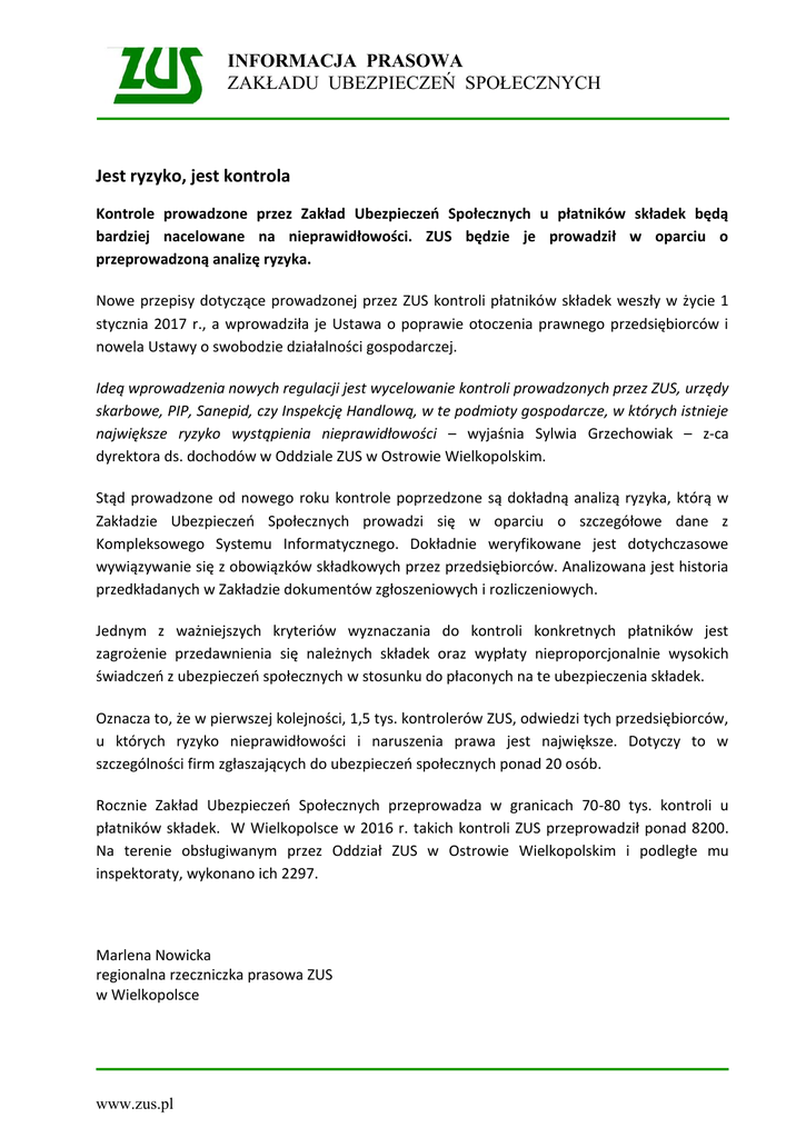 INFORMACJA PRASOWA ZAKŁADU UBEZPIECZEŃ SPOŁECZNYCH Jest ryzyko, jest kontrola Kontrole prowadzone przez Zakład Ubezpieczeń Społecznych u płatników składek będą bardziej nacelowane na nieprawidłowości. ZUS będzie je prowadził w oparciu o przeprowadzoną analizę ryzyka. Nowe przepisy dotyczące prowadzonej przez ZUS kontroli płatników składek weszły w życie 1 stycznia 2017 r., a wprowadziła je Ustawa o poprawie otoczenia prawnego przedsiębiorców i nowela Ustawy o swobodzie działalności gospodarczej. Ideą wprowadzenia nowych regulacji jest wycelowanie kontroli prowadzonych przez ZUS, urzędy skarbowe, PIP, Sanepid, czy Inspekcję Handlową, w te podmioty gospodarcze, w których istnieje największe ryzyko wystąpienia nieprawidłowości – wyjaśnia Sylwia Grzechowiak – z-ca dyrektora ds. dochodów w Oddziale ZUS w Ostrowie Wielkopolskim. Stąd prowadzone od nowego roku kontrole poprzedzone są dokładną analizą ryzyka, którą w Zakładzie Ubezpieczeń Społecznych prowadzi się w oparciu o szczegółowe dane z Kompleksowego Systemu Informatycznego. Dokładnie weryfikowane jest dotychczasowe wywiązywanie się z obowiązków składkowych przez przedsiębiorców. Analizowana jest historia przedkładanych w Zakładzie dokumentów zgłoszeniowych i rozliczeniowych. Jednym z ważniejszych kryteriów wyznaczania do kontroli konkretnych płatników jest zagrożenie przedawnienia się należnych składek oraz wypłaty nieproporcjonalnie wysokich świadczeń z ubezpieczeń społecznych w stosunku do płaconych na te ubezpieczenia składek. Oznacza to, że w pierwszej kolejności, 1,5 tys. kontrolerów ZUS, odwiedzi tych przedsiębiorców, u których ryzyko nieprawidłowości i naruszenia prawa jest największe. Dotyczy to w szczególności firm zgłaszających do ubezpieczeń społecznych ponad 20 osób. Rocznie Zakład Ubezpieczeń Społecznych przeprowadza w granicach 70-80 tys. kontroli u płatników składek. W Wielkopolsce w 2016 r. takich kontroli ZUS przeprowadził ponad 8200. Na terenie obsługiwanym przez Oddział ZUS w Ostrowie Wielkopolskim i podległe mu inspektoraty, wykonano ich 2297. Marlena Nowicka regionalna rzeczniczka prasowa ZUS w Wielkopolsce www.zus.pl