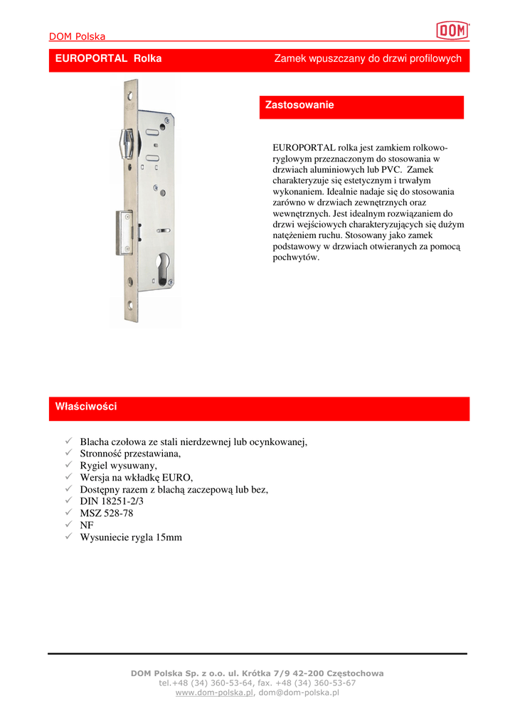 DOM Polska EUROPORTAL Rolka Zamek wpuszczany do drzwi profilowych Zastosowanie EUROPORTAL rolka jest zamkiem rolkoworyglowym przeznaczonym do stosowania w drzwiach aluminiowych lub PVC. Zamek charakteryzuje się estetycznym i trwałym wykonaniem. Idealnie nadaje się do stosowania zarówno w drzwiach zewnętrznych oraz wewnętrznych. Jest idealnym rozwiązaniem do drzwi wejściowych charakteryzujących się dużym natężeniem ruchu. Stosowany jako zamek podstawowy w drzwiach otwieranych za pomocą pochwytów. Właściwości Blacha czołowa ze stali nierdzewnej lub ocynkowanej, Stronność przestawiana, Rygiel wysuwany, Wersja na wkładkę EURO, Dostępny razem z blachą zaczepową lub bez, DIN 18251-2/3 MSZ 528-78 NF Wysuniecie rygla 15mm DOM Polska Sp. z o.o. ul. Krótka 7/9 42-200 Częstochowa tel.+48 (34) 360-53-64, fax. +48 (34) 360-53-67 www.dom-polska.pl, [email protected] DOM Polska EUROPORTAL Rolka Zamek wpuszczany do drzwi profilowych Wymiary DOM Polska Sp. z o.o. ul. Krótka 7/9 42-200 Częstochowa tel.+48 (34) 360-53-64, fax. +48 (34) 360-53-67 www.dom-polska.pl, [email protected]
