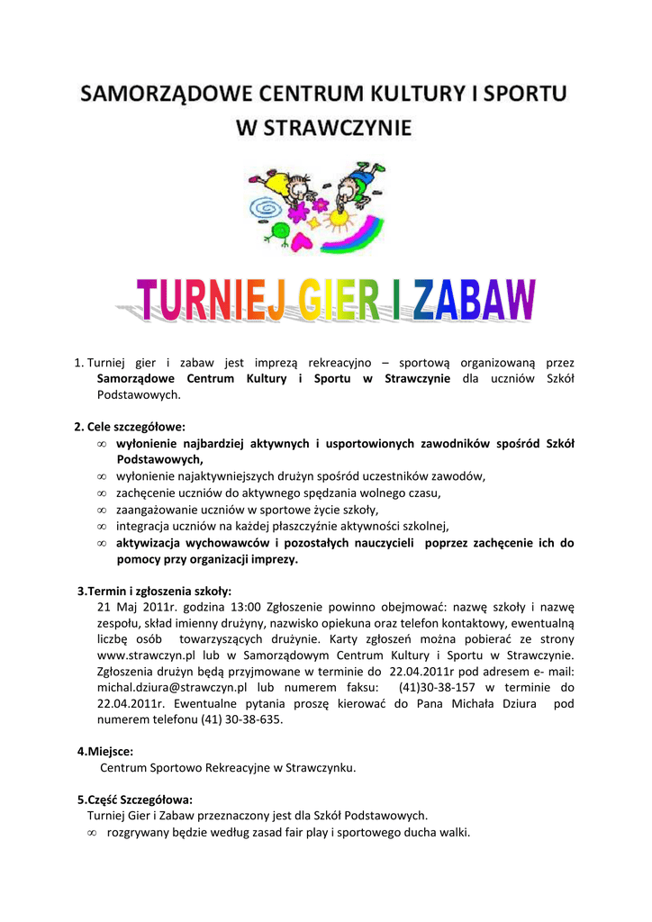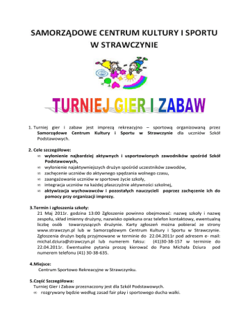 1. Turniej gier i zabaw jest imprezą rekreacyjno – sportową organizowaną przez Samorządowe Centrum Kultury i Sportu w Strawczynie dla uczniów Szkół Podstawowych. 2. Cele szczegółowe: • wyłonienie najbardziej aktywnych i usportowionych zawodników spośród Szkół Podstawowych, • wyłonienie najaktywniejszych drużyn spośród uczestników zawodów, • zachęcenie uczniów do aktywnego spędzania wolnego czasu, • zaangażowanie uczniów w sportowe życie szkoły, • integracja uczniów na każdej płaszczyźnie aktywności szkolnej, • aktywizacja wychowawców i pozostałych nauczycieli poprzez zachęcenie ich do pomocy przy organizacji imprezy. 3.Termin i zgłoszenia szkoły: 21 Maj 2011r. godzina 13:00 Zgłoszenie powinno obejmować: nazwę szkoły i nazwę zespołu, skład imienny drużyny, nazwisko opiekuna oraz telefon kontaktowy, ewentualną liczbę osób towarzyszących drużynie. Karty zgłoszeń można pobierać ze strony www.strawczyn.pl lub w Samorządowym Centrum Kultury i Sportu w Strawczynie. Zgłoszenia drużyn będą przyjmowane w terminie do 22.04.2011r pod adresem e- mail: [email protected] lub numerem faksu: (41)30-38-157 w terminie do 22.04.2011r. Ewentualne pytania proszę kierować do Pana Michała Dziura pod numerem telefonu (41) 30-38-635. 4.Miejsce: Centrum Sportowo Rekreacyjne w Strawczynku. 5.Część Szczegółowa: Turniej Gier i Zabaw przeznaczony jest dla Szkół Podstawowych. • rozgrywany będzie według zasad fair play i sportowego ducha walki. • w turnieju biorą udział ośmioosobowe zespoły (cztery dziewczynki i czterech chłopców) plus dwie osoby rezerwowe, reprezentujące Szkołę Podstawową. • punktacja w zależności od ilości zgłoszonych Szkół do Turnieju od 1pkt do ... • liczba zdobytych punktów decyduje o końcowej kolejności drużyn. • w celu większej integracji podczas turnieju każda ze szkół może zorganizować doping dla swoich faworytów (przygotowanie transparentów, plakatów informacyjnych i zachęcających do udziału w Turnieju Gier i Zabaw ;-).Najlepiej przygotowany doping będzie nagradzany 25 karnetami wstępu na krytą pływalnię do rozdysponowania przez dyrektora zwycięskiej szkoły. Nad przebiegiem każdego turnieju czuwać będzie komisja sędziowska, która rozstrzygać będzie również wszelkie kwestie sporne. Kolejność i opis zabaw: I.„Sadzenie ziemniaków" Drużyny ustawione w rzędach, Na sygnał pierwszy zawodnik startuje i zostawia woreczki „ziemniaki" w wyznaczonych miejscach, po czym obiega końcowy pachołek i wraca na początek swojego rzędu . Po przekroczeniu linii początkowej startuje następny zawodnik zbiera „ziemniaki" i wraca na początek przekazując woreczki następnemu. II. „Wyścig w workach" Zawodnicy skaczą w workach do półmetka i wracają tak samo, przekazują worek następnemu zawodnikowi itd. III. Rzuty do kosza na czas. Każdy z drużyny otrzymuje piłkę do mini koszykówki. Na sygnał wszyscy rzucają piłkami do jednego kosza. Czas 1 minuta. IV. Wyścig z piłeczką do tenisa ziemnego na rakiecie tenisowej. Pierwszy zawodnik kładzie piłeczkę na rakietce. Na sygnał biegnie do pachołka, obiega go i wraca na początek, przekazuje rakietkę następnemu zawodnikowi. V.„Wyścig piłek w rzędach" Zawodnicy ustawieni w rzędach. Pierwszy z rzędu posiada piłkę. Na sygnał zawodnicy podają piłkę z rąk do rąk, ostatni z rzędu zabiera piłkę i biegnie na początek itd. Drugi raz tak samo z tym, iż zawodnicy siedzą w siadzie skrzyżnym. VI. Łączone skoki w dal z miejsca. Każdy z zawodników wykonuje skok w dal z miejsca . Skoki się sumuje. Liczy się końcowa suma wszystkich skoków. VII.„Wyścig mrówek" Zawodnicy ustawieni w podporze tyłem z piłką na brzuchu. Na sygnał pierwszy zawodnik czworakuje w podporze tyłem do półmetka bierze piłkę w ręce i wraca na początek przekazując piłkę następnemu zawodnikowi itd. VIII.„ Wyścig braci syjamskich" Zawodnicy ustawieni w parach z piłką między głowami. Na sygnał zawodnicy biegną do pachołka obiegają go i wracają na początek przekazując piłkę następnej parze itd. IX. W razie jednakowej ilości punktów uzyskanej przez drużyny dodatkową konkurencją wyłaniająca zwycięzcę danego miejsca będzie konkurencja przeciągania liny. 7.Nagrody: Organizator przewiduje nagrody w postaci darmowych wejść na basen. Drużyna, która zajmie I miejsce otrzyma karnety dla 25 osób na 4 wejścia na basen do wykorzystania do 30.06.2011 r. Drużyna, która zajmie II miejsce otrzyma karnety dla 25 osób na 3 wejścia na basen do wykorzystania do 30.06.2011 r. Drużyna, która zajmie III miejsce otrzyma karnety dla 25 osób na 2 wejścia na basen do wykorzystania do 30.06.2011 r. 8.Organizator zastrzega sobie prawo do wprowadzenia organizowanym turnieju. zmian w regulaminie