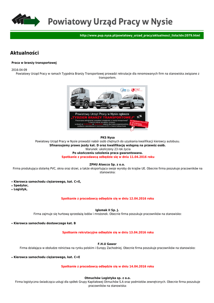 http://www.pup.nysa.pl/powiatowy_urzad_pracy/aktualnosci_lista/idn:2079.html Aktualności Praca w branży transportowej 2016-04-09 Powiatowy Urząd Pracy w ramach Tygodnia Branży Transportowej prowadzi rekrutacje dla renomowanych firm na stanowiska związane z transportem. PKS Nysa Powiatowy Urząd Pracy w Nysie prowadzi nabór osób chętnych do uzyskania kwalifikacji kierowcy autobusu. Sfinansujemy prawo jazdy kat. D oraz kwalifikację wstępną na przewóz osób. Warunek: ukończony 23 rok życia Po ukończeniu szkolenia praca gwarantowana. Spotkanie z pracodawcą odbędzie się w dniu 11.04.2016 roku ZPHU Alsecco Sp. z o.o. Firma produkująca stolarkę PVC, okna oraz drzwi, a także eksportująca swoje wyroby do krajów UE. Obecnie firma poszukuje pracowników na stanowiska: ● ● ● Kierowca samochodu ciężarowego, kat. C+E, Spedytor, Logistyk, Spotkanie z pracodawcą odbędzie się w dniu 12.04.2016 roku Iglomak II Sp. J. Firma zajmuje się hurtową sprzedażą lodów i mrożonek. Obecnie firma poszukuje pracowników na stanowisko: ● Kierowca samochodu dostawczego kat. B Spotkanie rekrutacyjne odbędzie się w dniu 13.04.2016 roku F.H.U Gawor Firma działająca w obsłudze rolnictwa na rynku polskim i Europy Zachodniej. Obecnie firma poszukuje pracowników na stanowisko: ● Kierowca samochodu ciężarowego, kat. C+E Spotkanie z pracodawcą odbędzie się w dniu 14.04.2016 roku Otmuchów Logistyka sp. z o.o. Firma logistyczna świadcząca usługi dla spółek Grupy Kapitałowej Otmuchów S.A oraz podmiotów zewnętrznych. Obecnie firma poszukuje pracowników na stanowiska: ● ● ● ● Kierowca samochodu ciężarowego, kat. C+E, Handlowiec -Spedytor, Spedytor, Przedstawiciel handlowy w branży logistycznej Spotkanie z pracodawcą odbędzie się w dniu 15.04.2016 roku Tydzień Branży Transportowej organizowany przez Powiatowy Urząd Pracy w Nysie odbywa się w ramach Europejskich Dni Pracodawcy Osoby do kontaktu: Aleksandra Pytlińska – doradca klienta tel. 77 448 99 60, e-mail: [email protected] Ewa Jurasz – doradca klienta tel. 77 448 99 55, email: [email protected] wszystkie wiadomości