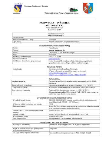 European Employment Services Wojewódzki Urząd Pracy w Rzeszowie (Gdańsk) NORWEGIA – INŻYNIER AUTOMATYKI Nr ref. 1161201201129 Kod ISCO: 2149 Osoba na stanowisko: Inżynier automatyki 1 Norwegia Praca w charakterze inżyniera automatyki. Liczba etatów: Miejsce zatrudnienia – kraj: Opis pracy Status: Nazwa: DANE PODMIOTU OFERUJĄCEGO PRACĘ Pracodawca Senior Services AS Adres: Kraj: Telefon (z kodem kraju): Strona internetowa: Krótki opis działalności gospodarczej: Løkkeveien 11-13, 4005 Stavanger Norwegia + 47 51 51 71 00 www.senior.as Senior Services AS świadczy usługi w zakresie pozyskiwania specjalistów dla norweskiego sektora wydobywczego. MIEJSCE PRACY Stavanger, region Rogaland, Norwegia Więcej informacji na temat Stavanger na stronach www.visitstavanger.com oraz http://www.youtube.com/watch?v=32DsJcNtGPM Lokalizacja: WYMAGANIA Wymagany tytuł inżyniera cybernetyki, automatyki, elektryki lub pokrewny. Wymagane doświadczenie w pracy z Siemens PCS7 / S7 / S5 Wymagana dobra znajomość technicznego języka angielskiego . Wykształcenie: Doświadczenie zawodowe: Znajomość języków: Znajomość i doświadczenie w pracy z : HMI / WINCC, dokumentacją projektu, PLS, testami, FAT / OSAT oraz w pracy na platformie będą dodatkowym atutem. Inne istotne wymagania: WYNAGRODZENIE I WARUNKI ZATRUDNIENIA 740 000- 840 000 NOK rocznie w zależności ok. doświadczenia i kwalifikacji ( ok. 94 000 – 107 600 euro) Waluta, w jakiej wypłacana jest pensja: NOK Zakwaterowanie: Senior Services AS zapewnia pomoc w znalezieniu zakwaterowania oraz ewentualnym sprowadzeniu rodziny. Nazwa firmy, z którą zostanie podpisana Senior Services AS umowa: Rodzaj umowy: umowa na czas określony, przy projekcie, min. 1 rok Wymiar czasu pracy praca na pełen etat Data rozpoczęcia: do uzgodnienia z pracodawcą, jak najszybciej Wysokość pensji brutto: Wymagane dokumenty SPOSÓB SKŁADANIA WNIOSKU krótki list motywacyjny oraz CV w języku angielskim Język, w którym muszą być sporządzone przedkładane dokumenty: Do kogo należy wysłać dokumenty: angielski do przedstawiciela pracodawcy p. Ann Helen Tvedt Gdzie należy wysłać dokumenty: [email protected] Data publikacji: WAŻNOŚĆ 18.01.2012 Termin przedkładania podań o pracę / 28.02.2012 zakończenia ważności oferty: Uprzejmie informujemy, że pracodawca skontaktuje się wyłącznie z wybranymi kandydatami. Norweskie publiczne służby zatrudnienia oświadczył, że agencja pracy tymczasowej Senior Services AS prowadzi działalność zgodnie z przepisami obowiązującymi w Norwegii. UWAGA: 1. Umowa z zagranicznym pracodawcą zostanie zawarta zgodnie z prawem kraju zatrudnienia. Oznacza to, że wszystkie roszczenia odnośnie do warunków, które obejmuje umowa, można kierowad wyłącznie do odpowiedniego sądu w kraju zatrudnienia. Publiczne służby zatrudnienia (EURES) nie mogą pośredniczyd ani reprezentowad pracownika w sądzie kraju zatrudnienia w przypadku sporu z pracodawcą. 2. Publiczne służby zatrudnienia (EURES) dokładają wszelkich starao, aby zapewnid rzetelnośd i wiarygodnośd ofert pracy zgłoszonych w lokalnym urzędzie pracy. Należy wyjaśnid, że oferta pracy została zgłoszona przez stronę trzecią i EURES nie odpowiada za ewentualne rozbieżności między warunkami pracy określonymi w ofercie pracy i warunkami oferowanymi przez potencjalnego pracodawcę. 3. Publiczne służby zatrudnienia (EURES) informują, że będą zbierać, przetwarzać i przekazywać potencjalnym pracodawcom zgodnie z przepisami dotyczącymi ochrony danych osobowych wszystkie dane osobowe dostarczone przez osoby poszukujące pracy.