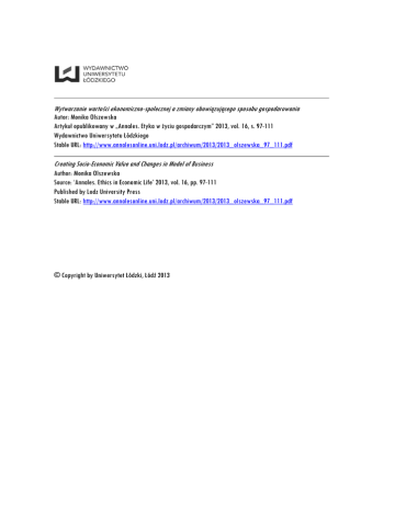 Wytwarzanie wartości ekonomiczno-społecznej a zmiany obowiązującego sposobu gospodarowania Autor: Monika Olszewska Artykuł opublikowany w „Annales. Etyka w życiu gospodarczym” 2013, vol. 16, s. 97-111 Wydawnictwo Uniwersytetu Łódzkiego Stable URL: http://www.annalesonline.uni.lodz.pl/archiwum/2013/2013_olszewska_97_111.pdf Creating Socio-Economic Value and Changes in Model of Business Author: Monika Olszewska Source: ‘Annales. Ethics in Economic Life’ 2013, vol. 16, pp. 97-111 Published by Lodz University Press Stable URL: http://www.annalesonline.uni.lodz.pl/archiwum/2013/2013_olszewska_97_111.pdf © Copyright by Uniwersytet Łódzki, Łódź 2013 Monika Olszewska Uniwersytet Ekonomiczny w Poznaniu e-mail: [email protected] Wytwarzanie wartości ekonomiczno-społecznej a zmiany obowiązującego sposobu gospodarowania 1. Wprowadzenie. W dobie dynamicznego wzrostu gospodarczego zapoczątkowanego w okresie rewolucji przemysłowej czynniki gospodarcze zaczęły dominować nad sferą społeczną i środowiskiem. Prowadziło to nie tylko do degradacji środowiska, ale również do zaniku wartości duchowych i kulturowych. W wielu współczesnych publikacjach biznes bywa nadal przedstawiany jako źródło problemów społecznych, ekologicznych, a nawet gospodarczych1. Czytamy w nich, że przyczyna tego stanu rzeczy w dużej mierze leży po stronie samych przedsiębiorców, którzy nie potrafią wyzwolić się z przestarzałego podejścia do wytwarzania wartości, a znaczna część menedżerów w praktyce skupia się na maksymalizowaniu krótkotrwałych wyników w danym okresie rozliczeniowym2. Kapitalizmowi zarzuca się, że nie jest w stanie wyplenić ubóstwa i nędzy, jest więc wadliwy ze społecznego punktu widzenia 3. Obserwuje się jak w ostatnich latach narasta literatura związana z etyką gospodarowania. B. Fiedor, Kryzys gospodarczy, a kryzys ekonomii jako nauki, „Ekonomista” 2010, nr 4, s. 453; Z. Hull, Społeczne uwarunkowania i filozoficzne podstawy rozwoju zrównoważonego, [w:] Edukacja, Tradycje, Rzeczywistość, Przyszłość. Materiały pokongresowe I Zachodniopomorskiego Kongresu Edukacyjnego, red. Cz. Plewka, CDiDN, Szczecin 2005, s. 141; M. Masztalerz, Wartość jako nadrzędny cel działalności przedsiębiorstwa, [w:] Gospodarka – rynek – przedsiębiorstwo. Uwarunkowanie rozwoju i zasady funkcjonowania, red. M. Sławińska, Wydawnictwo Akademii Ekonomicznej w Poznaniu, Poznań 2008, s. 178; M. Porter, M. Kramer, Tworzenie wartości dla biznesu i społeczeństwa, „Harvard Business Review Polska” 2011, nr 99, s. 38; J. Zieleniewski, Organizacja zespołów ludzkich, wyd. IV, PWN, Warszawa 1978, s. 222. 2 C. Kornevall, Zrównoważony rozwój: szansa dla środowiska, wyzwania dla biznesu, [w:] Odpowiedzialny Biznes, Suplement do „Harward Business Review Polska” 2008, s. 59, 62, 64; J. Dymowski, Problematyka mierzenia opłacalności działań społecznie odpowiedzialnych, [w:] Społeczna odpowiedzialność..., op. cit., s. 153; M. Pindelski, CSR na styku organizacji i klienta – odpowiedzialność społeczna sprzedaży, [w:] Społeczna odpowiedzialność..., op. cit., s. 209. 3 Argumenty polemiczne wobec tego osądu przedstawia w „Ludzkim działaniu” Ludwig von Mises. Por. L. von Mises, Ludzkie działanie. Traktat o ekonomii, Instytut Ludviga von Misesa, Warszawa 2011, s. 703-705. 1 98 MONIKA OLSZEWSKA Biorąc pod uwagę dane tylko z księgarni PWN 4 zauważa się szczególny wzrost zainteresowania tą tematyką po roku 2008, czyli zaraz po wybuchu kryzysu islandzkiego. Historia myśli ekonomicznej wskazuje, że kryzysy często powodowały zmianę paradygmatów. Możliwe, że więcej dowiadujemy się o gospodarce w chwilach jej słabości5. W literaturze coraz częściej podkreśla się, że wartości preferowane w sferze decyzji ekonomicznych i organizacyjnych są wyznacznikiem powszechnie przyswajanych wartości, i że w gospodarowaniu konieczne jest odejście od triady: racjonalność – chciwość – równowaga, w stronę bardziej eklektycznej triady: celowe zachowania – światły interes – trwałość rozwoju6. 2. Idee oparte na trwałości rozwoju. Budowanie jakości życia. Wśród prawidłowości wyznaczających kierunki zmian współczesnego życia gospodarczego wymienia się rosnące zainteresowanie kwestiami ekologicznymi oraz zrównoważonym rozwojem7. Realizować te kwestie w biznesie pozwala idea społecznej odpowiedzialności biznesu, CSR (ang. Corporate Social Responsibility). J. Szumniak-Samolej8 definiuje tę kategorię jako długofalowe podejście do prowadzenia działalności gospodarczej polegające na dobrowolnym przestrzeganiu przez przedsiębiorstwo zasad etyki, eliminowaniu negatywnego oddziaływania na społeczeństwo i środowisko naturalne, przy jednoczesnym maksymalizowaniu pozytywnego wpływu na otoczenie oraz uwzględnianiu, już na etapie strategii, oczekiwań różnych grup interesariuszy, dialogu i współpracy. Rysunek nr 1 przedstawia w formie graficznej obszary zaangażowania przedsiębiorstw. http://ksiegarnia.pwn.pl/kategoria/129747/etyka.html?sort=1 (dostęp 11.01.2013). T. Sedláček, Ekonomia dobra i zła, Studio Emka, Warszawa 2012, s. 225; M. Skousen, Narodziny współczesnej ekonomii, Fijorr Publishing, Warszawa 2012, s. 5. 6 Etyka biznesu, red. J. Dietl, W. Gasparski, PWN, Warszawa 1999, s. 113; M. Michalik, Szkice o kryteriach moralnych, Wiedza Powszechna, Warszawa 1980, s. 124; L. von Mises, op. cit., s. 201; A. Wojtyna, Współczesna ekonomia – kontynuacja czy poszukiwanie nowego paradygmatu? [w:] Nauki ekonomiczne wobec wyzwań współczesności, red. B. Fiedor, Z. Hockuba, PTE, Warszawa 2009, s. 44-47. 7 G. Kołodko, Neoliberalizm i światowy kryzys gospodarczy, „Ekonomista” 2010/1, s. 122; R. Mrówka, Nowa Gospodarka a CSR, [w:] Społeczna odpowiedzialność..., op. cit., s. 32-43; M. Porter, F.L. Reinhardt, Strategiczne podejście do klimatu, „Harvard Business Review Polsk