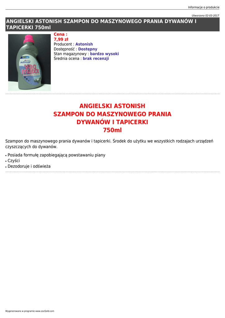 Informacje o produkcie Utworzono 02-03-2017 ANGIELSKI ASTONISH SZAMPON DO MASZYNOWEGO PRANIA DYWANÓW I TAPICERKI 750ml Cena : 7,99 zł Producent : Astonish Dostępność : Dostępny Stan magazynowy : bardzo wysoki Średnia ocena : brak recenzji ANGIELSKI ASTONISH SZAMPON DO MASZYNOWEGO PRANIA DYWANÓW I TAPICERKI 750ml Szampon do maszynowego prania dywanów i tapicerki. Środek do użytku we wszystkich rodzajach urządzeń czyszczących do dywanów. ● ● ● Posiada formułę zapobiegającą powstawaniu piany Czyści Dezodoruje i odświeża Wygenerowano w programie www.oscGold.com