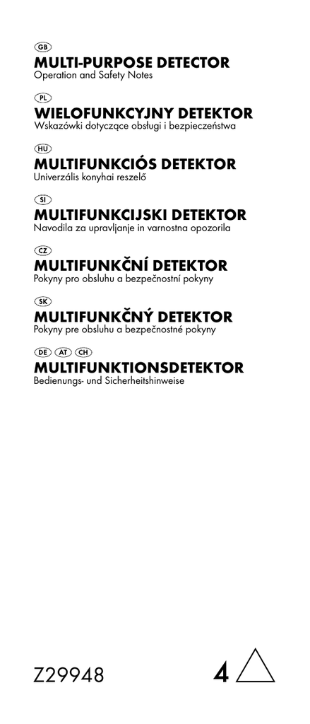 M ulti-Purpose Detector Operation and Safety Notes Wielofunkcyjny detektor Wskazówki dotyczące obsługi i bezpieczeństwa M ultifunkciós detektor Univerzális konyhai reszelő M ultifunkcijski detektor N avodila za upravljanje in varnostna opozorila M ultifunkční detektor Pokyny pro obsluhu a bezpečnostní pokyny M ultifunkčný detektor Pokyny pre obsluhu a bezpečnostné pokyny M ultifunktionsdetektor Bedienungs- und Sicherheitshinweise Z29948 4 GB PL HU SI CZ SK DE / AT / CH Operation and Safety Notes Wskazówki dotyczące obsługi i bezpieczeństwa Kezelési és biztonsági utalások Navodila za upravljanje in varnostna opozorila Pokyny pro obsluhu a bezpečnostní pokyny Pokyny pre obsluhu a bezpečnostné pokyny Bedienungs- und Sicherheitshinweise Page Strona Oldal Stran Strana Strana Seite 6 13 20 27 34 41 48 1 2 3 4 3 A 3 4 4 B 5 5 Table of Contents Introduction Proper Use........................................................ of Parts.......................................... Technical data.................................................. Supply Scope................................................... Description Safety Page Page Page Page 7 7 7 8 Instructions General Safety Instructions............................. Page 8 Battery Safety Instructions................................ Page 9 Getting started Inserting / changing Using the batteries.................... Page 10 the Multifunction Detector..................... Page 10 Trouble-shooting.................................... Page 11 Cleaning and Maintenance........... Page 11 Disposal......................................................... Page 11 6 GB Introduction Multi-Purpose Detector Q Introduction Before assembling and using the device for the first time, take time to familiarise yourself with the product first. Read the following assembly instructions and safety instructions carefully. Only use the product as described and for the designated areas of application. Please keep these instructions in a safe place. If you hand this product on to a third party, you must also pass on all documents relating to the product. Q Proper Use This device is intended to be used for detecting metal and live electrical wires. Other uses or modification of the device shall be considered as improper use and may lead to danger, e.g. risk of personal injury or damage to the device. The manufacturer will not accept liability for loss or damage arising from improper use. The device is not intended for commercial use. Q Description 1 2 3 4 5 of Parts Measuring head Red LED Function switch METAL / VOLTAGE PUSH button Battery compartment Q Technical data Measurable voltage range: 220 - 240 V ~, 50 Hz Detection depth: approx. 40 - 50 mm Battery: 2 x 1.5 V , AAA Ambient conditions: Temperature: 10 - 40°C Humidity: 20 - 90 % Dimensions:160 x 58 x 35 mm (L x B x D) Weight:approx. 106 g (without batteries) GB 7 Introduction / Safety Instructions Q Supply Scope After unpacking the delivery, please check immediately that it contains all parts and that the appliance is in perfect condition. 1 Multi-Purpose Detector 2 Batteries, 1.5 V , AAA 1 Operating manual Q Safety Instructions General Safety Instructions J Warning! DANGER TO LIFE AND RISK OF ACCIDENTS FOR INFANTS AND CHILDREN! Never leave children unattended with packaging materials or the product. There is otherwise a risk of fatal injury by suffocation. Always keep children away from the product. This is not a toy. J Children or other persons who do not have the knowledge or experience required to use the electrical appliance, or who have limited physical, sensory or mental capabilities, must not use the appliance without supervision or instruction by a person who is responsible for their safety. Children must be supervised at all times to prevent them playing with the appliance. J Do not expose the product to – extreme temperatures, – strong vibrations, – heavy mechanical loads, – direct sunlight, – magnetic fields, – moisture. These can damage the product. JDo not immerse the product in water under any circumstances. Never hold the product under running water. Otherwise the product may be damaged. JThe device contains sensitive electronic components. It is therefore possible that nearby radio transmission devices may cause interference. These may be, for example, mobile telephones, two-way radios, CB radios, radio-operated remote controls / other remote controls and microwave devices. If false readings occur, 8 GB Safety Instructions remove such equipment from the vicinity of the device. JDo not use the device in hospitals or other medical institutions. The device may affect the function of life support systems. JElectromagnetic interference / high-frequency emissions can lead to the appliance failing. In cases of the appliance failing to work remove the battery for a short while and then replace it. Do this as described in the “Inserting / changing the batteries“ section. JCheck the product for damage before use. Never use a damaged product. m CAUTION! Never open the housing of the product. This can result in injury and damage to the product. Repairs must be carried out by an electrician only. JDo not allow anyone inexperienced to use the product. Make sure that anyone intending to use the product has read the operating manual and is capable of operating the product safely. JOn no account should you press the buttons with force or use any pointed or sharp object to press the buttons. Battery Safety Instructions Warning! DANGER TO LIFE! Keep batteries out of the reach of children. Do not leave batteries lying around. There is a risk of children or animals swallowing them. Consult a doctor immediately if a battery is swallowed. J EXPLOSION HAZARD! Never recharge, short-circuit and / or open batteries. This can cause them to overheat, burn or burst. Never throw batteries into fire or water. The batteries may explode. JAvoid extreme conditions and temperatures that could ha
