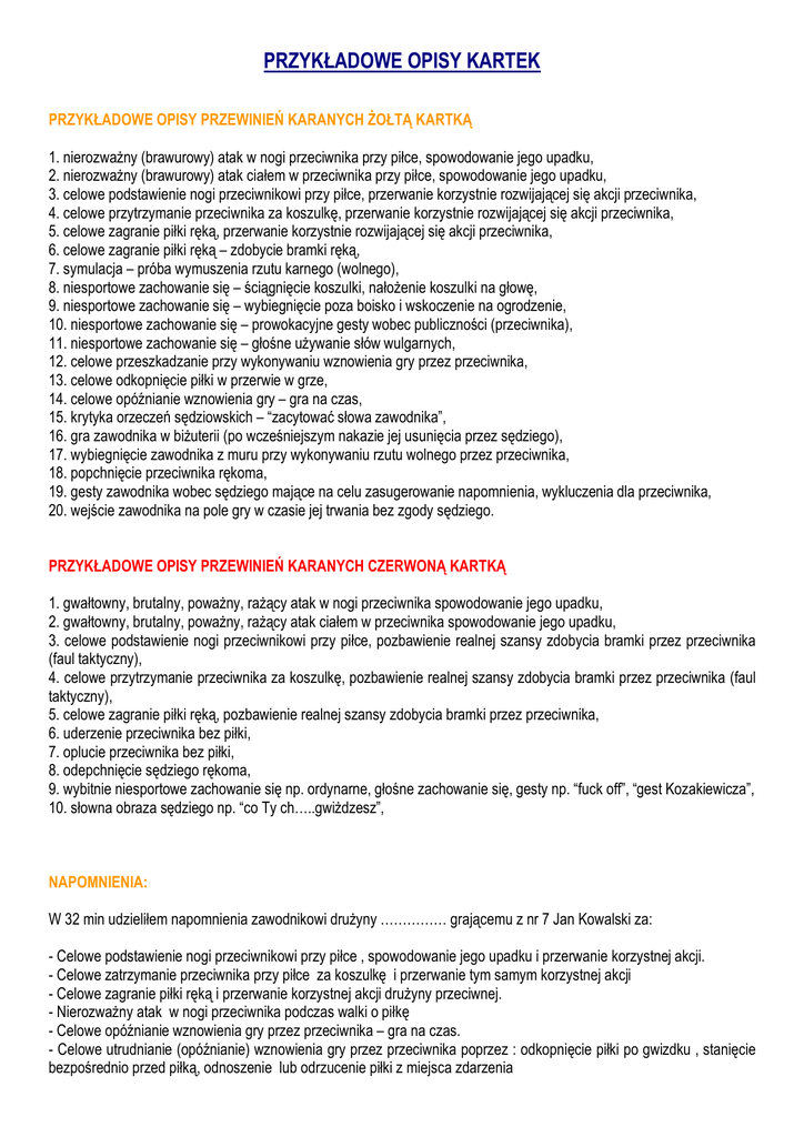PRZYKŁADOWE OPISY KARTEK PRZYKŁADOWE OPISY PRZEWINIEŃ KARANYCH ŻOŁTĄ KARTKĄ 1. nierozważny (brawurowy) atak w nogi przeciwnika przy piłce, spowodowanie jego upadku, 2. nierozważny (brawurowy) atak ciałem w przeciwnika przy piłce, spowodowanie jego upadku, 3. celowe podstawienie nogi przeciwnikowi przy piłce, przerwanie korzystnie rozwijającej się akcji przeciwnika, 4. celowe przytrzymanie przeciwnika za koszulkę, przerwanie korzystnie rozwijającej się akcji przeciwnika, 5. celowe zagranie piłki ręką, przerwanie korzystnie rozwijającej się akcji przeciwnika, 6. celowe zagranie piłki ręką – zdobycie bramki ręką, 7. symulacja – próba wymuszenia rzutu karnego (wolnego), 8. niesportowe zachowanie się – ściągnięcie koszulki, nałożenie koszulki na głowę, 9. niesportowe zachowanie się – wybiegnięcie poza boisko i wskoczenie na ogrodzenie, 10. niesportowe zachowanie się – prowokacyjne gesty wobec publiczności (przeciwnika), 11. niesportowe zachowanie się – głośne używanie słów wulgarnych, 12. celowe przeszkadzanie przy wykonywaniu wznowienia gry przez przeciwnika, 13. celowe odkopnięcie piłki w przerwie w grze, 14. celowe opóźnianie wznowienia gry – gra na czas, 15. krytyka orzeczeń sędziowskich – “zacytować słowa zawodnika”, 16. gra zawodnika w biżuterii (po wcześniejszym nakazie jej usunięcia przez sędziego), 17. wybiegnięcie zawodnika z muru przy wykonywaniu rzutu wolnego przez przeciwnika, 18. popchnięcie przeciwnika rękoma, 19. gesty zawodnika wobec sędziego mające na celu zasugerowanie napomnienia, wykluczenia dla przeciwnika, 20. wejście zawodnika na pole gry w czasie jej trwania bez zgody sędziego. PRZYKŁADOWE OPISY PRZEWINIEŃ KARANYCH CZERWONĄ KARTKĄ 1. gwałtowny, brutalny, poważny, rażący atak w nogi przeciwnika spowodowanie jego upadku, 2. gwałtowny, brutalny, poważny, rażący atak ciałem w przeciwnika spowodowanie jego upadku, 3. celowe podstawienie nogi przeciwnikowi przy piłce, pozbawienie realnej szansy zdobycia bramki przez przeciwnika (faul taktyczny), 4. celowe przytrzymanie przeciwnika za koszulkę, pozbawienie realnej szansy zdobycia bramki przez przeciwnika (faul taktyczny), 5. celowe zagranie piłki ręką, pozbawienie realnej szansy zdobycia bramki przez przeciwnika, 6. uderzenie przeciwnika bez piłki, 7. oplucie przeciwnika bez piłki, 8. odepchnięcie sędziego rękoma, 9. wybitnie niesportowe zachowanie się np. ordynarne, głośne zachowanie się, gesty np. “fuck off”, “gest Kozakiewicza”, 10. słowna obraza sędziego np. “co Ty ch…..gwiżdzesz”, NAPOMNIENIA: W 32 min udzieliłem napomnienia zawodnikowi drużyny …………… grającemu z nr 7 Jan Kowalski za: - Celowe podstawienie nogi przeciwnikowi przy piłce , spowodowanie jego upadku i przerwanie korzystnej akcji. - Celowe zatrzymanie przeciwnika przy piłce za koszulkę i przerwanie tym samym korzystnej akcji - Celowe zagranie piłki ręką i przerwanie korzystnej akcji drużyny przeciwnej. - Nierozważny atak w nogi przeciwnika podczas walki o piłkę - Celowe opóźnianie wznowienia gry przez przeciwnika – gra na czas. - Celowe utrudnianie (opóźnianie) wznowienia gry przez przeciwnika poprzez : odkopnięcie piłki po gwizdku , stanięcie bezpośrednio przed piłką, odnoszenie lub odrzucenie piłki z miejsca zdarzenia - Krytykę decyzji sędziego głównego ( asystenta ) słowami : Kurwa co gwizdasz , jaki do huja spalony , ślepy jesteś - Gwałtowne wymachiwanie rękoma w geście dezaprobaty wobec decyzji sędziego głównego (asystenta) - Wykonanie rzutu wolnego przed sygnałem gwizdka , pomimo, że zarządziłem wykonanie rzutu na gwizdek - Założenie koszulki na głowę w geście fetowania zdobycia bramki - Głośny , wyraźny okrzyk „kurwa mać” w geście niezadowolenia z nieudanego zagrania - Próbę oszukania sędziego poprzez symulowanie faulu - Próbę oszukania sędziego poprzez zdobycie bramki ręką - Nierozważne wymachiwanie rękoma podczas walki o piłkę i trafienie przeciwnika np. w głowę , szyję WYKLUCZENIA: W 32 min udzieliłem napomnienia zawodnikowi drużyny …………… grającemu z nr 7 Jan Kowalski za: - Otrzymanie 2 napomnień w zawodach ( szczegółowy opis napomnień musi być w pozycji NAPOMNIENIA ) - Celowe podstawienie nogi przeciwnikowi przy piłce ( zatrzymania za koszulkę ), spowodowanie jego upadku i pozbawienie go tym samym 100% sytuacji do zdobycia bramki - Celowe zagranie piłki ręką i pozbawienie tym samym zawodnika drużyny przeciwnej 100% sytuacji do zdobycia bramki - Uderzenie lub usiłowanie uderzenia , oplucie przeciwnika ( współpartnera) - Obrazę sędziego ( przeciwnika , współpartnera ) słowami : ty kutasie jeden , ślepy skurwysynie, ile ci dali za ten przekręt - Gwałtowny atak w nogi przeciwnika wykonany z nadmierną siłą , bez możliwości zagrania piłki - Użycie nieproporcjonalnej siły wobec przeciwnika podczas walki o piłkę - Atak w nogi przeciwnika podczas walki o piłkę , wykonany z nadmierną siłą i - Atak łokciem w przeciwnika podczas walki o piłkę , wykonany z nadmierną siłą - Gwałtowne , agresywne zachowanie wobec przeciwnika poza obszarem walki o piłkę