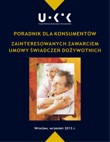 PORADNIK DLA KONSUMENTÓW ZAINTERESOWANYCH ZAWARCIEM UMOWY ŒWIADCZEÑ DO¯YWOTNICH Wroc³aw, wrzesieñ 2013 r. Co konsument powinien wiedzieć o umowach świadczeń dożywotnich Umowy świadczeń dożywotnich w potocznym języku są określane mianem „odwróconej hipoteki”. Nazwa ta jest nieprecyzyjna, ale utrwaliła się i jest powszechnie używana. Trzeba wyjaśniać, że termin „odwrócona hipoteka” funkcjonuje w dwóch znaczeniach. Po pierwsze, używa się go jako skrót pojęcia „odwrócony kredyt hipoteczny”. „Odwrócony kredyt hipoteczny” polega na tym, że właściciele nieruchomości (domów, mieszkań) zawierają z bankiem umowę, na mocy której uzyskują comiesięczną wypłatę (zwaną rentą), linię kredytową albo też jednorazową kwotę pieniędzy, w zamian za ustanowienie na rzecz banku hipoteki na tej nieruchomości. Główną cechą umów o „odwrócony kredyt hipoteczny” jest to, że właściciele nieruchomości, zawierając umowę, nie pozbywają się własności mieszkania. Jest to tzw. model kredytowy odwróconej hipoteki. „Odwrócony kredyt hipoteczny”, w przedstawionym rozumieniu, nie jest jeszcze uregulowany w polskim prawie. Jest jednak przygotowany przez Rząd projekt ustawy o odwróconym kredycie hipotecznym i nadal trwają nad nim prace legislacyjne. Jest zatem nadzieja na objęcie tego ważnego i trudnego zagadnienia szczególną regulacją ustawową. Pomimo braku ustawy o „odwróconym kredycie hipotecznym”, polski rynek znalazł sposób, aby zawierać umowy świadczeń dożywotnich, wykorzystując w tym celu przepisy kodeksu cywilnego, dotyczące umowy dożywocia i umowy renty. Pojawiło się na rynku kilku przedsiębiorców, którzy sięgnęli po rozwiązania dostępne w polskim prawie, tworząc z nich konstrukcje prawne, które mają spełniać funkcję zbliżoną do „odwróconego kredytu hipotecznego”. Z tych przyczyn również te umowy zwykło się określać mianem „odwróconej hipoteki”. Zaakcentować trzeba jednak, że jest podstawowa różnica między nimi, a umowami klasycznego „odwróconego kredytu hipotecznego” – w umowach zawieranych obecnie na polskim rynku konsument przenosi na przedsiębiorcę własność swojej nieruchomości w zamian za dożywotnie świadczenia w pieniądzu, już z chwilą jej zawarcia. Jest to tzw. model sprzedażowy odwróconej hipoteki. Przy komercyjnym zawieraniu umów świadczeń dożywotnich, regulacje kodeksu cywilnego nie zapewniają dostatecznej ochrony konsumentom, w szczególności z uwagi na ryzyko utraty prawa do mieszkania w nieruchomości objętej umową w przypadku objęcia tej nieruchomości egzekucją bądź w przypadku upadłości właściciela zamieszkiwanej przez konsumenta nieruchomości obciążonej służebnością mieszkania bądź użytkowaniem. Pojawił się zatem projekt ustawowego uregulowania umów przeniesienia własności 2 nieruchomości w zamian za dożywotnie świadczenia (jako funkcjonującej niezależnie od regulacji kodeksu cywilnego), w którym umowy te nazwano umowami renty dożywotniej. Konsumencie pamiętaj, że: obecnie w Polsce nie ma przepisów regulujących „odwrócony kredyt hipoteczny”, aktualnie na polskim rynku działają przedsiębiorcy, oferujący zawieranie umów na podstawie przepisów kodeksu cywilnego. Na podstawie tych umów uzyskuje się dożywotnie, okresowe świadczenia w pieniądzu w zamian za mieszkanie, którego właścicielem staje się ten przedsiębiorca - już z chwilą zawarcia umowy, trwają prace legislacyjne nad projektem ustawy o odwróconym kredycie hipotecznym i rencie dożywotniej. 3 Co należy wiedzieć przed zawarciem umów świadczeń dożywotnich z chwilą zawarcia umowy własność nieruchomości przechodzi na przedsiębiorcę. w zamian za mieszkanie będziesz otrzymywał dożywotnią rentę, której wysokość uzależniona jest od wartości Twojej nieruchomości (mieszkanie, dom, grunt) i Twojego wieku. Wysokość tej renty jest skalkulowana w taki sposób, że wynosi łącznie od 30 do 40 proc. wartości nieruchomości - uwzględniając średnią długość życia mężczyzny i kobiety (według danych GUS). Zamiast comiesięcznej renty może być udzielone tylko jednorazowe świadczenie, wypłacone przy zawarciu umowy. Wypłacana renta jest najczęściej pomniejszana o opłaty mieszkaniowe (sam czynsz lub dodatkowo także opłaty za media). Wtedy należności z tytułu tych opłat Spółka przekaże bezpośrednio na rachunek spółdzielni, zarządcy, wspólnoty czy dostawców mediów, a więc nie będziesz dysponował całością renty. Może się zdarzyć, że wysokość renty jest równa lub niższa niż kwota ww. opłat. Wobec tego „do ręki” nie otrzymasz gotówki, a nawet będziesz musiał pokryć powstałą różnicę. W takim wypadku korzyść konsumenta wyraża się w tym, że nie płaci on czynszu w ogóle lub też płaci go w niższej wysokości. Spółka, która stanie się właścicielem Twojego mieszkania powinna uiszczać te opłaty, do jakich zobowiązany jest właściciel, tj. podatek od nieruchomości, opłata za użytkowanie wieczyste. Z tych opłat senior powinien być „zwolniony”, ale nadal powinien uiszczać część lub całość opłat związanych z bieżącym korzystaniem z mieszkania (czynsz, media). zawierając umowę świadczeń dożywotnich przestajesz być właścicielem swojego domu; nie odziedziczą go także Twoi spadkobiercy; nie będzie im również przysługiwało prawo do jakichkolwiek świadczeń pieniężnych. niektóre Spółki zobowiązują się, że umożliwią spadkobiercom konsumenta zabranie z mieszkania wszystkich rzeczy ruchomych po jego śmierci. jeśli małżonkowie zawierają wspólnie umowę świadczeń dożywotnich, to nawet w razie śmierci jednego z nich świadczenia powinny być wypłacane. pomimo, że po zawarciu umowy nie będziesz już właścicielem swojego domu, będziesz miał prawo mieszkania w nim po ustanowieniu służebnośc