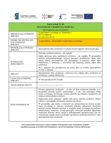 MIEJSCE ZAŁATWIENIA SPRAWY OSOBA WŁAŚCIWA DO ZAŁATWIENIA SPRAWY SPOSÓB ZAŁATWIENIA SPRAWY WYMAGANE DOKUMENTY Karta usługi Nr 60 ZGŁOSZENIE URODZENIA DZIECKA (Sporządzenie aktu urodzenia) Urząd Stanu Cywilnego ul. Siedlecka 3 08-114 Skórzec tel. (25) 631-28-23 Laura Potera - Kierownik Urzędu Stanu Cywilnego Sporządzenie aktu urodzenia i wydanie trzech odpisów skróconych aktu. Dowody osobiste rodziców - do wglądu Odpis skrócony aktu małżeństwa rodziców - do wglądu. W przypadku dziecka pozamałżeńskiego: wdowa powinna przedstawić odpis aktu zgonu męża, rozwiedziona lub pozostająca w separacji odpis aktu małżeństwa z adnotacją o rozwodzie lub separacji, panna odpis aktu urodzenia. W/w odpisów nie przedstawia się jeżeli akty te zostały sporządzone w USC w Skórcu OPŁATY Sporządzenie aktu urodzenia i pierwsze trzy odpisy aktu urodzenia są zwolnione z opłaty skarbowej. CZAS ZAŁATWIENIA SPRAWY W dniu przybycia do Urzędu TRYB ODWOŁAWCZY ----------------------------------Termin zgłoszenia urodzenia - 14 dni od dnia urodzenia dziecka, a w przypadku dziecka martwo urodzonego – 3 dni. Akt sporządza urząd stanu cywilnego, na którego terenie urodziło się dziecko, niezależnie od miejsca zamieszkania rodziców. Zgłoszenia może dokonać matka lub ojciec dziecka osobiście (oboje rodzice w przypadku dokonania uznania ojcostwa) INNE INFORMACJE W przypadku, gdy żadne z rodziców nie zamieszkuje na terenie urzędu stanu cywilnego w miejscu urodzenia dziecka, zgłoszenia urodzenia dziecka można dokonać również w urzędzie stanu cywilnego wg miejsca zamieszkania rodziców. Urząd sporządza wówczas protokół zgłoszenia urodzenia dziecka, który razem z dokumentami przekazywany jest do właściwego urzędu stanu cywilnego wg miejsca urodzenia dziecka w celu sporządzenia aktu urodzenia. Karta usług została opracowana w ramach projektu "Profesjonalny urząd - kompetentny urzędnik" współfinansowanego ze środków Unii Europejskiej w ramach Europejskiego Funduszu Społecznego FORMULARZ DO POBRANIA PODSTAWA PRAWNA ----------------------------Art. 38 i 39 ustawy z dnia z dnia 29 września 1986r. - prawo o aktach stanu cywilnego (Dz. U. z 2011r. Nr 212, poz.1264 z późn. zm.) Art.62 ustawy z dnia 25 lutego 1964r. kodeks rodzinny i opiekuńczy ( Dz. U. z 2012r., poz. 788 z późn. zm.) Opracowała : Laura Potera Karta usług została opracowana w ramach projektu "Profesjonalny urząd - kompetentny urzędnik" współfinansowanego ze środków Unii Europejskiej w ramach Europejskiego Funduszu Społecznego
