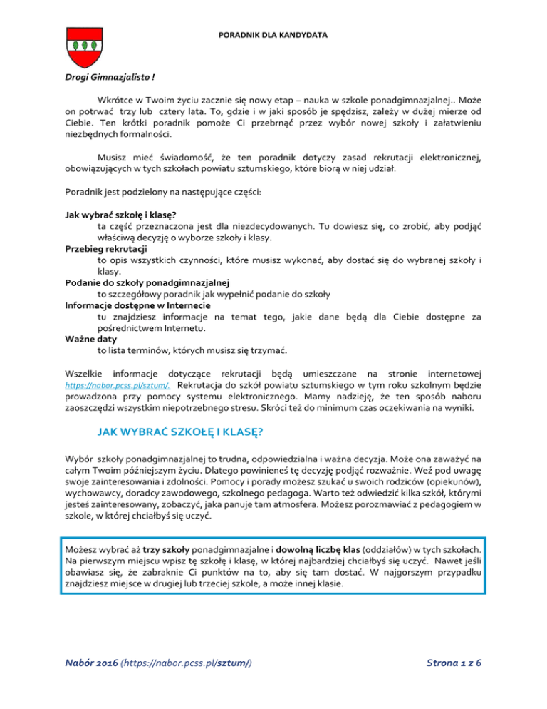 PORADNIK DLA KANDYDATA Drogi Gimnazjalisto ! Wkrótce w Twoim życiu zacznie się nowy etap – nauka w szkole ponadgimnazjalnej.. Może on potrwać trzy lub cztery lata. To, gdzie i w jaki sposób je spędzisz, zależy w dużej mierze od Ciebie. Ten krótki poradnik pomoże Ci przebrnąć przez wybór nowej szkoły i załatwieniu niezbędnych formalności. Musisz mieć świadomość, że ten poradnik dotyczy zasad rekrutacji elektronicznej, obowiązujących w tych szkołach powiatu sztumskiego, które biorą w niej udział. Poradnik jest podzielony na następujące części: Jak wybrać szkołę i klasę? ta część przeznaczona jest dla niezdecydowanych. Tu dowiesz się, co zrobić, aby podjąć właściwą decyzję o wyborze szkoły i klasy. Przebieg rekrutacji to opis wszystkich czynności, które musisz wykonać, aby dostać się do wybranej szkoły i klasy. Podanie do szkoły ponadgimnazjalnej to szczegółowy poradnik jak wypełnić podanie do szkoły Informacje dostępne w Internecie tu znajdziesz informacje na temat tego, jakie dane będą dla Ciebie dostępne za pośrednictwem Internetu. Ważne daty to lista terminów, których musisz się trzymać. Wszelkie informacje dotyczące rekrutacji będą umieszczane na stronie internetowej https://nabor.pcss.pl/sztum/. Rekrutacja do szkół powiatu sztumskiego w tym roku szkolnym będzie prowadzona przy pomocy systemu elektronicznego. Mamy nadzieję, że ten sposób naboru zaoszczędzi wszystkim niepotrzebnego stresu. Skróci też do minimum czas oczekiwania na wyniki. JAK WYBRAĆ SZKOŁĘ I KLASĘ? Wybór szkoły ponadgimnazjalnej to trudna, odpowiedzialna i ważna decyzja. Może ona zaważyć na całym Twoim późniejszym życiu. Dlatego powinieneś tę decyzję podjąć rozważnie. Weź pod uwagę swoje zainteresowania i zdolności. Pomocy i porady możesz szukać u swoich rodziców (opiekunów), wychowawcy, doradcy zawodowego, szkolnego pedagoga. Warto też odwiedzić kilka szkół, którymi jesteś zainteresowany, zobaczyć, jaka panuje tam atmosfera. Możesz porozmawiać z pedagogiem w szkole, w której chciałbyś się uczyć. Możesz wybrać aż trzy szkoły ponadgimnazjalne i dowolną liczbę klas (oddziałów) w tych szkołach. Na pierwszym miejscu wpisz tę szkołę i klasę, w której najbardziej chciałbyś się uczyć. Nawet jeśli obawiasz się, że zabraknie Ci punktów na to, aby się tam dostać. W najgorszym przypadku znajdziesz miejsce w drugiej lub trzeciej szkole, a może innej klasie. Nabór 2016 (https://nabor.pcss.pl/sztum/) Strona 1 z 6 PORADNIK DLA KANDYDATA PRZEBIEG REKRUTACJI Oto kilka sformułowań, które powinieneś znać przed przystąpieniem do rekrutacji: Lista preferencji Lista, na której wpisujesz szkoły i klasy, w których chciałbyś się w przyszłości uczyć. Szkoła pierwszego wyboru Szkoła, którą wpisałeś jako pierwszą na swojej liście preferencji. Rekrutacja składa się z następujących etapów (terminy dotyczące wszystkich etapów podane są na końcu tego dokumentu): Wybór szkół i klas, w których chcesz kontynuować naukę To oczywiście pierwszy krok. Wskazówki, jak to zrobić przedstawiliśmy w poprzedniej części tego poradnika. Wypełnienie i złożenie podania do szkoły ponadgimnazjalnej To formalne potwierdzenie Twojego wyboru. Podanie i sposób jego wypełnienia są szczegółowo opisane w następnej części poradnika. Zmiana listy preferencji Po otrzymaniu wyników egzaminu gimnazjalnego, masz czas na zmianę decyzji o wybranych szkołach i klasach. Być może poszło Ci na egzaminie lepiej, niż przypuszczałeś wcześniej. Będziesz mógł spróbować dostać się do szkół, gdzie jest większa konkurencja i wymagana jest większa liczba punktów. W tym celu wypełniasz podanie ponownie, podając nową listę preferencji. Podanie dostarczasz do szkoły 1 wyboru wg twoich nowych preferencji. Jeśli szkoła pierwszego wyboru się zmieniła, musisz najpierw anulować stare podanie w szkole pierwszego wyboru, a dopiero potem dostarczyć nowe podanie wraz z kompletem pozostałych dokumentów do nowej szkoły pierwszego wyboru. Dobrze przemyśl swoją decyzję, bowiem zmiany możesz dokonać tylko jeden raz w terminie określonym w l.p. 2 ważnych dat. Dostarczenie kopii świadectwa do szkoły pierwszego wyboru Wraz ze świadectwem otrzymasz trzy jego kopie potwierdzone przez Twoje gimnazjum. Aby brać udział w przydziale, musisz je zanieść do wszystkich szkół z Twojej listy preferencji. Jeśli wybrałeś tylko jedną szkołę, to wystarczy jedna kopia. Wraz z kopiami świadectw zanieś kopie zaświadczeń o wynikach egzaminu gimnazjalnego. Ogłoszenie wyników wstępnego przydziału Na podstawie Twojej listy preferencji oraz liczby punktów system dokona przydziału. Informację o tym, do której klasy się dostałeś, znajdziesz w Internecie oraz Twojej szkole pierwszego wyboru. Jeśli nie uda Ci się dostać do żadnej z klas, wówczas przejrzyj listę wolnych miejsc. Będzie ona dostępna w każdej szkole ponadgimnazjalnej oraz w Internecie. Wyniki dotyczą szkół powiatu sztumskiego uczestniczących w rekrutacji elektronicznej. Dostarczenie oryginału świadectwa do szkoły Jeśli dostałeś się do jednej z wybranych przez siebie szkół, jak najszybciej zanieś do niej świadectwo. W ten sposób potwierdzisz swoją wolę nauki w tej szkole. Nabór 2016 (https://nabor.pcss.pl/sztum/) Strona 2 z 6 PORADNIK DLA KANDYDATA Nabór uzupełniający Jeśli nie udało Ci się dostać do żadnej z wybranych szkół, przejrzyj listę wolnych miejsc. Wybierz jedną z klas, w których są jeszcze wolne miejsca. Idź do szkoły, do której należy ta klasa. Tam złóż podanie o przyjęcie do tej klasy wraz z kompletem oryginalnych dokumentów. Na tym rekrutacja się kończy. Od tej chwili jesteś uczniem szkoły ponadgimnazjalnej i zaczynają się wakacje! PODANIE DO SZKOŁY PONADGIMNAZJALNEJ Podanie składa się z czterech części: danych osobowych informacji o 