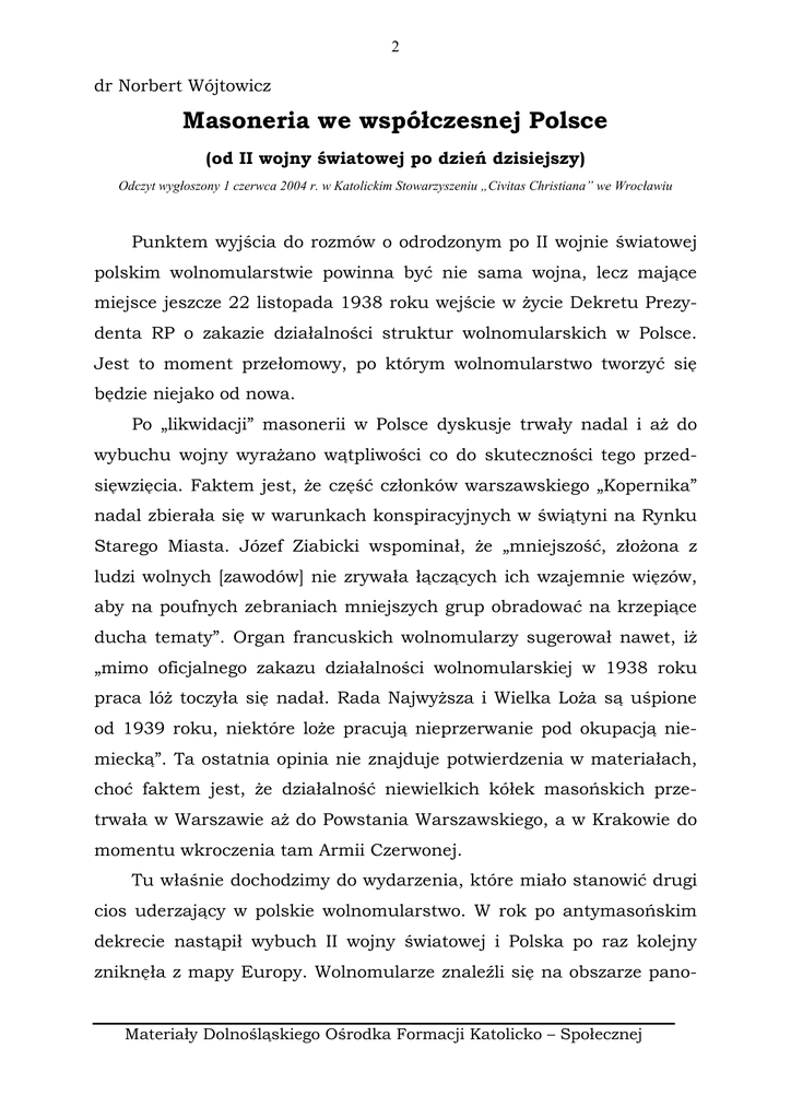 2 dr Norbert Wójtowicz Masoneria we współczesnej Polsce (od II wojny światowej po dzień dzisiejszy) Odczyt wygłoszony 1 czerwca 2004 r. w Katolickim Stowarzyszeniu „Civitas Christiana” we Wrocławiu Punktem wyjścia do rozmów o odrodzonym po II wojnie światowej polskim wolnomularstwie powinna być nie sama wojna, lecz mające miejsce jeszcze 22 listopada 1938 roku wejście w Ŝycie Dekretu Prezydenta RP o zakazie działalności struktur wolnomularskich w Polsce. Jest to moment przełomowy, po którym wolnomularstwo tworzyć się będzie niejako od nowa. Po „likwidacji” masonerii w Polsce dyskusje trwały nadal i aŜ do wybuchu wojny wyraŜano wątpliwości co do skuteczności tego przedsięwzięcia. Faktem jest, Ŝe część członków warszawskiego „Kopernika” nadal zbierała się w warunkach konspiracyjnych w świątyni na Rynku Starego Miasta. Józef Ziabicki wspominał, Ŝe „mniejszość, złoŜona z ludzi wolnych [zawodów] nie zrywała łączących ich wzajemnie więzów, aby na poufnych zebraniach mniejszych grup obradować na krzepiące ducha tematy”. Organ francuskich wolnomularzy sugerował nawet, iŜ „mimo oficjalnego zakazu działalności wolnomularskiej w 1938 roku praca lóŜ toczyła się nadał. Rada NajwyŜsza i Wielka LoŜa są uśpione od 1939 roku, niektóre loŜe pracują nieprzerwanie pod okupacją niemiecką”. Ta ostatnia opinia nie znajduje potwierdzenia w materiałach, choć faktem jest, Ŝe działalność niewielkich kółek masońskich przetrwała w Warszawie aŜ do Powstania Warszawskiego, a w Krakowie do momentu wkroczenia tam Armii Czerwonej. Tu właśnie dochodzimy do wydarzenia, które miało stanowić drugi cios uderzający w polskie wolnomularstwo. W rok po antymasońskim dekrecie nastąpił wybuch II wojny światowej i Polska po raz kolejny zniknęła z mapy Europy. Wolnomularze znaleźli się na obszarze pano- Materiały Dolnośląskiego Ośrodka Formacji Katolicko – Społecznej 3 wania władz hitlerowskich, które jak pisze Ludwik Hass „zinstytucjonalizowały walkę ze »sztuką królewską« w skali nie tylko krajowej, lecz i międzynarodowej”. Jak to wyglądało w Polsce? W lipcu 1940 roku Stanisław Stempowski został wezwany przez Gestapo, gdzie po krótkiej rozmowie zwolniono go, zobowiązując jedynie o napisanie memoriału na temat polskiego wolnomularstwia. W swoim opracowaniu zminimalizował on rolę masonerii w Polsce i podał jedynie nazwiska członków juŜ nieŜyjących, a tym samym nieosiągalnych dla aparatu represji. DąŜąc do pomniejszenia w swych zeznaniach roli wolnomularstwa w Drugiej Rzeczypospolitej zataił on ponadto fakt istnienia Rady NajwyŜszej Polski i podległych jej struktur stopni wyŜszych. Gestapo zdawało się nie zauwaŜyć, Ŝe otrzymany materiał jest – delikatnie mówiąc – nie do końca zgodny z prawdą. Autora memoriału nie spotkały Ŝadne przykrości. To zaledwie jednorazowe przesłuchanie bez Ŝadnych konsekwencji wydaje się nieco dziwne w sytuacji gdy nieustannie podkreśla się negatywny stosunek do wolnomularstwa władz hitlerowskich. Hass zauwaŜa, iŜ unik zastosowany przez Stanisława Stempowskiego mógł się udać w sytuacji gdy „aparat hitlerowski, gromadzący - przynajmniej od momentu dojścia do władzy w Niemczech - informacje o wolnomularstwie na świecie, w przypadku polskim, rzecz niemal wyjątkowa, nie rozporządzał dokumentacją bądź zeznaniami, które by pozwoliły na weryfikację treści memoriału”. JeŜeli nawet tak było, i władze hitlerowskie w istocie nie rozporządzały potrzebnymi informacjami, to w tym przypadku wygląda na to, Ŝe skore zazwyczaj do dociekań gestapo wykazało tu całkowity brak „dobrej woli”. W kontekście pojawiających się w licznych publikacjach opisach wskazujących na ich ogromną chęć działania w innych sprawach zdumienie musi budzić fakt udziału dawnych wolnomularzy w strukturach okupacyjnych władz stolicy w tym okresie. Byli to zresztą ludzie, których nazwiska bez trudu moŜna było znaleźć w publikowanych w okresie międzywojennym kalendaMateriały Dolnośląskiego Ośrodka Formacji Katolicko – Społecznej 4 rzach wolnomularskich. Znany powszechnie jako urzędnik Wielkiej LoŜy Narodowej Polski Emil Kipa został wicedyrektorem Biura Prezydialnego Zarządu Miejskiego stolicy, a równocześnie był nieoficjalnym łącznikiem komisarycznego burmistrza miasta Juliana Kulskiego (nb. równieŜ wolnomularza) z niemieckimi władzami miasta. W tym samym czasie podobny brak prześladowań spotykał i innych znanych powszechnie wolnomularzy (m.in. Zbigniew Skokowski i Marian Ponikiewski, którzy znaleźli zatrudnienie w Zakładzie Ubezpieczeń Społecznych w Warszawie). Nie da się ukryć, Ŝe ten obraz rozmija się nieco potocznym rozumieniem „represjonowania” jakiemu mieli być rzekomo poddawani wolnomularze. Tymczasem, jak to zanotował w jednej z prac Ludwik Hass, „skromne Ŝycie wolnomularskie toczyło się tu w sposób podobny jak przed wybuchem wojny”. Po wojnie wielu wolnomularzy znalazło się w nowych strukturach władzy aktywnie włączając się w budowę nowego systemu. Łukasz Kamiński wskazywał w swoich wyliczeniach, Ŝe spośród pozostałych w kraju „braci” aŜ 40,5% zajęło wysokie stanowiska w administracji państwowej (dyrektorzy departamentów, posłowie, a nawet ministrowie), 32,1% zostało wykładowcami wyŜszych uczelni, 9,5% objęło wysokie stanowiska w spółdzielczości. Swoistym symbolem przystosowania się wolnomularzy do nowej sytuacji stała się postać Henryka Kołodziejskiego, który odegrał znaczącą rolę przy tworzenia Tymczasowego Rządu Jedności Narodowej, a następnie był członkiem Krajowej Rady Narodowej i posłem na Sejm, w latach 1947-49 zajął eksponowane stanowisko prezesa NajwyŜszej Izby Kontroli, ponadto do śmierci był członkiem Rady Państwa. Włodzimierz Tarło-Maziński mówiąc o Kołodziejskim wskazywał, iŜ „jest [on] b