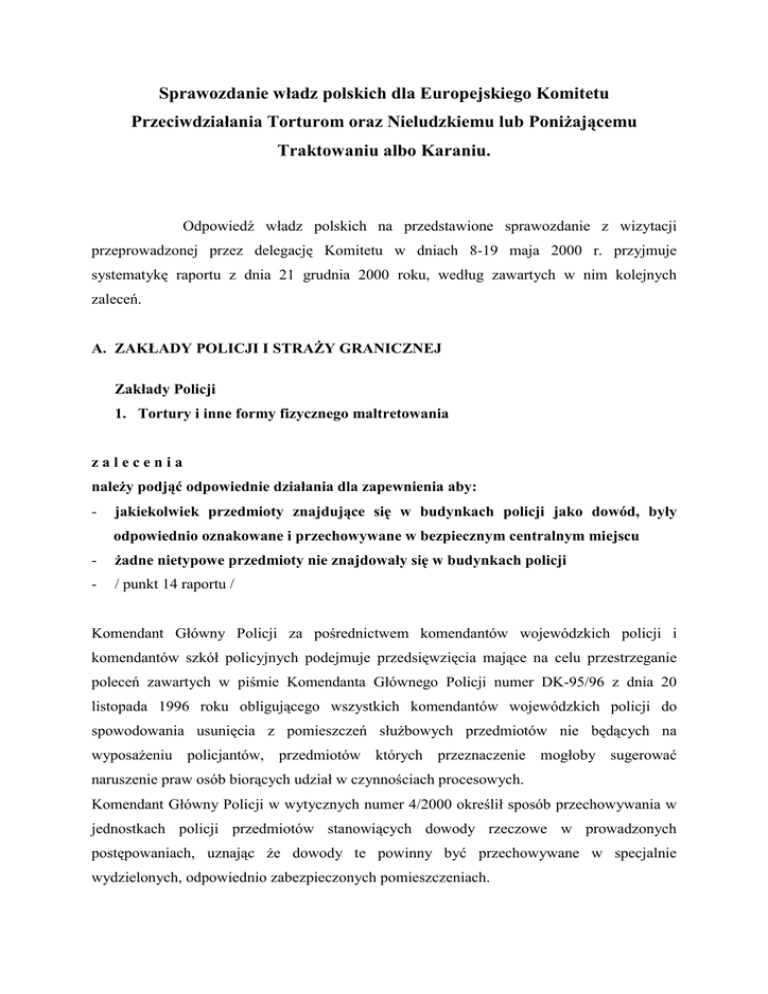 Sprawozdanie władz polskich dla Europejskiego Komitetu Przeciwdziałania Torturom oraz Nieludzkiemu lub Poniżającemu Traktowaniu albo Karaniu. Odpowiedź władz polskich na przedstawione sprawozdanie z wizytacji przeprowadzonej przez delegację Komitetu w dniach 8-19 maja 2000 r. przyjmuje systematykę raportu z dnia 21 grudnia 2000 roku, według zawartych w nim kolejnych zaleceń. A. ZAKŁADY POLICJI I STRAŻY GRANICZNEJ Zakłady Policji 1. Tortury i inne formy fizycznego maltretowania zalecenia należy podjąć odpowiednie działania dla zapewnienia aby: - jakiekolwiek przedmioty znajdujące się w budynkach policji jako dowód, były odpowiednio oznakowane i przechowywane w bezpiecznym centralnym miejscu - żadne nietypowe przedmioty nie znajdowały się w budynkach policji - / punkt 14 raportu / Komendant Główny Policji za pośrednictwem komendantów wojewódzkich policji i komendantów szkół policyjnych podejmuje przedsięwzięcia mające na celu przestrzeganie poleceń zawartych w piśmie Komendanta Głównego Policji numer DK-95/96 z dnia 20 listopada 1996 roku obligującego wszystkich komendantów wojewódzkich policji do spowodowania usunięcia z pomieszczeń służbowych przedmiotów nie będących na wyposażeniu policjantów, przedmiotów których przeznaczenie mogłoby sugerować naruszenie praw osób biorących udział w czynnościach procesowych. Komendant Główny Policji w wytycznych numer 4/2000 określił sposób przechowywania w jednostkach policji przedmiotów stanowiących dowody rzeczowe w prowadzonych postępowaniach, uznając że dowody te powinny być przechowywane w specjalnie wydzielonych, odpowiednio zabezpieczonych pomieszczeniach. 2 - starsi oficerowie policji przekazywali swojemu personelowi zdecydowane przesłanie, że nie niewłaściwe traktowanie osób zatrzymanych nie jest akceptowane i zostanie poddane surowym sankcjom - przypominać oficerom policji, że nie powinni używać więcej siły fizycznej niż jest to konieczne w celu zatrzymania osoby oraz że kiedy określona osoba jest już zatrzymana i znajduje się pod kontrolą, nie zachodzi potrzeba, aby policja biła taką osobę lub w inny niegodny sposób ją traktowała lub poniżała /punkt 14 raportu/. Komendant Główny Policji zlecił zwiększenie nadzoru przełożonych nad wykonywaniem przez podwładnych policjantów czynności służbowych zgodnie z prawem i regułami taktyki kryminalistycznej oraz w taki sposób by nie naruszać jakichkolwiek praw obywatelskich, w tym uprawnień przynależnych uczestnikom postępowania. Ustawa o Policji w artykule 16 ustęp 2 stanowi, że: - policjanci mogą stosować środki przymusu bezpośredniego odpowiadające potrzebom wynikającym z istniejącej sytuacji i niezbędne dla osiągnięcia podporządkowania się wydanym poleceniom, - zwrócić uwagę na przyswojenie i rozwój umiejętności komunikacji interpersonalnej podczas wstępnego i dalszego szkolenia pracowników policji - / punkt 15 raportu / Komendant Główny Policji zlecił w ramach procesu doskonalenia zawodowego policjantów uwzględnienie w większym stopniu niż dotychczas problematyki poszanowania praw obywatelskich oraz komunikacji interpersonalnej. wymagane informacje - środki prewencyjne podejmowane w związku z zapewnieniem wsparcia pracownikom policji, narażonym na udział w sytuacjach stresowych lub brutalnych w okresie 1999 r. i 2000 r. - / punkt 15 raportu / 3 Zgodnie z poleceniem komendanta Głównego Policji w grudniu 1999 roku wprowadzono oblogatoryjność powiadamiania psychologów policyjnych o wydarzeniach traumatycznych i silnie stresujących. Wprowadzenie takiej zasady do praktyki było możliwe dopiero po przeszkoleniu przynajmniej części psychologów w prowadzeniu debrefiengu /odreagowania psychologicznego/ oraz podejmowania interwencji kryzysowej. W 2000 roku psycholodzy interweniowali w 288 przypadkach. Z analizy danych dotyczących niesienia pomocy pracownikom policji narażonym na stres wynika, że poprawy wymaga przepływ informacji oraz podniesienie wiedzy przełożonych o możliwości korzystania z pomocy psychologów w wielu sytuacjach stresowych, nie tylko mających charakter wydarzeń traumatycznych. - liczba i rodzaj skarg na temat złego traktowania, skierowanych wobec policjantów oraz liczba postępowań karnych i dyscyplinarnych, które zostały przeprowadzone na podstawie skarg - wykaz sankcji karnych lub dyscyplinarnych nałożonych na oficerów policji orzeczonych w związku ze skargami na złe traktowanie - procedury dyscyplinarne stosowane wobec policjantów włączając środki bezpieczeństwa zapewniające ich obiektywność, właściwą dokumentację - / punkt 16 raportu/. Komenda Główna Policji dysponuje jedynie następującą statystyką dotyczącą prowadzonych w 1999 i 2000 roku postępowań dyscyplinarnych i karnych, która przedstawia niniejsze zestawienie. Ogółem liczba skarg Rodzaj skargi Stosowanie niedozwolonych metod fizycznych Użycie pałki gumowej lub miotacza W tym potwierdzonych 1999 2000 1999 2000 579 572 22 16 84 102 2 6 4 Wszystkie postępowania karne w sprawach dotyczących przemocy użytej przez policjantów, z mocy prawa prowadzone są przez prokuratorów bez udziału organów policji. Zasada ta gwarantuje pełny obiektywizm w toku prowadzonego postępowania. W latach 1999-2000 dane obejmujące wydarzenia dotyczące bezpośredniego, bezprawnego użycia przemocy w trakcie interwencji i wykonywania czynności procesowych zwłaszcza przesłuchań oraz liczby wszczętych postępowań przygotowawczych kształtuje się Przy wymuszeniu zeznań osobistych Pobicie obywateli oraz naruszenie innych dóbr następująco: W Liczba wydarzeń 1999 2000 1999 2000 1999 2000 6 10 10 12 6 8 10 12 35 34 54 49 34 34 53 45 19 13 19 20 19 14 19 20 Wszczęte sprawy karne czasie interwencji W Liczba policjantów objętych postępowaniem karnym 1999 2000 Liczba policjantów biorących udział w wydarzeniach czasie bójki Poniższa tabela