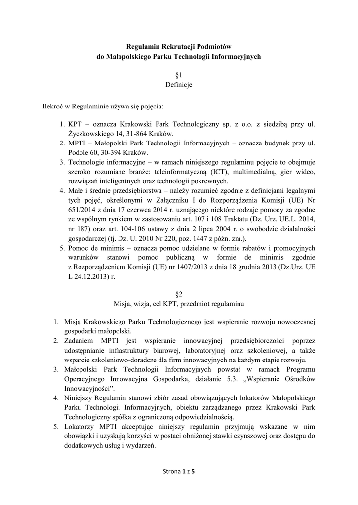 Regulamin Rekrutacji Podmiotów do Małopolskiego Parku Technologii Informacyjnych §1 Definicje Ilekroć w Regulaminie używa się pojęcia: 1. KPT – oznacza Krakowski Park Technologiczny sp. z o.o. z siedzibą przy ul. Życzkowskiego 14, 31-864 Kraków. 2. MPTI – Małopolski Park Technologii Informacyjnych – oznacza budynek przy ul. Podole 60, 30-394 Kraków. 3. Technologie informacyjne – w ramach niniejszego regulaminu pojęcie to obejmuje szeroko rozumiane branże: teleinformatyczną (ICT), multimedialną, gier wideo, rozwiązań inteligentnych oraz technologii pokrewnych. 4. Małe i średnie przedsiębiorstwa – należy rozumieć zgodnie z definicjami legalnymi tych pojęć, określonymi w Załączniku I do Rozporządzenia Komisji (UE) Nr 651/2014 z dnia 17 czerwca 2014 r. uznającego niektóre rodzaje pomocy za zgodne ze wspólnym rynkiem w zastosowaniu art. 107 i 108 Traktatu (Dz. Urz. UE.L. 2014, nr 187) oraz art. 104-106 ustawy z dnia 2 lipca 2004 r. o swobodzie działalności gospodarczej (tj. Dz. U. 2010 Nr 220, poz. 1447 z późn. zm.). 5. Pomoc de minimis – oznacza pomoc udzielane w formie rabatów i promocyjnych warunków stanowi pomoc publiczną w formie de minimis zgodnie z Rozporządzeniem Komisji (UE) nr 1407/2013 z dnia 18 grudnia 2013 (Dz.Urz. UE L 24.12.2013) r. §2 Misja, wizja, cel KPT, przedmiot regulaminu 1. Misją Krakowskiego Parku Technologicznego jest wspieranie rozwoju nowoczesnej gospodarki małopolski. 2. Zadaniem MPTI jest wspieranie innowacyjnej przedsiębiorczości poprzez udostępnianie infrastruktury biurowej, laboratoryjnej oraz szkoleniowej, a także wsparcie szkoleniowo-doradcze dla firm innowacyjnych na każdym etapie rozwoju. 3. Małopolski Park Technologii Informacyjnych powstał w ramach Programu Operacyjnego Innowacyjna Gospodarka, działanie 5.3. „Wspieranie Ośrodków Innowacyjności”. 4. Niniejszy Regulamin stanowi zbiór zasad obowiązujących lokatorów Małopolskiego Parku Technologii Informacyjnych, obiektu zarządzanego przez Krakowski Park Technologiczny spółka z ograniczoną odpowiedzialnością. 5. Lokatorzy MPTI akceptując niniejszy regulamin przyjmują wskazane w nim obowiązki i uzyskują korzyści w postaci obniżonej stawki czynszowej oraz dostępu do dodatkowych usług i wydarzeń. Strona 1 z 5 §3 Możliwości współpracy z KPT w ramach MPTI 1. W ramach MPTI firmy mogą przyjąć jedną z następujących możliwości współpracy: Firma Inkubowana - obejmujące wsparcie dla osób zainteresowanych rozpoczęciem działalności oraz młodych firm technologicznych (start-up) z branży ICT. Firma uzyskuje korzyści w postaci zniżek cen w ofercie MPTI (w formie pomocy de minimis), możliwość najmu małego biura, dostęp do różnych działań zespołu MPTI, oraz dodatkową opiekę mentorską i doradczą w ramach programu inkubacji. Lokator Parku Technologicznego - obejmujące wsparcie dla dojrzałych podmiotów prowadzących działalność badawczą, rozwojową lub innowacyjną w obszarze ICT. Firma uzyskuje zniżki cen w ofercie MPTI (w formie pomocy de minimis), oraz dostęp do części działań zespołu MPTI. 2. Dodatkowe formy najmu lokali w MPTI nie objęte tym regulaminem: Firma wspierająca - obejmujące ofertę dla instytucji otoczenia biznesu oraz firm świadczących usługi b2b przydatne zwłaszcza dla młodych przedsiębiorców oraz pozostałych podmiotów które mogą wygenerować wartość dodaną dla ośrodka. Przedsiębiorca ma możliwość wynajmu biura i korzystania z infrastruktury MPTI dzięki roli wspierającej jaką może pełnić wobec innych lokatorów. 3. Warunki skorzystania z oferty i współpracy z MPTI a. Firmy Inkubowane i. Warunki obowiązkowe 1. Podstawowym obszarem działania firmy jest ICT. 2. Przedsiębiorstwo zarejestrowane nie wcześniej niż 2 lata przed złożeniem kompletnego formularza aplikacyjnego do MPTI. Możliwe są wyjątki od tej zasady w uzasadnionych przypadkach. 3. Nie jest przedsiębiorstwem dużym w rozumieniu prawa unijnego. 4. Przedmiot działalności firmy, lub projekt ma charakter innowacyjny, a więc ma znamiona nowości procesowej, produktowej lub rynkowej. 5. Firma posiada zdolność do przyjmowania pomocy w formie pomocy de minimis ii. Fakultatywnie – dodatkowa wartość w procesie rekrutacji 1. Przedmiot działalności firmy, lub projekt związany ze specjalizacją inteligentne miast – smart city, lub rozwój gier video. 2. Firma uzyskała finansowanie kapitałowe (fundusze seed, venture, business angel, giełda), pozyskała finansowanie ze środków publicznych lub kredytowe. 3. Udokumentowane powiązanie z uczelnią wyższą. Strona 2 z 5 b. Lokatorzy Parku Technologicznego i. Warunki obowiązkowe: 1. Podstawowym obszarem działania firmy jest ICT. 2. Nie jest przedsiębiorstwem dużym w rozumieniu prawa unijnego. 3. Firma deklaruje gotowość do korzystania z infrastruktury MPTI. 4. Zdolność do przyjmowania pomocy w formie pomocy de minimis. ii. Warunki fakultatywne – dodatkowa wartość w procesie rekrutacji: 1. Przedmiot działalności firmy, lub projekt ma charakter innowacyjny, a więc ma znamiona nowości procesowej, produktowej lub rynkowej. 2. Przedmiot działalności firmy związany jest z branżą multimediów, specjalizacją inteligentnych miast – smart city, branżą gier, lub cloud computing. 3. Posiadanie przez firmę patentów własnych. 4. Uczestniczenie w sieci współpracy, klastrze lub innej inicjatywie sieciującej przedsiębiorców. W szczególności sieci powiązań z firmami współpracującymi z KPT. 4. Przystąpienie do współpracy z MPTI następuje w drodze podpisania umowy po pozytywnym przejściu procedury rekrutacyjnej (patrz punkt kolejny). Nabór formularzy aplikacyjnych prowadzony jest w trybie ciągłym. 5. Procedura rekrutacyjna: a. Wyrażenie chęci poprzez złożenie formularza aplikacyjnego. b. Uzyskanie pozytywnej decyzji KPT w następującej procedurze: i. Sprawdzenie przez pracowników KPT spełni