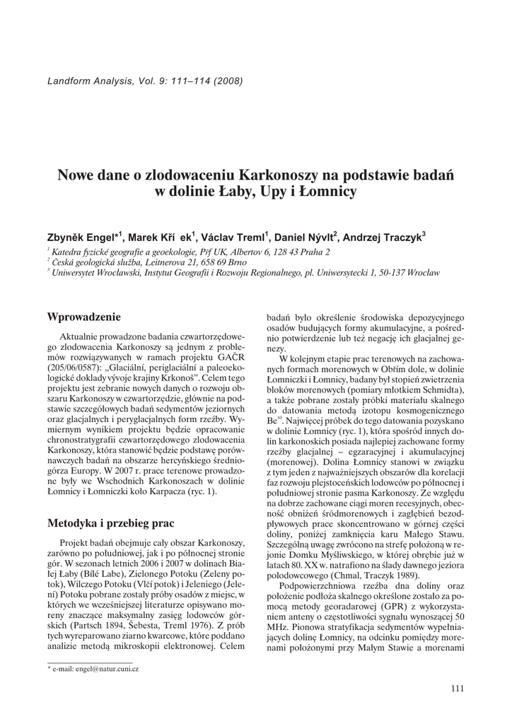 Landform Analysis, Vol. 9: 111–114 (2008) Nowe dane o zlodowaceniu Karkonoszy na podstawie badań w dolinie Łaby, Upy i Łomnicy Zbynìk Engel*1, Marek Køíek1, Václav Treml1, Daniel Nývlt2, Andrzej Traczyk3 1 Katedra fyzické geografie a geoekologie, Pøf UK, Albertov 6, 128 43 Praha 2 Èeská geologická služba, Leitnerova 21, 658 69 Brno 3 Uniwersytet Wrocławski, Instytut Geografii i Rozwoju Regionalnego, pl. Uniwersytecki 1, 50-137 Wrocław 2 Wprowadzenie Aktualnie prowadzone badania czwartorzędowego zlodowacenia Karkonoszy są jednym z problemów rozwiązywanych w ramach projektu GACR (205/06/0587): „Glaciální, periglaciální a paleoekologické doklady vývoje krajiny Krkonoš”. Celem tego projektu jest zebranie nowych danych o rozwoju obszaru Karkonoszy w czwartorzędzie, głównie na podstawie szczegółowych badań sedymentów jeziornych oraz glacjalnych i peryglacjalnych form rzeźby. Wymiernym wynikiem projektu będzie opracowanie chronostratygrafii czwartorzędowego zlodowacenia Karkonoszy, która stanowić będzie podstawę porównawczych badań na obszarze hercyńskiego średniogórza Europy. W 2007 r. prace terenowe prowadzone były we Wschodnich Karkonoszach w dolinie Łomnicy i Łomniczki koło Karpacza (ryc. 1). Metodyka i przebieg prac Projekt badań obejmuje cały obszar Karkonoszy, zarówno po południowej, jak i po północnej stronie gór. W sezonach letnich 2006 i 2007 w dolinach Białej Łaby (Bílé Labe), Zielonego Potoku (Zeleny potok), Wilczego Potoku (Vlèí potok) i Jeleniego (Jelení) Potoku pobrane zostały próby osadów z miejsc, w których we wcześniejszej literaturze opisywano moreny znaczące maksymalny zasięg lodowców górskich (Partsch 1894, Šebesta, Treml 1976). Z prób tych wyreparowano ziarno kwarcowe, które poddano analizie metodą mikroskopii elektronowej. Celem badań było określenie środowiska depozycyjnego osadów budujących formy akumulacyjne, a pośrednio potwierdzenie lub też negację ich glacjalnej genezy. W kolejnym etapie prac terenowych na zachowanych formach morenowych w Obøím dole, w dolinie Łomniczki i Łomnicy, badany był stopień zwietrzenia bloków morenowych (pomiary młotkiem Schmidta), a także pobrane zostały próbki materiału skalnego do datowania metodą izotopu kosmogenicznego 10 Be . Najwięcej próbek do tego datowania pozyskano w dolinie Łomnicy (ryc. 1), która spośród innych dolin karkonoskich posiada najlepiej zachowane formy rzeźby glacjalnej – egzaracyjnej i akumulacyjnej (morenowej). Dolina Łomnicy stanowi w związku z tym jeden z najważniejszych obszarów dla korelacji faz rozwoju plejstoceńskich lodowców po północnej i południowej stronie pasma Karkonoszy. Ze względu na dobrze zachowane ciągi moren recesyjnych, obecność obniżeń śródmorenowych i zagłębień bezodpływowych prace skoncentrowano w górnej części doliny, poniżej zamknięcia karu Małego Stawu. Szczególną uwagę zwrócono na strefę położoną w rejonie Domku Myśliwskiego, w której obrębie już w latach 80. XX w. natrafiono na ślady dawnego jeziora polodowcowego (Chmal, Traczyk 1989). Podpowierzchniowa rzeźba dna doliny oraz położenie podłoża skalnego określone zostało za pomocą metody georadarowej (GPR) z wykorzystaniem anteny o częstotliwości sygnału wynoszącej 50 MHz. Pionowa stratyfikacja sedymentów wypełniających dolinę Łomnicy, na odcinku pomiędzy morenami położonymi przy Małym Stawie a morenami * e-mail: [email protected] 111 Zbynìk Engel, Marek Køíek, Václav Treml, Daniel Nývlt, Andrzej Traczyk Ryc. 1. Fizjografia Karkonoszy z obiektami cytowanymi w tekście 1 – kary lodowcowe, 2 – jeziora i rzeki, 3 – ważniejsze kulminacje, 4 – poziomice co 200 m, 5 – granica państwowa leżącymi u wylotu karu, była określana georadarem wyposażonym w antenę 500 MHz, a ich miąższość tzw. sondami lawinowymi. Pozwoliło to na wyznaczenie przybliżonych granic niecki dawnego jeziora oraz stref jego największych głębokości. W najgłębszej partii tej niecki sedymentacyjnej, ok. 150 m na południe od Domku Myśliwskiego (1135 m n.p.m.), odwiercony został profil osadów o miąższości 850 cm. Z pozyskanego rdzenia pobierane były co 5 cm próbki materiału do analizy palinologicznej, zawartości węgla organicznego i nieorganicznego, składu granulometrycznego oraz podatności magnetycznej. Część materiału z próbek zawierających znaczną ilość substancji organicznej, z głębokości od 0 do 300 cm, przeznaczono również do badania izotopów tlenu. Ponadto z siedmiu poziomów organicznych pobrano dodatkowo próbki do datowań radiowęglowych. Wstępne rezultaty badań Z przeprowadzonych do tej pory prac uzyskano informacje dotyczące stopnia zwietrzenia materiału 112 morenowego, morfologii podpowierzchniowej strefy akumulacyjnej w obrębie dna karu Małego Stawu oraz stratyfikacji i charakteru sedymentów na stanowisku Domek Myśliwski. Oznaczenia wiekowe (ter10 moluminescencyjne i Be ) są w trakcie realizacji. Wartości odporności (odboju młotkiem Schmidta) powierzchni bloków morenowych w dolinie Łomnicy zawierały się w przedziale od 36,0 do 44,1, a na stanowisku w dolinie Łomniczki wyniosły 35,9. Z pomiarów tych wynika, że stopień zwietrzenia bloków morenowych w odpowiadających sobie strefach morenowych po północnej stronie (dolina Łomnicy i Łomniczki) i południowej stronie gór (dolina Upy) jest porównywalny. Wyższe odporności wykazują bloki morenowe zalegające na dnie karu Małego Stawu w górnej części doliny Łomnicy (40,2–42,4). Niższymi wartościami cechowały się natomiast bloki morenowe w dolnej części doliny Łomnicy przy jej połączeniu z doliną Złotego Potoku (36,0–37,2). Podobne zależności pomiędzy położeniem wysokościowym i morfologicznym form a ich stopniem zwietrzenia stwierdzono również w Obøím dole – karze polodowcowym wykształconym w zamknięciu doliny Upy. Wykazane na pod