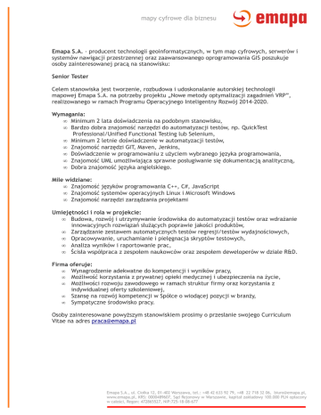 mapy cyfrowe dla biznesu Emapa S.A. - producent technologii geoinformatycznych, w tym map cyfrowych, serwerów i systemów nawigacji przestrzennej oraz zaawansowanego oprogramowania GIS poszukuje osoby zainteresowanej pracą na stanowisku: Senior Tester Celem stanowiska jest tworzenie, rozbudowa i udoskonalanie autorskiej technologii mapowej Emapa S.A. na potrzeby projektu „Nowe metody optymalizacji zagadnień VRP”, realizowanego w ramach Programu Operacyjnego Inteligentny Rozwój 2014-2020. Wymagania: • Minimum 2 lata doświadczenia na podobnym stanowisku, • Bardzo dobra znajomość narzędzi do automatyzacji testów, np. QuickTest Professional/Unified Functional Testing lub Selenium, • Minimum 2 letnie doświadczenie w automatyzacji testów, • Znajomość narzędzi GIT, Maven, Jenkins, • Doświadczenie w programowaniu z użyciem wybranego języka programowania, • Znajomość UML umożliwiająca sprawne posługiwanie się dokumentacją analityczną, • Dobra znajomość języka angielskiego. Mile widziane: • Znajomość języków programowania C++, C#, JavaScript • Znajomość systemów operacyjnych Linux i Microsoft Windows • Znajomość narzędzi zarządzania projektami Umiejętności i rola w projekcie: • Budowa, rozwój i utrzymywanie środowiska do automatyzacji testów oraz wdrażanie innowacyjnych rozwiązań służących poprawie jakości produktów, • Zarządzanie zestawem automatycznych testów regresji/testów wydajnościowych, • Opracowywanie, uruchamianie i pielęgnacja skryptów testowych, • Analiza wyników i raportowanie prac, • Ścisła współpraca z zespołem naukowców oraz zespołem deweloperów w dziale R&D. Firma oferuje: • Wynagrodzenie adekwatne do kompetencji i wyników pracy, • Możliwość korzystania z prywatnej opieki medycznej i ubezpieczenia na życie, • Możliwości rozwoju zawodowego w ramach struktur firmy oraz korzystania z indywidualnej oferty szkoleniowej, • Szansę na rozwój kompetencji w Spółce o wiodącej pozycji w branży, • Sympatyczne środowisko pracy. Osoby zainteresowane powyższym stanowiskiem prosimy o przesłanie swojego Curriculum Vitae na adres [email protected] Emapa S.A., ul. Ciołka 12, 01-402 Warszawa, tel.: +48 42 633 92 79, +48 22 718 32 06, [email protected], www.emapa.pl, KRS: 0000489607, Sąd Rejonowy w Warszawie, kapitał zakładowy 100.000 PLN opłacony w całości, Regon: 472865527, NIP:725-18-08-677