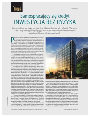 PREZENTACJA Samospłacający się kredyt INWESTYCJA BEZ RYZYKA Czy to możliwe, aby wziąć pożyczkę i nie wkładać złotówki w jej spłacanie? Owszem. Takie szczęście mają osoby kupujące mieszkania pod wynajem. Obecnie rośnie popularność inwestycji typu aparthotel. FOT.: MATERIAŁY PRASOWE P osiadając na własność mieszkanie w aparthotelu, można je przekazać w ręce operatora w celu wygenerowania zysków. Na podstawie symulacji korzyści z inwestycji Apartamenty Wola Invest, należącej do J.W. Construction Holding S.A., wynika, że przy zakupie apartamentu o powierzchni 21 mkw. zapłacimy 157,5 tys. zł netto za lokal. Do tego należy doliczyć wykończenie i wyposażenie w kwocie 33,6 tys. zł. Gwarantowana przez dewelopera stopa zwrotu w skali roku to 5 proc. – czyli ponad 9,5 tys. zł, co na miesiąc daje nam kwotę ok. 800 zł. Ale to nie wszystko. J.W. Construction zapewnia podział zysku 50 proc. na 50 proc., to oznacza, że przy 70-proc. obłożeniu aparthotelu rentowność wzrośnie do ponad 10 proc. w skali roku, czyli wyniesie dwa razy więcej od kwoty gwarantowanej. – Zakup apartamentu w Wola Invest to bezpieczna i dochodowa inwestycja. W ramach obsługi gwarantujemy nie tylko stopę zwrotu min. 5 proc. w skali roku i podział zysku przewyższający tę wartość - 50 proc. na 50 proc, ale jako operator aparthotelu sami będziemy ponosić koszty, takie jak czynsz, podatki od nieruchomości i użytkowania wieczystego czy ubezpieczenie. Umowę zawieramy na 10 lat, co oznacza gwarancję przepływów finansowych przez cały ten okres – mówi Józef Wojciechowski, przewodniczący rady nadzorczej J.W. Construction Holding S.A. Określając opłacalność inwestycji, należy rozważyć także jej lokalizację, standard wykończenia budynku czy zalety najbliższego otoczenia. Apartamenty Wola Invest to wygodne i prestiżowe mieszkania położone w wyśmienitej lokalizacji, u zbiegu ulic Kasprzaka i Alei Prymasa Tysiąclecia w Warszawie. Oferta aparthotelu to aż 416 klimatyzowanych i urządzonych w najwyższym standardzie apartamentów, składających się z salonu z aneksem kuchennym, łazienki i sypialni, a także balkonu. Aparthotel posiadać będzie dwupoziomowe lobby, które zaaranżowane zostanie z użyciem materiałów klasy premium: szlachetnych odmian kamienia i drewna oraz metali. Ekskluzywne elementy dekoracyjne nadadzą częściom wspólnym wyraz szykownej elegancji. Wysokie na niemal trzy metry wnętrza będą rozświetlone dzięki dużym oknom. Apartamenty Wola Invest objęte zostaną serwisem 5-gwiazdkowego hotelu. Do dyspozycji gości będzie całodobowa recepcja, konsjerż, room-service czy punkty biurowe i handlowe oraz parking podziemny. Na mieszkańców czekać będzie także przestronna restauracja, samoobsługowa pralnia oraz klub fitness. Zakup mieszkania w aparthotelu na własność to nie tylko szansa na samospłacający się kredyt lub czysty zarobek, ale także możliwość spędzania wolnego czasu w tym miejscu bez dodatkowych kosztów. - Inwestycja skierowana jest przede wszystkim do osób chcących ulokować pieniądze w nieruchomości najwyższej klasy, z której będą mogli korzystać, kiedy przyjdzie im na to ochota. Apartamenty są własnością osób prywatnych, a nie firmy zarządzającej. Oznacza to, że właściciele mogą nimi swobodnie dysponować - dodaje Józef Wojciechowski. Generalny wykonawca i operator Apartamentów Wola Invest, J.W. Construction Holding S.A., to lider nie tylko na rynku mieszkaniowym, ale także hotelarskim. Spółka posiada 15-letnie doświadczenie w prowadze- niu szeroko zakrojonej działalności hotelowej w oparciu o sieć hoteli 500 w całej Polsce i wysokiej klasy hotel Czarny Potok Resort & SPA w Krynicy Zdroju. Z końcem listopada br. Spółka otwiera kolejny - czterogwiazdkowy hotel Dana w Szczecinie. W projekcie Apartamenty Wola Invest deweloper zapewnia pełen nadzór nad procesem budowy aż po wykończenie i wyposażenie lokali zgodnie z ich docelową funkcją. Po oddaniu budynków do użytku spółka będzie zarządzać i administrować obiektem, a także prowadzić działania reklamowe i obsługę zarządzania najmem. Niezależnie od tego czy zdecydujemy się na zakup lokalu dla siebie czy pod wynajem trzeba pamiętać, że inwestycja w nieruchomość to dobry i bezpieczny pomysł na lokatę kapitału. Z jednej strony kluczowym rozwiązaniem jest wykorzystanie miesięcznych wpływów z wypracowanego zysku, które zbilansują koszty hipotecznego kredytu bankowego, finansującego zakup nieruchomości. Z drugiej natomiast rentowność lokaty w postaci mieszkania wiąże się ze wzrostem jego wartości w czasie. Warto więc przyjrzeć się ciekawym ofertom, które pojawiają się na rynku. Jedną z nich jest z pewnością Apartamenty Wola Invest. Szczegółowe informacje na temat inwestycji www.wolainvest.pl; 22 777 9000. J.W. Construction Holding S.A.