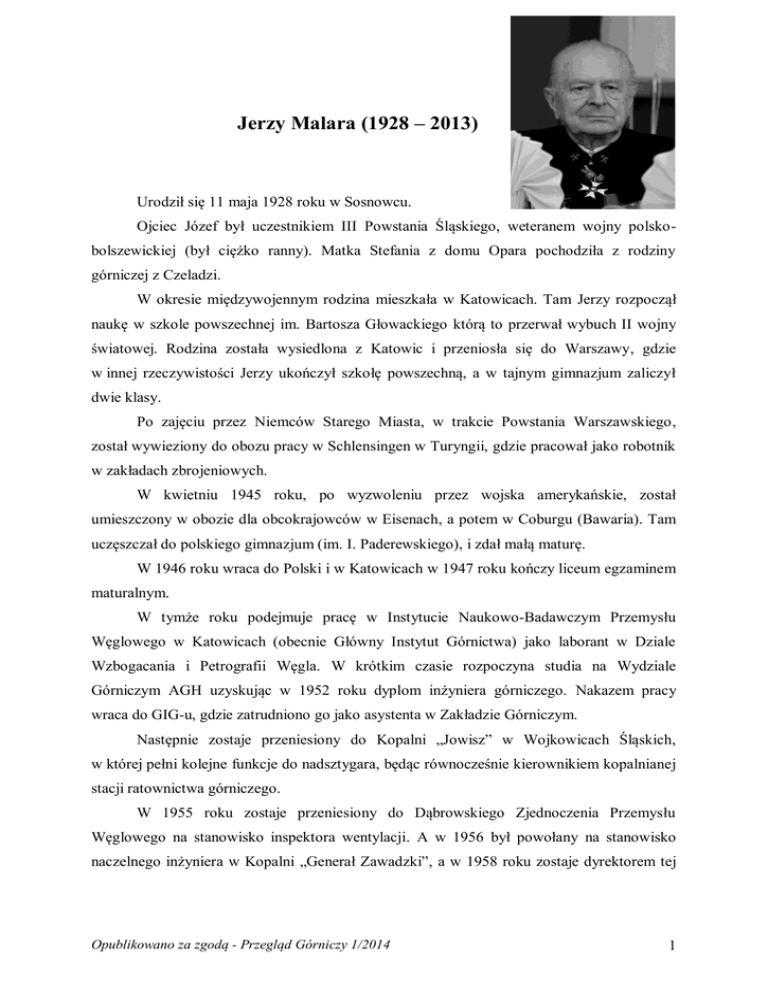 Jerzy Malara (1928 – 2013) Urodził się 11 maja 1928 roku w Sosnowcu. Ojciec Józef był uczestnikiem III Powstania Śląskiego, weteranem wojny polskobolszewickiej (był ciężko ranny). Matka Stefania z domu Opara pochodziła z rodziny górniczej z Czeladzi. W okresie międzywojennym rodzina mieszkała w Katowicach. Tam Jerzy rozpoczął naukę w szkole powszechnej im. Bartosza Głowackiego którą to przerwał wybuch II wojny światowej. Rodzina została wysiedlona z Katowic i przeniosła się do Warszawy, gdzie w innej rzeczywistości Jerzy ukończył szkołę powszechną, a w tajnym gimnazjum zaliczył dwie klasy. Po zajęciu przez Niemców Starego Miasta, w trakcie Powstania Warszawskiego, został wywieziony do obozu pracy w Schlensingen w Turyngii, gdzie pracował jako robotnik w zakładach zbrojeniowych. W kwietniu 1945 roku, po wyzwoleniu przez wojska amerykańskie, został umieszczony w obozie dla obcokrajowców w Eisenach, a potem w Coburgu (Bawaria). Tam uczęszczał do polskiego gimnazjum (im. I. Paderewskiego), i zdał małą maturę. W 1946 roku wraca do Polski i w Katowicach w 1947 roku kończy liceum egzaminem maturalnym. W tymże roku podejmuje pracę w Instytucie Naukowo-Badawczym Przemysłu Węglowego w Katowicach (obecnie Główny Instytut Górnictwa) jako laborant w Dziale Wzbogacania i Petrografii Węgla. W krótkim czasie rozpoczyna studia na Wydziale Górniczym AGH uzyskując w 1952 roku dyplom inżyniera górniczego. Nakazem pracy wraca do GIG-u, gdzie zatrudniono go jako asystenta w Zakładzie Górniczym. Następnie zostaje przeniesiony do Kopalni „Jowisz” w Wojkowicach Śląskich, w której pełni kolejne funkcje do nadsztygara, będąc równocześnie kierownikiem kopalnianej stacji ratownictwa górniczego. W 1955 roku zostaje przeniesiony do Dąbrowskiego Zjednoczenia Przemysłu Węglowego na stanowisko inspektora wentylacji. A w 1956 był powołany na stanowisko naczelnego inżyniera w Kopalni „Generał Zawadzki”, a w 1958 roku zostaje dyrektorem tej Opublikowano za zgodą - Przegląd Górniczy 1/2014 1 kopalni. W tym czasie uzupełnia studia na Wydziale Górniczym AGH uzyskując dyplom magistra inżyniera górnictwa. W latach 1969 – 1974 pracuje w Wyższym Urzędzie Górniczym na stanowisku Wiceprezesa. Następnie zostaje przeniesiony do Ministerstwa Górnictwa i Energetyki, gdzie powołano go na stanowisko Generalnego Dyrektora. W latach 1978 – 1986 pełni funkcję Wiceministra (Podsekretarza Stanu). W 1986 roku zostaje powołany na Prezesa Wyższego Urzędu Górniczego pełniąc tą funkcję do przejścia na emeryturę w czerwcu 1989 roku. Był członkiem Stowarzyszenia Wychowanków Akademii Górniczo-Hutniczej. Dwukrotnie (1975 – 1981 i 1983 – 1991) był Prezesem Stowarzyszenia Inżynierów i Techników Górnictwa. Został Honorowym Prezesem SITG. Zostaje przewodniczącym Sądu Koleżeńskiego oraz przewodniczącym Komisji Wyróżnień i Odznaczeń. W latach 1975 – 2005 był redaktorem naczelnym Przeglądu Górniczego. Od 2009 roku wchodził w skład Rady Programowej, a następnie Rady Naukowej Przeglądu Górniczego pełniąc funkcję sekretarza tych organów. Przez wiele lat był członkiem Komitetu Organizacyjnego Światowego Kongresu Górniczego, pełnił też funkcję przewodniczącego Polskiego Narodowego Komitetu Organizacyjnego tej Międzynarodowej Organizacji, został też Honorowym Członkiem Komitetu Organizacyjnego ŚKG. Współpracuje z organizacjami górniczymi zagranicą. Zostaje Honorowym Członkiem Stowarzyszenia Inżynierów Indii. Otrzymał odznaczenia i wyróżnienia zagraniczne – radzieckie, węgierskie, czechosłowackie i jugosłowiańskie. Posiada liczne odznaczenia krajowe: Krzyż Komandorski (1998), Krzyż Kawalerski i Oficerski Orderu Odrodzenia Polski; Brązowy i Złoty Krzyż Zasługi; Order Sztandaru Pracy I i II klasy; Medal Zasłużonego Górnika PRL; Medal Zasłużonego dla Zdrowia Narodu. Stowarzyszenie Inżynierów i Techników Górnictwa uhonorowało Jerzego Malarę odznaczeniami: Zasłużony Działacz SITG, Złotą i Srebrną Odznaką Zasłużony dla Stowarzyszenia, Laurem Zasług. Posiadał Złotą i Srebrną Odznakę Naczelnej Organizacji Technicznej. Jerzy Malara jest autorem i współautorem wielu artykułów publikowanych na łamach czasopism technicznych oraz referatów prezentowanych na sympozjach krajowych i zagranicznych. W ostatnich latach przeprowadził krytyczną analizę okresu restrukturyzacji górnictwa na tle historii międzywojennej i powojennej przemysłu węglowego. Opublikował w Czasopiśmie Technicznym obszerny artykuł „Restrukturyzacja czy likwidacja polskiego przemysłu węglowego” (nr 140 z 2009 r.). Na ten temat pisał też w czasopiśmie Opublikowano za zgodą - Przegląd Górniczy 1/2014 2 Stowarzyszenia Wychowanków AGH – Vivat Akademia . Na łamach Wspólnych Spraw czasopisma SITG opublikował analizę „Ocena aktualnej sytuacji i perspektyw krajowego górnictwa węglowego”, a w roku 2013 dwuczęściowy esej „Restrukturyzacja górnictwa węgla kamiennego – mity i fakty”, a także analizę „Wpływ eksportu węgla na wyniki ekonomiczne przemysłu węglowego”. Jerzy Malara był w latach 2011 – 2012 publicystą Nowego Kuriera – Polish Canadian Independent Courier (Toronto – Kanada) zamieszczając w nim swe felietony. Całe życie kierował się dewizą Stanisława Staszica: „BYĆ NARODOWI UŻYTECZNYM”. Życiowymi autorytetami był właśnie Stanisław Staszic oraz Bolesław Krupiński. Jego pasją była filatelistyka, wędkowanie i majsterkowanie. Jerzy Malara zmarł w Katowicach 15 listopada 2013 roku. Jest pochowany na Cmentarzu przy ul. Sienkiewicza. Opublikowano za zgodą - Przegląd Górniczy 1/2014 3