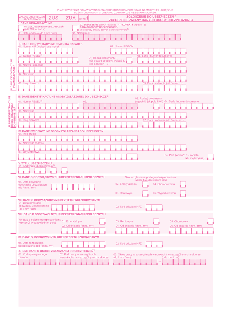 P£ATNIK WYPE£NIA POLA W WYZNACZONYCH KRATKACH KOMPUTEROWO, NA MASZYNIE LUB RÊCZNIE DU¯YMI DRUKOWANYMI LITERAMI, CZARNYM LUB NIEBIESKIM KOLOREM. 01. ZG£OSZENIE DO UBEZPIECZEÑ (jeœli TAK, wpisaæ X) 03. Data nadania (dd / mm / rrrr) 02. ZG£OSZENIE ZMIANY (wpisaæ - 1) / KOREKTY (wpisaæ - 2) DANYCH OSOBY UBEZPIECZONEJ (nie dotyczy zmiany danych identyfikacyjnych) 1) 04. Nalepka „R” 02. Numer REGON 01. Numer NIP (wpisaæ bez kresek) 03. Numer PESEL 2) 04. Rodzaj dokumentu: jeœli dowód osobisty, wpisaæ 1, jeœli paszport - 2 III. DANE IDENTYFIKACYJNE OSOBY ZG£ASZANEJ DO UBEZPIECZEÑ 09. Data urodzenia (dd / mm / rrrr) 01. Numer PESEL 2) 02. 07. Data urodzenia (dd / mm / rrrr) 3) 01. Data powstania obowi¹zku ubezpieczeñ (dd / mm / rrrr) 01. Data powstania obowi¹zku ubezpieczenia (dd / mm / rrrr) 02. Emerytalnemu 04. Chorobowemu 03. Rentowym 05. Wypadkowemu 02. Kod oddzia³u NFZ 02. Kod oddzia³u NFZ 4) X. INNE DANE O OSOBIE ZG£ASZANEJ DO UBEZPIECZEÑ 01. Kod wykonywanego 02. Kod pracy w szczególnych zawodu warunkach / w szczególnym charakterze 03. Okres pracy w szczególnych warunkach / w szczególnym charakterze (dd / mm / rrrr) (dd / mm / rrrr) P£ATNIK WYPE£NIA POLA W WYZNACZONYCH KRATKACH KOMPUTEROWO, NA MASZYNIE LUB RÊCZNIE DU¯YMI DRUKOWANYMI LITERAMI, CZARNYM LUB NIEBIESKIM KOLOREM. XI. ADRES ZAMELDOWANIA NA STA£E MIEJSCE POBYTU 08. Symbol pañstwa - zagraniczny kod pocztowy (wype³niæ w przypadku, gdy adres jest inny ni¿ polski) _ XII. ADRES ZAMIESZKANIA (wpisaæ, jeœli adres zamieszkania jest inny ni¿ adres zameldowania na sta³e miejsce pobytu) 08. Symbol pañstwa - zagraniczny kod pocztowy (wype³niæ w przypadku, gdy adres jest inny ni¿ polski) _ XIII. ADRES DO KORESPONDENCJI (wpisaæ, jeœli adres do korespondencji jest inny ni¿ adres zameldowania na sta³e miejsce pobytu lub adres zamieszkania) 08. Symbol pañstwa - zagraniczny kod pocztowy (wype³niæ w przypadku, gdy adres jest inny ni¿ polski) _ XIV. OŒWIADCZENIE P£ATNIKA SK£ADEK XV. OŒWIADCZENIE OSOBY ZG£ASZANEJ / ZG£OSZONEJ DO UBEZPIECZENIA Oœwiadczam, ¿e dane zawarte w formularzu s¹ zgodne ze stanem prawnym i faktycznym. Jestem œwiadomy(-ma) odpowiedzialnoœci karnej za zeznanie nieprawdy lub zatajenie prawdy. Oœwiadczam, ¿e dane zawarte w formularzu s¹ zgodne ze stanem prawnym i faktycznym. Jestem œwiadomy(-ma) odpowiedzialnoœci karnej za zeznanie nieprawdy lub zatajenie prawdy. XVI. ADNOTACJE ZUS 1) W przypadku zmiany danych identyfikacyjnych nale¿y wype³niæ formularz ZUS ZIUA. PESEL podaje siê, o ile zosta³ nadany. Dla okreœlonego kodu tytu³u ubezpieczenia nale¿y wype³niæ formularz ZUS ZAA.. 4) Blok X. wype³nia siê w celu zg³oszenia / korekty danych dotycz¹cych okresu sprzed 1 stycznia 2009 r. 2) Numer 3)