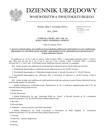 DZIENNIK URZĘDOWY WOJEWÓDZTWA ŚWIĘTOKRZYSKIEGO Kielce, dnia 1 września 2016 r. Elektronicznie podpisany przez: Lech Hamera Poz. 2664 Data: 2016-09-01 11:35:46 UCHWAŁA NR RG - XXI / 246 / 16 RADY GMINY SITKÓWKA-NOWINY z dnia 29 sierpnia 2016 r. w sprawie ustalenia planu sieci publicznych przedszkoli, publicznych szkół podstawowych i publicznego gimnazjum oraz określenia granic obwodów szkół podstawowych i gimnazjum prowadzonych przez Gminę Sitkówka-Nowiny Na podstawie art. 18 ust. 2 pkt 15 ustawy z dnia 8 marca 1990 r. o samorządzie gminnym (Dz.U. z 2016 r. poz. 446) oraz art. 14a ust. 1, art. 17 ust. 4 oraz art. 17 ust. 7 ustawy z dnia 7 września 1991 r. o systemie oświaty (Dz. U. z 2015, poz. 2156) Rada Gminy Sitkówka-Nowiny uchwala, co następuje: § 1. Ustala się plan sieci publicznych przedszkoli prowadzonych przez Gminę Sitkówka-Nowiny: 1. Przedszkole Samorządowe w Bolechowicach, Bolechowice nr 10, 26-052 Nowiny, 2. Przedszkole Samorządowe z Oddziałam Integracyjnymi w Kowali, Kowala nr 51, 26-052 Nowiny, 3. Przedszkole Samorządowe im. „Pluszowy Miś” w Nowinach, ul. Parkowa 11, 26-052 Nowiny z Filią w Szewcach. § 2. Ustala się plan sieci publicznych szkół podstawowych prowadzonych przez Gminę Sitkówka-Nowiny oraz określa granice ich obwodów: 1. Szkoła Podstawowa w Bolechowicach, Bolechowice nr 10, o strukturze organizacyjnej klas I-VI, do obwodu której należą miejscowości: 1) Bolechowice, 2) Wola Murowana. 2. Szkoła Podstawowa im. gen. Antoniego Hedy ps. „Szary” w Kowali, Kowala nr 51, o strukturze organizacyjnej klas I-VI, do obwodu której należą miejscowości: 1) Kowala, 2) Kowala Mała, 3) Sitkówka – numery parzyste oraz bloki mieszkalne. 3. Szkoła Podstawowa im. Orląt Lwowskich w Nowinach, ul. Białe Zagłębie 21, o strukturze organizacyjnej klas I-VI, do obwodu której należą miejscowości: 1) Nowiny, 2) Sitkówka - numery nieparzyste, 3) Słowik, 4) Szewce, Dziennik Urzędowy Województwa Świętokrzyskiego –2– Poz. 2664 5) Trzcianki, 6) Zagrody, 7) Zgórsko, 8) Zawada. § 3. Ustala się plan sieci publicznego gimnazjum prowadzonego przez Gminę Sitkówka-Nowiny oraz określa granice jego obwodu: Gimnazjum im. Św. Jadwigi Królowej w Nowinach, ul. Gimnazjalna 1, do obwodu gimnazjum należą wszystkie miejscowości z terenu Gminy Sitkówka-Nowiny. § 4. Wykonanie uchwały powierza się Wójtowi Gminy Sitkówka-Nowiny. § 5. Z dniem wejścia niniejszej uchwały w życie, tracą moc uchwały: 1. Nr RG-II/12/99 Rady Gminy w Sitkówce-Nowinach z dnia 01 marca 1999 roku w sprawie ustalenia planu sieci publicznych przedszkoli prowadzonych przez Gminę Sitkówka-Nowiny, 2. Nr RG-II/13/99 Rady Gminy w Sitkówce-Nowinach z dnia 01 marca 1999 roku w sprawie ustalenia planu sieci publicznych szkół podstawowych prowadzonych przez Gminę Sitkówka-Nowiny, 3. Nr RG-II/18/99 Rady Gminy w Sitkówce-Nowinach z dnia 01 marca 1999 roku w sprawie ustalenia planu sieci publicznych gimnazjów prowadzonych przez Gminę Sitkówka-Nowiny, 4. Nr RG-II/20/99 Rady Gminy w Sitkówce-Nowinach z dnia 01 marca 1999 roku w sprawie określenia obwodu publicznego Gimnazjum w Nowinach ul. Białe Zagłębie 8. § 6. Uchwała wchodzi w życie z dniem 01 września 2016 roku i podlega ogłoszeniu w Dzienniku Urzędowym Województwa Świętokrzyskiego. Przewodnicząca Rady Gminy Zofia Duchniak