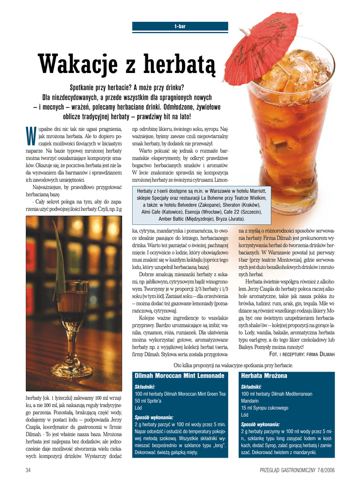 t–bar Wakacje z herbatą Spotkanie przy herbacie? A może przy drinku? Dla niezdecydowanych, a przede wszystkim dla spragnionych nowych — i mocnych — wrażeń, polecamy herbaciane drinki. Odmłodzone, żywiołowe oblicze tradycyjnej herbaty — prawdziwy hit na lato! W upalne dni nic tak nie ugasi pragnienia, jak mrożona herbata. Ale to dopiero początek możliwości tkwiących w liściastym naparze. Na bazie typowej mrożonej herbaty można tworzyć oszałamiające kompozycje smaków. Okazuje się, że poczciwa herbata jest nie lada wyzwaniem dla barmanów i sprawdzianem ich zawodowych umiejętności. Najważniejsze, by prawidłowo przygotować herbacianą bazę. - Cały sekret polega na tym, aby do zaparzenia użyć podwójnej ilości herbaty. Czyli, np. 2g np. odrobinę likieru, świeżego soku, syropu. Najważniejsze, byśmy zawsze czuli niepowtarzalny smak herbaty, by dodatek nie przeważył. Warto pokusić się jednak o rozmaite barmańskie eksperymenty, by odkryć prawdziwe bogactwo herbacianych smaków i aromatów. W lecie znakomicie sprawdzi się kompozycja mrożonej herbaty ze świeżymi cytrusami. LimonHerbaty z t-serii dostępne są m.in. w Warszawie w hotelu Marriott, sklepie Specjały oraz restauracji La Boheme przy Teatrze Wielkim, a także: w hotelu Belvedere (Zakopane), Sheraton (Kraków), Almi Cafe (Katowice), Esencja (Wrocław), Cafe 22 (Szczecin), Amber Baltic (Międzyzdroje), Bryza (Jurata). ka, cytryna, mandarynka i pomarańcza, to owoce idealnie pasujące do letniego, herbacianego drinka. Warto też pamiętać o świeżej, pachnącej mięcie. I oczywiście o lodzie, który obowiązkowo musi znaleźć się w każdym koktajlu (oprócz tego lodu, który uzupełnił herbacianą bazę). Dobrze smakują mieszanki herbaty z sokami, np. jabłkowym, cytrynowym bądź winogronowym. Tworzymy je w proporcji: 2/3 herbaty i 1/3 soku (w tym lód). Zamiast soku — dla orzeźwienia — można dodać też gazowane lemoniady (pomarańczową, cytrynową). Kolejne ważne ingrediencje to wszelakie przyprawy. Bardzo urozmaicające są imbir, wanilia, cynamon, róża, rumianek. Dla ułatwienia można wykorzystać gotowe, aromatyzowane herbaty np. z wyjątkowej kolekcji herbat t-seria, firmy Dilmah. Stylowa seria została przygotowa- na z myślą o różnorodności sposobów serwowania herbaty. Firma Dilmah jest prekursorem wykorzystywania herbat do tworzenia drinków herbacianych. W Warszawie powstał już pierwszy t-bar (przy teatrze Montownia), gdzie serwowanych jest dużo bezalkoholowych drinków imrożonych herbat. Herbata świetnie współgra również z alkoholem. Jerzy Czapla do herbaty poleca raczej alkohole aromatyczne, takie jak nasza polska żubrówka, tudzież: rum, arak, gin, tequila. Mile widziane są również wszelkiego rodzaju likiery. Mogą być one świetnym uzupełnieniem herbacianych shake’ów — kolejnej propozycji na gorące lato. Lody, wanilia, bakalie, aromatyczna herbata typu earl-grey, a do tego likier czekoladowy lub Baileys. Pomysły można mnożyć! FOT. I RECEPTURY: FIRMA DILMAH Oto kilka propozycji na wakacyjne spotkania przy herbacie. herbaty (ok. 1 łyżeczki) zalewamy 100 ml wrzątku, a nie 200 ml, jak nakazują reguły tradycyjnego parzenia. Pozostałą, brakującą część wody, dodajemy w postaci lodu — podpowiada Jerzy Czapla, koordynator ds. gastronomii w firmie Dilmah. - To jest właśnie nasza baza. Mrożona herbata jest najlepsza bez dodatków, ale jednocześnie daje możliwość stworzenia wielu ciekawych kompozycji drinków. Wystarczy dodać 34 Dilmah Moroccan Mint Lemonade Herbata Mrożona Składniki: 100 ml herbaty Dilmah Moroccan Mint Green Tea 50 ml Sprite’a Lód Składniki: 100 ml herbaty Dilmah Mediterranean Mandarin 15 ml Syropu cukrowego Lód Sposób wykonania: 2 g herbaty parzyć w 100 ml wody przez 5 min. Napar odcedzić i ostudzić do temperatury pokojowej metodą szokową. Wszystkie składniki wymieszać bezpośrednio w szklance typu „long”. Dekorować świeżą gałązką mięty. Sposób wykonania: 2 g herbaty parzymy w 100 ml wody przez 5 min., szklankę typu long zasypać lodem w kostkach, dodać Syrop, zalać gorącą herbatą i zamieszać. Dekorować twistem z mandarynki. PRZEGLĄD GASTRONOMICZNY 7-8/2006