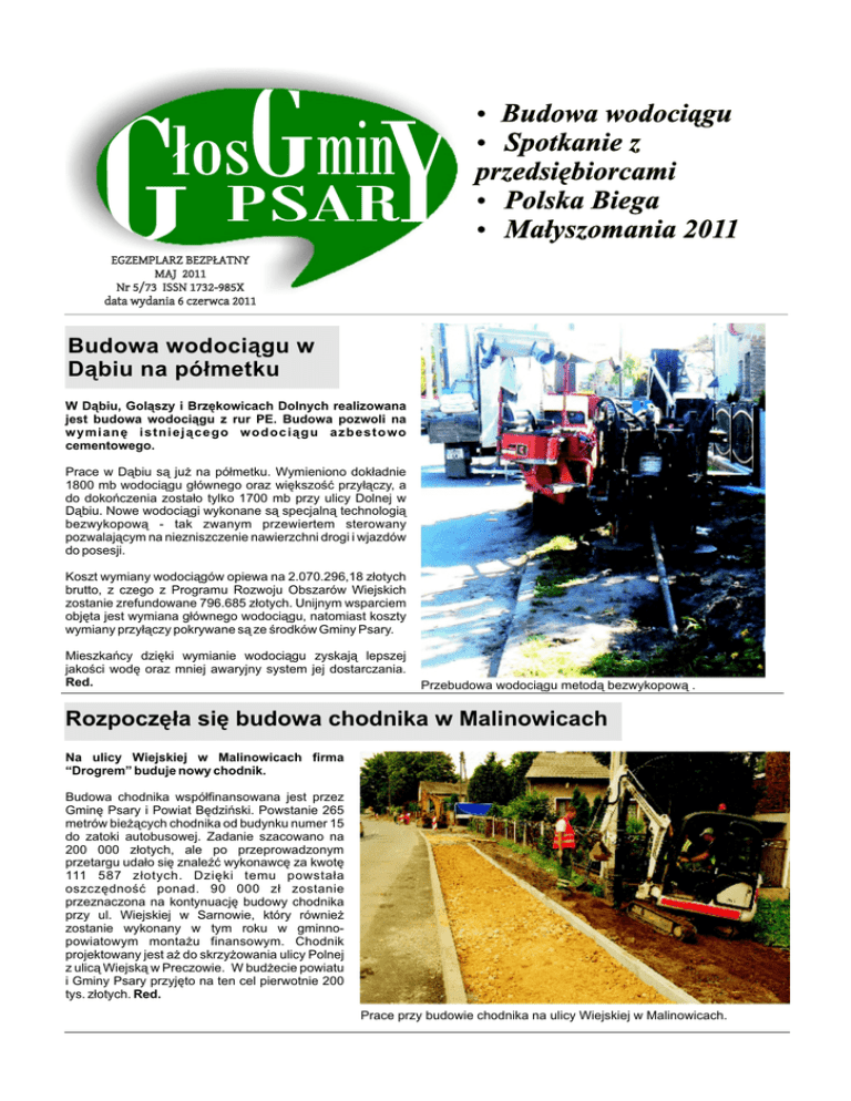 Budowa wodociągu Spotkanie z przedsiębiorcami Polska Biega Małyszomania 2011 EGZEMPLARZ BEZPŁATNY MAJ 2011 Nr 5/73 ISSN 1732-985X data wydania 6 czerwca 2011 Budowa wodociągu w Dąbiu na półmetku W Dąbiu, Goląszy i Brzękowicach Dolnych realizowana jest budowa wodociągu z rur PE. Budowa pozwoli na wymianę istniejącego wodociągu azbestowo cementowego. Prace w Dąbiu są już na półmetku. Wymieniono dokładnie 1800 mb wodociągu głównego oraz większość przyłączy, a do dokończenia zostało tylko 1700 mb przy ulicy Dolnej w Dąbiu. Nowe wodociągi wykonane są specjalną technologią bezwykopową - tak zwanym przewiertem sterowany pozwalającym na niezniszczenie nawierzchni drogi i wjazdów do posesji. Koszt wymiany wodociągów opiewa na 2.070.296,18 złotych brutto, z czego z Programu Rozwoju Obszarów Wiejskich zostanie zrefundowane 796.685 złotych. Unijnym wsparciem objęta jest wymiana głównego wodociągu, natomiast koszty wymiany przyłączy pokrywane są ze środków Gminy Psary. Mieszkańcy dzięki wymianie wodociągu zyskają lepszej jakości wodę oraz mniej awaryjny system jej dostarczania. Red. Przebudowa wodociągu metodą bezwykopową . Rozpoczęła się budowa chodnika w Malinowicach Na ulicy Wiejskiej w Malinowicach firma “Drogrem” buduje nowy chodnik. Budowa chodnika współfinansowana jest przez Gminę Psary i Powiat Będziński. Powstanie 265 metrów bieżących chodnika od budynku numer 15 do zatoki autobusowej. Zadanie szacowano na 200 000 złotych, ale po przeprowadzonym przetargu udało się znaleźć wykonawcę za kwotę 111 587 złotych. Dzięki temu powstała oszczędność ponad. 90 000 zł zostanie przeznaczona na kontynuację budowy chodnika przy ul. Wiejskiej w Sarnowie, który również zostanie wykonany w tym roku w gminnopowiatowym montażu finansowym. Chodnik projektowany jest aż do skrzyżowania ulicy Polnej z ulicą Wiejską w Preczowie. W budżecie powiatu i Gminy Psary przyjęto na ten cel pierwotnie 200 tys. złotych. Red. Prace przy budowie chodnika na ulicy Wiejskiej w Malinowicach. Wydarzenia Gminni samorządowcy spotkali się z przedsiębiorcami 12 maja 2011 odbyło się spotkanie dotyczące współpracy gminnego samorządu z przedsiębiorcami. Zorganizowane przez samorząd gminny oraz Agencję Rozwoju Lokalnego S.A. z Sosnowca. Do Ośrodka Kultury w Sarnowie przyjechali zainteresowani spotkaniem przedsiębiorcy z gminy oraz osoby, które chciałyby prowadzić firmy na naszym terenie. Wszystkich zebranych przywitał Wójt Gminy Psary Tomasz Sadłoń, który przedstawił ofertę inwestycyjną gminy Psary oraz możliwości współpracy gminnego samorządu z przedsiębiorcami. - Aktualnie ogłosiliśmy przetarg na sprzedaż 8 działek budowlanych w Górze Siewierskiej na tzw. Osiedlu Czerwony Kamień oraz zabudowaną działkę w Malinowicach. – mówi wójt gminy Psary Tomasz Sadłoń. – Jednak nasza oferta to także niewykorzystywane budynki, przedstawiliśmy je przedsiębiorcom i jesteśmy otwarci na ich propozycje dotyczące zaadaptowania ich na cele publiczne i biznesowe. W dalszej części spotkania Prezes ARL S.A. Jan Szot przedstawił o f e r t ę a g e n c j i d l a p r z e d s i ę b i o r c ó w, a R e n a t a Kasprzyk–Jarmołowicz zaprezentowała możliwości dofinansowania rozwoju mikro, małych i średnich przedsiębiorstw w ramach Funduszy Pożyczkowych i Funduszy Poręczeniowych prowadzonych przez ARL S.A. Następnie o unijnych dofinansowaniach dla - mikroprzesiębiorstw z programu Rozwoju Obszarów Wiejskich na lata 2007-2013 mówił Henryk Kolasa z Agencji Restrukturyzacji i Modernizacji Rolnictwa S.A. w Częstochowie oraz Jerzy Jóźwik z Lokalnej Grupy Działania “Brynica to nie Granica”. Ostatnie wystąpienie dotyczyło korzyści zrzeszania się przedsiębiorców. Przedstawiły je Anna Jordyga i Magdalena Trojak z grupy BNI Polska. Grupa BNI jest biznesową i referencyjną organizacją w ramach, której w ustalony dzień tygodnia na śniadaniu biznesowym spotykają się przedsiębiorcy z różnych branż i wymieniają się kontaktami do siebie oraz firm, z którymi współpracują. Wójt przedstawia ofertę inwestycyjną gminy. Przedsiębiorcy na spotkaniu w Ośrodku Kultury w Sarnowie. Przebudowa ulicy Granicznej w toku Prace na ulicy Granicznej Strzyżowice - Psary trwają, położony już został asfalt na części ulicy biegnącej od skrzyżowania z drogą drogą wojewódzką 913 do ulicy Belnej. Obecnie trwa budowa chodnika i wjazdów na posesję. Przebudowa drugiej części ulicy, od skrzyżowania z DW 913 do granicy z Wojkowicami, potrwa najpóźniej do końca września. Red. Prace remontowe na ulicy Granicznej. Wójt Gminy Psary działając na podstawie art.35 ust.1 ustawy z dnia 21 sierpnia 1997 r. o gospodarce nieruchomościami informuje, że na tablicy ogłoszeń w siedzibie Urzędu Gminy w Psarach ul.Malinowicka 4 w dniach od 06.06.2011r. do 26.06.2011r. zostanie wywieszony do publicznej wiadomości wykaz nieruchomości przeznaczonych do sprzedaży obejmujący : - nieruchomość ozn. nr 157/1 o pow. 0,4449 ha, k.m.2, zabudowaną budynkiem byłej szkoły podstawowej w Goląszy Górnej Wykaz zostanie zamieszczony również w internecie w Biuletynie Informacji Publicznej. Wydarzenia Kontynuujemy refundację przydomowych oczyszczalni ścieków Eko Gmina jest roboczym tytułem działań proekologicznych na terenie gminy. W swoich założeniach mają one dotyczyć pozytywnych dla środowiska naturalnego, a więc i dla mieszkańców rozwiązań technologicznych w gospodarstwach domowych. Pierwszym realizowanym kierunkiem programu Eko Gmina jest gospodarka wodno – ściekowa. W ramach „Programu budowy przydomowych oczyszczalni ścieków na terenie Gminy Psary” mieszkańcy, którzy złożyli Deklarację udziału w „ Programie budowy przydomowych oczyszczalni ścieków na terenie Gminy Psary” mogą się ubiegać o jednorazowe dofinansowanie do budowy przydomowych oczyszczalni ściek