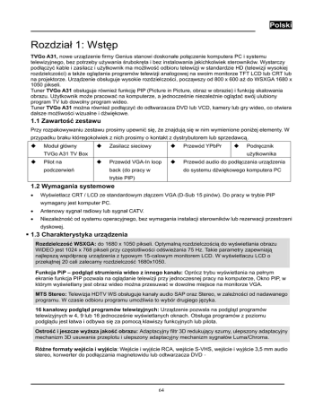 Polski Rozdział 1: Wstęp TVGo A31, nowe urządzenie firmy Genius stanowi doskonałe połączenie komputera PC i systemu telewizyjnego, bez potrzeby używania śrubokręta i bez instalowania jakichkolwiek sterowników. Wystarczy podłączyć kable i zasilacz i użytkownik ma możliwość odbioru telewizji w standardzie HD (telewizji wysokiej rozdzielczości) a także oglądania programów telewizji analogowej na swoim monitorze TFT LCD lub CRT lub na projektorze. Urządzenie obsługuje wysokie rozdzielczości, począwszy od 800 x 600 aż do WSXGA 1680 x 1050 pikseli. Tuner TVGo A31 obsługuje również funkcję PIP (Picture in Picture, obraz w obrazie) i funkcję skalowania obrazu. Użytkownik może pracować na komputerze, a jednocześnie niezależnie oglądać swój ulubiony program TV lub dowolny program wideo. Tuner TVGo A31 można również podłączyć do odtwarzacza DVD lub VCD, kamery lub gry wideo, co otwiera dalsze możliwości wizualne i dźwiękowe. 1.1 Zawartość zestawu Przy rozpakowywaniu zestawu prosimy upewnić się, że znajdują się w nim wymienione poniżej elementy. W przypadku braku któregokolwiek z nich prosimy o kontakt z dystrybutorem lub sprzedawcą. Moduł główny Zasilacz sieciowy TVGo A31 TV Box Pilot na podczerwień Przewód YPbPr Podręcznik użytkownika Przewód VGA-In loop back (do pracy w Przewód audio do podłączania urządzenia do systemu dźwiękowego komputera PC trybie PIP) 1.2 Wymagania systemowe • Wyświetlacz CRT / LCD ze standardowym złączem VGA (D-Sub 15 pinów). Do pracy w trybie PIP wymagany jest komputer PC. • Antenowy sygnał radiowy lub sygnał CATV. • Niezależność od systemu operacyjnego, bez wymagania instalacji sterowników lub rezerwacji przestrzeni dyskowej. 1.3 Charakterystyka urządzenia Rozdzielczość WSXGA: do 1680 x 1050 pikseli. Optymalną rozdzielczością do wyświetlania obrazu WIDEO jest 1024 x 768 pikseli przy częstotliwości odświeżania 75 Hz. Takie parametry zapewniają najlepszą współpracę urządzenia z typowym 15-calowym monitorem LCD. W wyświetlaczu LCD o przekątnej 20 cali zalecamy rozdzielczość 1680x1050. Funkcja PiP – podgląd strumienia wideo z innego kanału: Oprócz trybu wyświetlania na pełnym ekranie funkcja PIP pozwala na oglądanie telewizji przy jednoczesnej pracy na komputerze, Okno PIP, w którym wyświetlany jest obraz wideo można przesuwać w dowolne miejsce na monitorze VGA. MTS Stereo: Telewizja HDTV WS obsługuje kanały audio SAP oraz Stereo, w zależności od nadawanego programu. W czasie odbioru programu umożliwia to wybór drugiego języka. 16 kanałowy podgląd programów telewizyjnych: Urządzenie pozwala na podgląd programów telewizyjnych w 4, 9 lub 16 jednocześnie wyświetlanych oknach. Obsługa programów z poziomu podglądu jest łatwa i odbywa się za pomocą klawiszy funkcyjnych lub pilota. Ostrość i jeszcze wyższa jakość obrazu: Adaptacyjny filtr 3D redukujący szumy, ulepszony adaptacyjny mechanizm 3D usuwania przeplotu i ulepszony adaptacyjny mechanizm sygnałów Luma/Chroma. Różne formaty wejścia i wyjścia: Wejście i wyjście RCA, wejście S-VHS, wejście i wyjście 3,5 mm audio stereo, konwerter do podłączania magnetowidu lub odtwarzacza DVD。 64 Polski Rozdział 2: Rozpoczęcie pracy z urządzeniem 2.1 Złącza panelu tylnego Najbardziej typowy schemat wykonania podłączeń pokazany jest poniżej; prosimy tak właśnie podłączyć wszystkie kable pamiętając o tym, by wszystkie urządzenia były w czasie podłączania wyłączone. ZŁĄCZE DC In VGA Out VGA In RODZAJ 5mm, INT+, EXT15-pinowe gniazdo D-Sub 8-pinowe gniazdo Mini DIN Audio Out 3,5 mm gniazdo stereo Video Out Gniazdo RCA OPIS Zasilacz sieciowy, wejście zasilania (5V, 2 A)。 Główne wyjście wideo. Wyjście do podłączenia monitora CRT/LCD. Przewód VGA-In loop back: Drugi koniec tego przewodu należy podłączyć do 15-pinowego gniazda VGA D-sub w komputerze. Wyjście sygnału audio: prosimy podłączyć do systemu dźwiękowego komputera (wyjście Line-in karty dźwiękowej). Po włożeniu wtyku do tego gniazda głośnik wbudowany w urządzeniu zostanie automatycznie dezaktywowany. Wyjście wideo. Służy do podłączania wejścia wideo wyświetlacza. Gniazdo anteny Złącze sygnału TV lub CATV。 TV 2.2 Złącza panelu umieszczonego po prawej stronie urządzenia RF IN ZŁĄCZE YPbPr / S-Video In RODZAJ 7-pinowe gniazdo Min Din Video In Gniazdo RCA Audio In Gniazdo RCA audio OPIS Zewnętrzne wejście wideo typu YCbCr / S-VHS, do podłączania odtwarzacza DVD, magnetowidu lub kamery wideo. Zewnętrzne kompozytowe wejście wideo, do podłączania odtwarzacza DVD, magnetowidu lub kamery wideo. Gniazdo RCA audio do podłączania zewnętrznego źródła sygnału wejściowego audio 2.3 Podłączanie przewodów Poza zasilaniem nie ma specjalnych wymagań dotyczących kolejności wykonywania podłączeń, jednak usilnie zaleca się, aby zasilacz sieciowy podłączyć dopiero po dokonaniu wszystkich innych podłączeń. 65 Polski *W przypadku komputerów Macintosh, złącza lub wymagania dotyczące okablowania mogą być inne; zestaw nie zawiera tego typu akcesoriów i w razie potrzeby należy się w nie zaopatrzyć w sklepie specjalizującym się w dostawie elementów przeznaczonych do komputerów Macintosh. 2.3.1 Podłączanie przewodów do korzystania z funkcji PIP: 2.3.2 Podłączanie przewodów do oglądania telewizji na monitorze bez komputera: 2.3.3 Podłączanie zewnętrznego wejścia audio/wideo: Podłączając HDTV WS do zewnętrznego urządzenia audio/wideo, takiego jak odtwarzacz DVD, magnetowid lub kamera wideo (co pozwoli w pełni korzystać z wysokiej jakości zestawu audio/wideo), należy wyłączyć zasilanie i wykonać podłączenia tak jak pokazano poniżej. 66 Polski Rozdział 3: Korzystanie z tunera 3.1 Cztery kroki, które pozwolą obejrzeć program telewizyjny na monitorze LCD/CRT lub na projektorze. Prosimy wziąć do ręki pilota. Aby rozpocząć