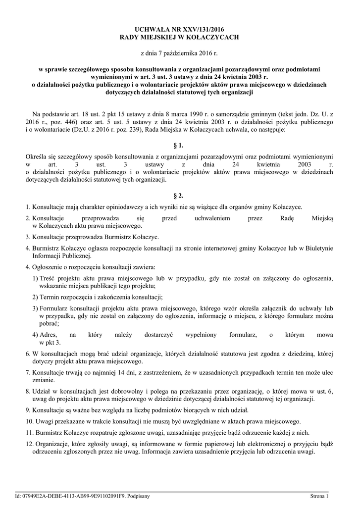 UCHWAŁA NR XXV/131/2016 RADY MIEJSKIEJ W KOŁACZYCACH z dnia 7 października 2016 r. w sprawie szczegółowego sposobu konsultowania z organizacjami pozarządowymi oraz podmiotami wymienionymi w art. 3 ust. 3 ustawy z dnia 24 kwietnia 2003 r. o działalności pożytku publicznego i o wolontariacie projektów aktów prawa miejscowego w dziedzinach dotyczących działalności statutowej tych organizacji Na podstawie art. 18 ust. 2 pkt 15 ustawy z dnia 8 marca 1990 r. o samorządzie gminnym (tekst jedn. Dz. U. z 2016 r., poz. 446) oraz art. 5 ust. 5 ustawy z dnia 24 kwietnia 2003 r. o działalności pożytku publicznego i o wolontariacie (Dz.U. z 2016 r. poz. 239), Rada Miejska w Kołaczycach uchwala, co następuje: § 1. Określa się szczegółowy sposób konsultowania z organizacjami pozarządowymi oraz podmiotami wymienionymi w art. 3 ust. 3 ustawy z dnia 24 kwietnia 2003 r. o działalności pożytku publicznego i o wolontariacie projektów aktów prawa miejscowego w dziedzinach dotyczących działalności statutowej tych organizacji. § 2. 1. Konsultacje mają charakter opiniodawczy a ich wyniki nie są wiążące dla organów gminy Kołaczyce. 2. Konsultacje przeprowadza się w Kołaczycach aktu prawa miejscowego. przed uchwaleniem przez Radę Miejską 3. Konsultacje przeprowadza Burmistrz Kołaczyc. 4. Burmistrz Kołaczyc ogłasza rozpoczęcie konsultacji na stronie internetowej gminy Kołaczyce lub w Biuletynie Informacji Publicznej. 4. Ogłoszenie o rozpoczęciu konsultacji zawiera: 1) Treść projektu aktu prawa miejscowego lub w przypadku, gdy nie został on załączony do ogłoszenia, wskazanie miejsca publikacji tego projektu; 2) Termin rozpoczęcia i zakończenia konsultacji; 3) Formularz konsultacji projektu aktu prawa miejscowego, którego wzór określa załącznik do uchwały lub w przypadku, gdy nie został on załączony do ogłoszenia, informację o miejscu, z którego formularz można pobrać; 4) Adres, w pkt 3. na który należy dostarczyć wypełniony formularz, o którym mowa 6. W konsultacjach mogą brać udział organizacje, których działalność statutowa jest zgodna z dziedziną, której dotyczy projekt aktu prawa miejscowego. 7. Konsultacje trwają co najmniej 14 dni, z zastrzeżeniem, że w uzasadnionych przypadkach termin ten może ulec zmianie. 8. Udział w konsultacjach jest dobrowolny i polega na przekazaniu przez organizację, o której mowa w ust. 6, uwag do projektu aktu prawa miejscowego w dziedzinie dotyczącej działalności statutowej tej organizacji. 9. Konsultacje są ważne bez względu na liczbę podmiotów biorących w nich udział. 10. Uwagi przekazane w trakcie konsultacji nie muszą być uwzględniane w aktach prawa miejscowego. 11. Burmistrz Kołaczyc rozpatruje zgłoszone uwagi, uzasadniając przyjęcie bądź odrzucenie każdej z nich. 12. Organizacje, które zgłosiły uwagi, są informowane w formie papierowej lub elektronicznej o przyjęciu bądź odrzuceniu zgłoszonych przez nie uwag. Informacja zawiera uzasadnienie przyjęcia lub odrzucenia uwagi. Id: 07949E2A-DEBE-4113-AB99-9E91102091F9. Podpisany Strona 1 13. Z przeprowadzanych konsultacji sporządzane jest sprawozdanie, zawierające w szczególności następujące informacje: 1) Liczbę podmiotów biorących udział w konsultacjach; 2) Wykaz zgłoszonych uwag; 3) Uzasadnienia przyjęcia bądź odrzucenia zgłoszonych uwag. § 3. Wykonanie uchwały powierza się Burmistrzowi Kołaczyc. § 4. Uchwała wchodzi w życie po upływie 14 dni od daty jej opublikowania w Dzienniku Urzędowym Województwa Podkarpackiego. Przewodniczący Rady Miejskiej w Kołaczycach Stanisław Dunaj Id: 07949E2A-DEBE-4113-AB99-9E91102091F9. Podpisany Strona 2 Załącznik do Uchwały Nr XXV/131/2016 Rady Miejskiej w Kołaczycach z dnia 7 października 2016 r. FORMULARZ KONSULTACJI projektu aktu prawa miejscowego Lp. Aktualny zapis w projekcie Proponowane zmiany Uzasadnienie 1. 2. 3. Inne uwagi: Dane uczestnika konsultacji: Nazwa organizacji Adres organizacji Numer telefonu / adres e-mail organizacji Imię i nazwisko osoby do kontaktu Numer telefonu, e-mail osoby do kontaktu Data wypełnienia i podpis osoby wypełniającej formularz Id: 07949E2A-DEBE-4113-AB99-9E91102091F9. Podpisany Strona 1