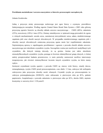 Powikłania metaboliczne i sercowo-naczyniowe u biorców przeszczepów narządowych. Jolanta Gozdowska Jedną z przyczyn utraty przeszczepu nerkowego jest zgon biorcy z czynnym, prawidłowo funkcjonującym narządem. Według raportu Unated States Renal Data System z 2003 roku główną przyczyną zgonów biorców są choroby układu sercowo naczyniowego – ChSN (40%), zakażenia (25%), nowotwory (10%) i inne (25%). Zmiany miażdżycowe w tętnicach mogą prowadzić do zgonu w różnych mechanizmach: zawału serca, zastoinowej niewydolności serca, udaru, niedokrwiennego zapalenia jelit oraz chorób naczyń obwodowych. W przypadku niedokrwiennego zapalenia jelit i choroby naczyń obwodowych ostateczną przyczyną zgonu może być współistnienie zakażenia. Najistotniejszą sprawą w zapobieganiu powikłaniom i zgonom z powodu chorób układu sercowonaczyniowego jest określenie czynników ryzyka. Szczególnie ważna jest możliwość modyfikacji tych czynników, dla których istnieją dowody, że są groźne. Istotne jest także określenie niemodyfikowalnych czynników ryzyka, pomaga to bowiem zidentyfikować grupę chorych, w której należy przeprowadzać badania przesiewowe, w razie potrzeby zastosować możliwe interwencje terapeutyczne, jak również zintensyfikować leczenie innych czynników ryzyka, na które mamy wpływ. Istotnymi czynnikami ryzyka zgonów z powodu ChSN są: starszy wiek biorcy, zmarły dawca, retransplantacja, ryzyko ChSN przed przeszczepieniem, czas dializ >3 lata, cukrzyca lub nefropatia cukrzycowa jako przyczyna choroby nerek własnych. Czynniki ryzyka po przeszczepieniu to: cukrzyca potransplantacyjna (NODAT), ostre odrzucanie w pierwszym roku po KTx, palenie papierosów, hospitalizacje z powodu zakażenia w pierwszym roku po KTx, dawka GKS, stężenie kreatyniny w surowicy krwi >130 µmol/l. Zgony sercowo-naczyniowe u biorców nerki umieralność roczna (%) 10 1 0.1 biorca nerki ogólna populacja 0.01 25–34 35–44 45–54 55–64 65–74 75–84 wiek (lata) Foley, Am. J. Kidney Dis. 1998 Wykres nr 1. Przewlekła choroba nerek, szczególnie w zaawansowanych stadiach (III A, III B, IV, V) jest niezależnym czynnikiem ryzyka miażdżycy. Szczególnie zauważalne jest to u młodych biorców w porównaniu do populacji ogólnej w tym samym przedziale wiekowym. Znane są przypadki zaawansowanej choroby naczyń wieńcowych u biorców nerki w przedziale 25- 35 lat. Im dłużej chory jest dializowany, tym ryzyko to rośnie. Dlatego też ważne jest kwalifikowanie chorych do przeszczepienia już w okresie przeddializacyjnym (pre-emptive). Przeszczepienie nerki metodą przedłużającą życie Względne ryzyko zgonu u biorców I TPN od dawcy zmarłego (n=23 275) w porównaniu z chorymi na aktywnej liście (n=46 164) Względne ryzyko zgonu 4.00 2.84 Ryzyko jednakowe Przeżycie jednakowe 1.00 0.32 0.25 106 183 244 365 548 Dni od przeszczepienia Wolfe, N. Engl. J. Med. 1999 Wykres nr 2. W ciągu jednego roku oczekiwania na przeszczepienie umiera około 20% chorych znajdujących się na Krajowej Liście Oczekujących (KLO) na przeszczepienie. Czynniki ryzyka chorób układu sercowo-naczyniowego u pacjentów po przeszczepieniu Tabela nr 1. Choroby układu sercowo-naczyniowego przed przeszczepieniem Tabela nr 2. Tabela nr 3. Zaburzenia gospodarki węglowodanowej Cukrzyca potransplantacyjna (Post transplant diabetes mellitus – PTDM) (New-onset diabetes mellitus – NODAT) Cukrzyca nowo powstała po zabiegu przeszczepienia (New-onset diabetes mellitus – NODAT) znacznie zwiększa ryzyko wystąpienia chorób układu sercowo-naczyniowego, niewydolności przeszczepu, a nawet zgonu chorego. Wczesne jej wykrycie i niezwłoczne wdrożenie leczenia sprawia, że możemy zmniejszyć ryzyko powikłań wywołanych zaburzeniami gospodarki węglowodanowej. NODAT jest skutkiem zarówno nieprawidłowej produkcji insuliny jak i wzrostu insulinooporności. Definicja Historyczna nazwa PTDM (Post transplant diabetes mellitus) była definiowana jako potrzeba zastosowania leków hipoglikemizujacych po zabiegu przeszczepienia, nie krócej niż 30 dni. Definicja PTDM niedoszacowywała częstości występowania i rozpowszechnienia zaburzeń gospodarki węglowodanowej, szczególnie u chorych z asymptomatyczną hiperglikemią. w 2003 roku WHO (World Health Organisation) i ADA (American Diabetes Assotiation) udoskonaliły tę definicję. Do rozpoznania NODAT (New-onset diabetes mellitus) wykorzystuje się trzy kryteria: objawy cukrzycy współistniejące z przygodnym pomiarem glukozy (PG) ≥ 200 mg/dl (11,1 mmol/l) lub glikemią na czczo (FPG) ≥ 126 mg/dl (7,0 mmol/l) lub stężeniem glukozy wyższym niż 200 mg/dl (11,1 mmol/l) dwie godziny po doustnym obciążeniu glukozą (OGTT). OGTT zdefiniowany przez WHO i oznacza obciążenie 75 h glukozy rozpuszczonej w wodzie. W 2009 roku wytyczne KDIGO (Kidney Disease: Improving Global Outcomes) dodały HbA1C jako kryterium diagnostyczne NODAT. Częstość występowania Częstość występowania NODAT szacowana jest na 2-50% w zależności od przyjmowanych kryteriów diagnostycznych, czasu obserwacji, obecnych czynników ryzyka oraz rodzaju zastosowanych leków immunosupresyjnych. Dane z USRDS mówią, że u dorosłych biorców w 36 miesiącu po przeszczepieniu ryzyko to wynosi 42%, w porównaniu do biorców pediatrycznych (13%). Czynniki ryzyka NODAT U biorców nerki wyszczególniono wiele czynników predysponujących do wystąpienia NODAT: Wiek ≥ 40-45 lat Rasa Wywiad rodzinny występowania cukrzycy Wirusowe zapalenie wątroby typu C (HCV) Liczba niezgodnych antygenów zgodności tkankowej (HLA) Otyłość (BMI ≥ 30) „Jakość” przeszczepionego narządu Wystąpienie ostrego odrzucania Predyspozycje genetyczne Rodzaj zastosowanych leków immunosupresyjnych zastosowanych do prewencji lub leczenia ostrego odrzucania Infekcja wirusem cytomegalii (CMV) Wielotorbielowatość nerek typu dorosłych (ADPKD) Współistnienie innych „składników