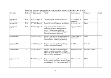 Szkolny zestaw programów nauczania na rok szkolny 2016/2017 Przedmiot Poziom Nr dopuszczenia Tytuł Autor/autorzy Wydawca język polski PiR JP/VILO/14 poz. 1 Zrozumieć tekst - zrozumieć człowieka WSiP język polski Pi R JP/VILO/12 poz. 1 Przeszłość to dziś. Literatura-język-kultura D. Chemperek, A. Kalbarczyk K. Mrowcewicz język polski PiR JP/VILO/12 poz. 2 Język polski, kształcenie kulturowoliterackie i językowe "Odkrywamy na nowo". Program nauczania języka polskiego w liceum ogólnokształcącym zakres podstawowy i roszerzony język angielski JA/VILO/14 poz. 1 Program nauczania języka angielskiego dla J. Sosnowska, M. liceum ogólnokształcącego i technikum w Wieruszewska oparciu o nową podstawę programową Oxford język angielski JA/VILO/12 poz. 1 Program nauczania języka angielskiego w szkołach ponadgimnazjalnych Nowa Era JA/VILO/16 poz.1 Program nauczania języka angielskiego Milada Krajewska zgodny z podstawą programową (Rozp. MEN z dn. 27.08.2012) IV etap edukacyjny - IV.1R (zakres rozszerzony) Macmillan Polska JN/VILO/14 poz. 1 Program nauczania języka niemieckiego w P. Piszczatowski liceach ogólnokształcących i technikach dla początkujących IV.0 i kontynuujących IV.1 WSiP język angielski język niemiecki R 1 Stentor Krystyna Rutyńska H. Tyliba Uwagi Przedmiot Poziom Nr dopuszczenia Tytuł Autor/autorzy Wydawca WSiP język niemiecki JN/VILO/13 poz. 1 Program nauczania języka niemieckiego w liceum ogólnokształcącym i technikum. Kurs podstawowy i rozszerzony dla kontynuujących naukę na poziomie IV.1, IV.1R A. Jarząbek, D. Koper język niemiecki JN/VILO/12 poz. 1 Program nauczania języka niemieckiego w liceum ogólnokształcącycm i technikum. IV etap edukacyjny. Pozdstawa programowa IV.0 i IV.1 E. Muszyńska język niemiecki JN/VILO/12 poz. 1 Program nauczania języka niemieckiego w liceum ogólnokształcącycm i technikum. Kurs podstawowy i rozszerzony dla kontynuujących naukę na poziomie IV.1 A. Jarząbek, D. Koper język francuski JF/VILO/12 poz. 1 Program nauczania języka francuskiego w szkołąch ponadgimnazjalnych. Kurs podstawowy R. Kucharczyk język łaciński JŁ/VILO/12 poz. 1 Język łaciński. Program trzyletniego liceum E. Truszkowskaogólnokształcącego dla klas z Szwedek przedmiotami wiodącymi: biologia, fizyka, chemia, język polski, języki obce, historia w wymiarze 1 godzina tygodniowo 2 WSZPWN Uwagi Przedmiot Poziom Nr dopuszczenia Tytuł Autor/autorzy Wydawca historia R HI/VILO/14 poz. 1 Ciekawi świata. Historia. Program nauczania dla szkół ponadgimnazjalnych. Poziom rozszerzony C. Tulin Operon historia R HI/VILO/13 poz. 1 Program nauczania "Zrozumieć przeszłość" R. Śniegocki dla zakresu rozszerzonego Nowa Era historia P HI/VILO/12 poz. 2 Poznać przeszłość. Wiek XX. Zakres M. Jekiel podstawowy. Program nauczania do historii dla szkół ponadgimnazjalnych Nowa Era historia P HI/VILO/12 poz. 1 Historia. Po prostu. Program nauczania historii dla szkół ponadgimnazjalnych. Zakres podstawowy biologia R BI/VILO/13 poz. 1 biologia P BI/VILO/12 poz. 1 Biologia na czasie. Program nauczania U. Poziomek biologii w zakresie rozszerzonym Biologia na czasie. Program nauczania M. Kaczmarzyk biologii w zakresie podstawowym dla szkół ponadgimnazjalnych chemia R CH/VILO/13 poz. 1 To jest chemia. Program nauczania chemii w zakresie rozszerzonym dla liceum ogólnokształcącego i technikum M. Litwin, S. Styka- Nowa Era Wlazło chemia P CH/VILO/12 poz. 1 To jest chemia. Program nauczania chemii w zakresie podstawowym dla liceum ogólnokształcącego i technikum R. Hassa, A. Nowa Era Mrzigod, J. Mrzigod fizyka R FA/VILO/13 poz. 1 Program nauczania fizyki dla liceum ogólnokształcącego (kształcenie ogólne w zakresie rozszerzonym) A. Byczuk, K. Byczuk, Z. Suwald, S. Suwald 3 J. Smoleński WSiP Nowa Era Nowa Era Nowa Era Uwagi Przedmiot Poziom Nr dopuszczenia Tytuł Autor/autorzy Wydawca fizyka P FA/VILO/12 poz. 1 Fizyka. Po prostu. Program nauczania fizyki w szkołąch ponadgimnazjalnych w zakresie podstawowym L. Lehman, W. Polesiuk, I. Bronowicka WSiP geografia R GE/VILO/13 poz. 1 Program nauczania geografii dla szkół ponadgimnazjalnych WSZPWN/Nowa Era geografia P GE/VILO/12 poz. 1 Tylko geografia. Program nauczania geografii dla szkół ponadgimnazjalnych wiedza o społeczeństwie R WO/VILO/13 poz. 1 "W centrum uwagi" Zakres rozszerzony. Program nauczania dla liceum ogólnokształcącego i technikum J. Kop, M. Kucharska, E. Szkurłat J. Kop, M. Kucharska, E. Szkurłat M. Menz wiedza o społeczeństwie P WO/VILO/12 poz. 1 Program nauczania wiedzy o społeczeństwie dla szkół ponadgimnazjalnych. Zakres podstawowy. W centrum uwagi M. Menz wiedza o kutlurze WK/VILO/12 poz. 1 Człowiek - twórca kultury. Program nauczania wiedzy o kulturze w liceum ogólnokształcącym, liceum profilowanym i technikum Z. Majchrowski, K. Mrowcewicz, P. Sitarski, D. Szwarcman Stentor historia i społeczeństwo HIS/VILO/13 poz. 1 Poznać przeszłość. Program nauczania przedmiotu historia i społeczeństwo. Dziedzictwo epok. Liceum ogólnokształcące i technikum K. Panimasz Nowa Era historia i społeczeństwo HIS/VILO/13 poz. 2 Historia i społeczeństwo. Przedmiot uzupełniający dla liceum i technikum Matematyka. Program nauczania w liceach i technikach. Zakres rozszerzony P. Wasilewski, M. Wiktorowski M. Kurczab, E. Kurczab, E. Świda WSiP matematyka R MA/VILO/13 poz. 1 4 WSZPWN/Nowa Era Nowa Era Oficyna Edukacyjna K. Pazdro Uwagi Przedmiot Poziom Nr dopuszczenia Tytuł Autor/autorzy Wydawca matematyka P MA/VILO/12 poz. 1 Matematyka. Program nauczania w liceach i technikach. Zakres podstawowy M. Kurczab, E. Kurczab, E. Świda Oficyna Edukacyjna K. Pazdro informatyka R IN/VILO/13 poz. 1 Informatyka dla szkół ponadgimnazjalnych. G. Koba Zakres rozszerzony Migra informatyka P IN/VILO/12 poz. 1 Informatyka. Program nauczania dla szkół ponadgimnazjalnych zakres podstawowy A. Gawełek Operon przyroda PR/VILO/13 poz. 1 Program nauczania prz